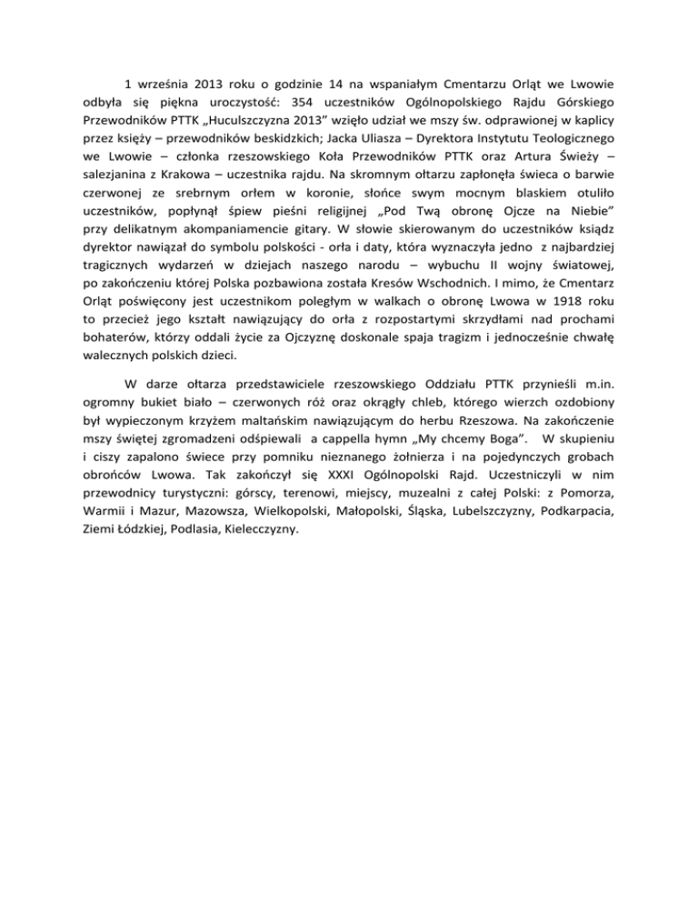 1 września 2013 roku o godzinie 14 na wspaniałym Cmentarzu Orląt we Lwowie odbyła się piękna uroczystość: 354 uczestników Ogólnopolskiego Rajdu Górskiego Przewodników PTTK „Huculszczyzna 2013” wzięło udział we mszy św. odprawionej w kaplicy przez księży – przewodników beskidzkich; Jacka Uliasza – Dyrektora Instytutu Teologicznego we Lwowie – członka rzeszowskiego Koła Przewodników PTTK oraz Artura Świeży – salezjanina z Krakowa – uczestnika rajdu. Na skromnym ołtarzu zapłonęła świeca o barwie czerwonej ze srebrnym orłem w koronie, słońce swym mocnym blaskiem otuliło uczestników, popłynął śpiew pieśni religijnej „Pod Twą obronę Ojcze na Niebie” przy delikatnym akompaniamencie gitary. W słowie skierowanym do uczestników ksiądz dyrektor nawiązał do symbolu polskości - orła i daty, która wyznaczyła jedno z najbardziej tragicznych wydarzeń w dziejach naszego narodu – wybuchu II wojny światowej, po zakończeniu której Polska pozbawiona została Kresów Wschodnich. I mimo, że Cmentarz Orląt poświęcony jest uczestnikom poległym w walkach o obronę Lwowa w 1918 roku to przecież jego kształt nawiązujący do orła z rozpostartymi skrzydłami nad prochami bohaterów, którzy oddali życie za Ojczyznę doskonale spaja tragizm i jednocześnie chwałę walecznych polskich dzieci. W darze ołtarza przedstawiciele rzeszowskiego Oddziału PTTK przynieśli m.in. ogromny bukiet biało – czerwonych róż oraz okrągły chleb, którego wierzch ozdobiony był wypieczonym krzyżem maltańskim nawiązującym do herbu Rzeszowa. Na zakończenie mszy świętej zgromadzeni odśpiewali a cappella hymn „My chcemy Boga”. W skupieniu i ciszy zapalono świece przy pomniku nieznanego żołnierza i na pojedynczych grobach obrońców Lwowa. Tak zakończył się XXXI Ogólnopolski Rajd. Uczestniczyli w nim przewodnicy turystyczni: górscy, terenowi, miejscy, muzealni z całej Polski: z Pomorza, Warmii i Mazur, Mazowsza, Wielkopolski, Małopolski, Śląska, Lubelszczyzny, Podkarpacia, Ziemi Łódzkiej, Podlasia, Kielecczyzny. Fot. Łukasz Biedka Rajd górski organizowany jest od 1983 roku z inicjatywy środowiska przewodników świętokrzyskich, które było organizatorem pierwszego rajdu. Rajd rokrocznie organizuje inny oddział czy koło PTTK. Tegoroczny rajd organizował Oddział PTTK w Rzeszowie oraz Koło Przewodników Terenowych i Beskidzkich przy Oddziale PTTK w Rzeszowie. Rzeszowscy działacze PTTK organizowali rajd po raz czwarty – poprzednie w latach 1987, 1998 i 2004. Tegoroczny rajd po raz pierwszy odbywał się w całości poza granicami kraju – na Kresach II Rzeczypospolitej – obecnie znajdujących się w granicach Ukrainy. Rajd odbywał się w Roku Przewodników Turystycznych ogłoszonych uchwałą Zarządu Głównego PTTK. Baza rajdu znajdowała się w Polanicy na Huculszczyźnie, w pięknej dolinie pomiędzy Gorganami, a Czarnohorą. Uczestnicy byli podzieleni na 8 grup (tras), w zależności od stopnia trudności wędrówek górskich. Były dwie grupy (trasy) autokarowe, które nie wędrowały po górach tylko przemieszczając się autokarami zwiedzały miejscowości i obiekty kresowe, w tym m.in. Stanisławów, Buczacz, Skałę Podolską, Kamieniec Podolski, Chocim, Okopy św. Trójcy, Kołomyję, Worochtę, Żabie, Jaremcze. Jedna trasa wędrowała z plecakiem, niestety z powodu dużych opadów deszczu nieco wcześniej zeszła do bazy w Polanicy, gdzie uczestnicy zostali zakwaterowani w hotelach. Grupy górskie zdobyły najwyższy szczyt Karpat Ukraińskich Howerlę leżącą w Czarnohorze, która ma 2061 m n.p.m. Jedna z grup była na szczycie Popa Iwana (2022 m n.p.m.), na którym prowadzone są prace przy odbudowie obserwatorium astronomicznego postawionego przez Polaków w latach 1936 – 1938. Część rajdowiczów dotarła do Przełęczy Legionów (przed I wojną światową nazywanej Przełęczą Rogodze Wielkie położonej na wysokości 1130 m n.p.m. w Gorganach), na której stoi metalowy krzyż postawiony tam w 1931 r. ( w miejsce poprzedniego, drewnianego, który stanął na przełęczy 28.10.1914 r.) z pamiątkową tablicą o treści: MŁODZIEŻY POLSKA PATRZ NA TEN KRZYŻ! LEGIONY POLSKIE DŹWIGNĘŁY GO WZWYŻ PRZECHODZĄC GÓRY LASY I WAŁY DO CIEBIE POLSKO I DLA TWEJ CHWAŁY! Fot. Przemysław Misiąg Krzyż upamiętnia niezwykły czyn żołnierzy polskiego legionu z jesieni 1914 r. tj. wybudowanie w ciągu 53 godzin siedmiokilometrowego odcinka traktu w bardzo trudnym terenie, zalesionym, pochyłym i stromym. Uczestnicy rajdu mieli więc możliwość zapoznania się z jednymi z najważniejszych i najpiękniejszych miejsc historycznie związanych z Polską i polskością. Miejscami tak bliskimi każdemu Polakowi a zwłaszcza uwrażliwionym na piękno i tradycje narodowe przewodnikom turystycznym. Uczestnicy rajdu mieli do dyspozycji siedem autokarów i jednego busa. Prowadzącymi trasy byli przewodnicy górscy beskidzcy z rzeszowskiego Koła Przewodników PTTK wspierani trójką przewodników ze Lwowa. Wieczorami odbywały się imprezy integracyjne, śpiewy przy gitarach, tańce przy muzyce zespołu ukraińskiego „Na Drabinie”. Był też wieczór przy kiełbasie z grilla. Jak na profesjonalnie przygotowany rajd w Biurze Rajdu zapewniono pomoc medyczną. Z opinii uczestników można wyciągnąć jednoznaczne wnioski: podziw i uznanie dla działaczy PTTK z Rzeszowa za zorganizowanie tak udanego, w tak pięknym miejscu i stosunkowo niedrogo olbrzymiego przedsięwzięcia. Jak podkreślili obecni na rajdzie członkowie Zarządu Głównego PTTK i Krajowego Samorządu Przewodnickiego, Rzeszów wysoko postawił poprzeczkę a jako największy (najliczniejszy) Oddział PTTK w kraju, wyznacza standardy i daje przykład innym oddziałom i kołom PTTK w całym kraju. Tegoroczny rajd, który odbył się w terminie 28 sierpnia – 1 września 2013 r. organizowano w 140 rocznicę utworzenia Towarzystwa Tatrzański