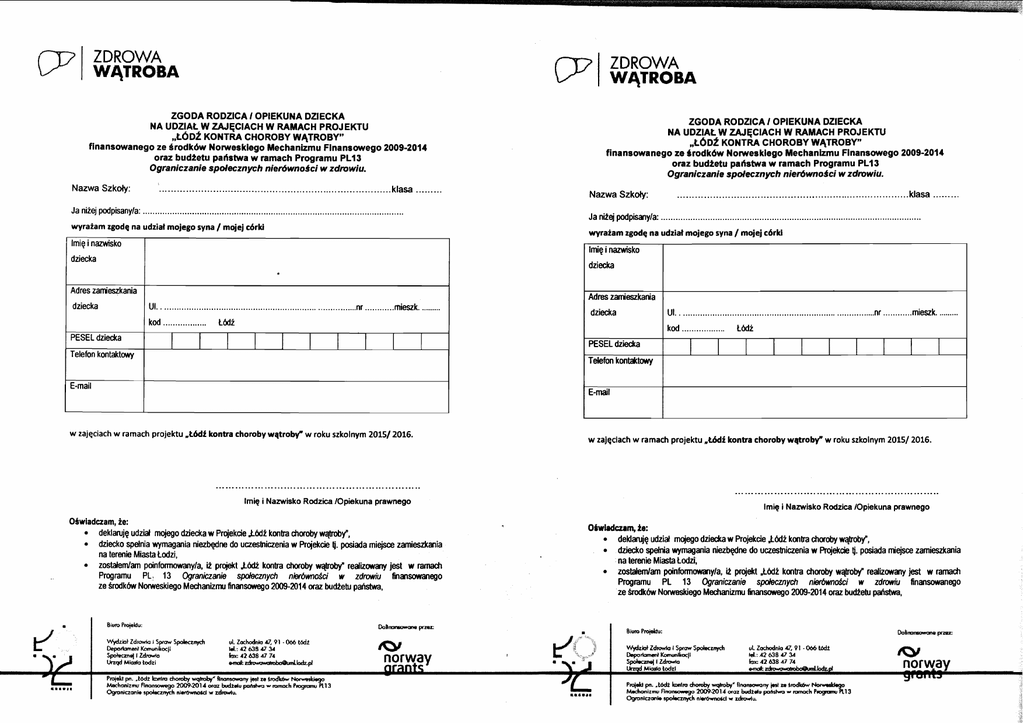 ZDROWA WATROBA ZDROWA WATROBA ZGODA RODZICA IOPIEKUNA DUECKA NA UDZIAL W ZAJECIACH W RAMACH PROJEKTU ,,Ld~fKONTRA CHOROBY WATROBY" finansowanego ze lrodkdw Norwesklego Mechanizmu Flnansowego 2009-2014 oraz budtetu pahstwa w ramach Programu PL13 Ograniczanie spdecznych nier6wnoJciw zdrowiu. .............................................................................. Nazwa Szkoly: a ....... Ja niiej podpisanyla: .......................................................................................................... wyraiam zgode na udziat mojego syna / mojej d r k i lmig i nazwisko I dziecka Nazwa Szkoly: .............................................................................. a ......... Ja nitej podpisanyla: ......................................................................................................... wyraiam zgode na udzialmojegosyna / mojejc6rU lmie i narwisko I dziecka Adres zamieszkania dziecka ZGODA RODZICA IOPIEKUNA DZIECKA NA UDZIALW ZAJECIACH W RAMACH PROJEKTU J.6~2 KONTRA CHOROBY WATROBY" finansowanego ze drodkdw Nomesklego Mechanizmu Flnansowego 2009-2014 oraz budtetu ~ a h s t w a w ramach Proaramu PL13 Ograniczanie spdecznych nierdwnodci w zdrowiu. Adres zamieszkania UI. ...............................................................................nr ............mieszk. ......... kod .................. UI. ........................................................................... dziecka t6di nr ............mieszk. ......... kod .................. t b d i PESEL dziecka PESEtd z i i a Telefon kontaktwy Telefonkontaktavy I E-mail E-mail w zajeciach w ramach projektu .t6df kontra chombywqtrobf w roku szkolnym 2015/ 2016. Ime i Namisko Rodzica IOpiekuna prawnego OSwiadczam, ie: deklaruje udzid mojegodziecka w PmjekdeL W t k o n h chwoby w m y " , dziecko spelnia wymagania niezbqlne do uaestniczenia w Projekcie 1. posiada mi* zamiesdtania na terenie MiastaCodzi, w redizavvanyjest w ramach zostalemlam poinformowanyla, it pmjekt L6di kontra chomby w Programu PL 13 Ograniczanie s m z n y c h nWwnoild w zdrowiu fnansowanego ze Srodkh NorweskiegoMechanizmufinansavego 2009-2014 oraz budtetu pahstwa, w zajeciach w ramach projektu .lddi kontra chorobywgtrobf w roku szkolnym 201512016. Ime i Namisko Rodzica IOpiekunaprawnego dekl&je udzid mojegodziecka w Projekae L b d i konba choroby wqtroby", dziecko spelnia wyrnagania niezb@ne do uuestniczenia w Projekde lj. posiada miejsce zamieszkania na terenieMiastatodzi, z o s ~ a m poinformowanyla, i2 projekt .CWi kontra chaoby wqtmbf realizwany jest w ramach Pmgramu PL 13 Ogmiczanie spckmych nbhno.$ci w zdrwiu finansowanego ze M k 6 w NotweskiegoMechanizmubnawmqo 2009-2014 waz budtetupastwa, E lld 0~vl-=t4 * nl..upz * P)aupWU quurr* -Y *I 0-d W m ZDX)r(W4WX O~UOIUW!~ IY12UDPW -7Vw p! &---!! lrpap q m-.ud +d .* !am Bpmwd z aupo6z b auep auepod a? 'weapew dzsfap~ meuz y wofiaw nsppq EEZ Ye 2 MtY!h& J P l w a 2 W h P m W h P a!wPod wrtn( W W W N P ~ 'tlOZ-6001 m u W nun!uepyy obyswo~z o b u e m o s u e u y ' n m p z m .p$wmg~s?u yZ4uzwpds e ! w z q w EL l d n w ~ b !barn d &tsod eu !0m ' F P z M W W W u y3lluaepdS q-60 cr 7d n-~d ~ I P~ 8 a r wed Wwnl W!wd 'WPZ W!H - em)syed W B 'S nwe~8arderne* zaud a p p p nqulunreqm B&l(yqnd eu WpoSz p q d m qu p e p h 'AoJ-ikM b M 1 9 W Y rnf W & J d ~ b e zz~ J n @ w M !2~07w!wPan zaad e w p p n!iuruazlm Bbe!i!~gndeu W 6 z , w W w