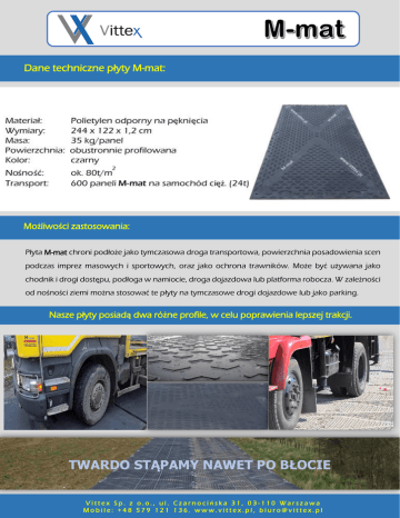 Dane techniczne płyty M-mat: Możliwości zastosowania: Płyta M-mat chroni podłoże jako tymczasowa droga transportowa, powierzchnia posadowienia scen podczas imprez masowych i sportowych, oraz jako ochrona trawników. Może być używana jako chodnik i drogi dostępu, podłoga w namiocie, droga dojazdowa lub platforma robocza. W zależności od nośności ziemi można stosować te płyty na tymczasowe drogi dojazdowe lub jako parking. Nasze płyty posiadą dwa różne profile, w celu poprawienia lepszej trakcji. TWARDO STĄPAMY NAWET PO BŁOCIE Vittex Sp. z o.o., ul. Czarnocińska 31, 03-110 Warszawa Mobile: +48 579 121 136, www.vittex.pl, [email protected]