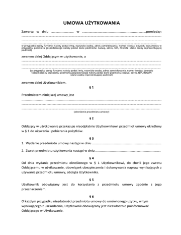 UMOWA UŻYTKOWANIA Zawarta w dniu ………........……… w ………………………….................................……….pomiędzy: …………………….……………………………………………………………………...........................………………………….……………… ……………………………………………………...........................………………………….……………………………………………………. ..........................………………………………………………………………………………………………………………………………… w przypadku osoby fizycznej należy podać imię, nazwisko osoby, adres zameldowania, numer i rodzaj dowodu tożsamości; w przypadku podmiotu gospodarczego należy podać dane podmiotu: nazwę, adres, NIP, REGON i dane osoby reprezentującej podmiot) zwanym dalej Oddającym w użytkowanie, a ……………………………………………………………………...................................……………………………………………………….. …………………….……………………………………………………………………...........................……..…………………….…………… ………………………………………………………...........................……………………………………………………………………………. (w przypadku osoby fizycznej należy podać imię, nazwisko osoby, adres zameldowania, numer i rodzaj dowodu tożsamości; w przypadku podmiotu gospodarczego należy podać dane podmiotu: nazwę, adres, NIP, REGON i dane osoby reprezentującej podmiot) zwanym dalej Użytkownikiem. §1 Przedmiotem niniejszej umowy jest ....................................................................................................…………………………………………………….. ………………………...................................…………………………………………………………………………………………............. ......................…………………………………………………………………………………………...................................…………… (określenie przedmiotu umowy) §2 Oddający w użytkowanie przekazuje nieodpłatnie Użytkownikowi przedmiot umowy określony w § 1 do używania i pobierania pożytków. §3 1. Wydanie przedmiotu umowy nastąpi w dniu ..................................................................………. 2. Zwrot przedmiotu użytkowania nastąpi w dniu .........................................………..................…. §4 Od dnia wydania przedmiotu określonego w § 1 Użytkownikowi, do chwili jego zwrotu Oddającemu w użytkowanie, obowiązek ubezpieczenia i dokonywania napraw wynikających z używania przedmiotu umowy, obciąża Użytkownika. §5 Użytkownik obowiązany jest do korzystania z przedmiotu umowy zgodnie z jego przeznaczeniem. §6 O każdym przypadku niezdatności przedmiotu umowy do umówionego użytku, w tym wynikającego z uszkodzenia, Użytkownik obowiązany jest niezwłocznie poinformować Oddającego w Użytkowanie. §7 W przypadku stwierdzenia przez Oddającego w użytkowanie, iż przedmiot umowy wykorzystywany jest niezgodnie z umową lub jego społeczno-gospodarczym przeznaczeniem, Oddający w użytkowanie ma prawo niezwłocznie rozwiązać niniejszą umowę, a Użytkownik obowiązany jest do dokonania niezwłocznego zwrotu przedmiotu umowy. §8 Zmiany i uzupełnienia umowy wymagają aneksu w formie pisemnej pod rygorem nieważności. §9 W spawach dotyczących przedmiotu niniejszej umowy, a nie uregulowanych jej postanowieniami, mają zastosowanie przepisy kodeksu cywilnego. § 10 Umowę sporządzono w dwóch jednobrzmiących egzemplarzach, po jednym dla każdej ze stron. § 11 Wszelkie spory wynikłe z wykonania mniejszej umowy rozstrzygać będzie sąd właściwy dla siedziby/ miejsca zamieszkania Oddającego w użytkowanie. ..................................................... (Oddający w użytkowanie) ..................................................... (Użytkownik) Umowa użytkowania Użytkowanie zostało uregulowane przez ustawodawcę w art. 252 – art. 284 ustawy z dnia 23 kwietnia 1964 r. – kodeks cywilny, znajdą tu również zastosowanie przepisy o umowie zlecenia. Ustawodawca określił użytkowanie w następujący sposób: Rzecz można obciążyć prawem do jej używania i do pobierania jej pożytków (użytkowanie). Przedmiotem użytkowania mogą być także prawa, do których użytkowania stosuje się odpowiednio przepisy o użytkowaniu rzeczy. Do ustanowienia użytkowania na prawie stosuje się odpowiednio przepisy o przeniesieniu tego prawa. Użytkowanie może być albo odpłatne albo nieodpłatne – ustawodawca pozostawił stronom pełną dowolność w tym zakresie. Użytkowanie jest niezbywalne i wygasa wskutek niewykonywania przez lat dziesięć. Użytkownik obowiązany jest dokonywać napraw i innych nakładów związanych ze zwykłym korzystaniem z rzeczy. O potrzebie innych napraw i nakładów powinien niezwłocznie zawiadomić właściciela i zezwolić mu na dokonanie potrzebnych robót. Po wygaśnięciu użytkowania użytkownik obowiązany jest zwrócić rzecz właścicielowi w takim stanie, w jakim powinna się znajdować stosownie do przepisów o wykonywaniu użytkowania. Roszczenie właściciela przeciwko użytkownikowi o naprawienie szkody z powodu pogorszenia rzeczy albo o zwrot nakładów na rzecz, jak również roszczenie użytkownika przeciwko właścicielowi o zwrot nakładów na rzecz, przedawniają się z upływem roku od dnia zwrotu rzeczy.