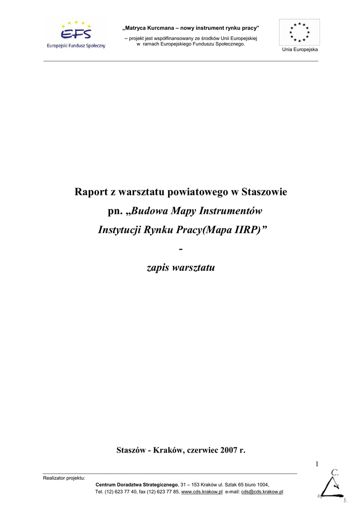 „Matryca Kurcmana – nowy instrument rynku pracy” – projekt jest współfinansowany ze środków Unii Europejskiej w ramach Europejskiego Funduszu Społecznego. Unia Europejska ____________________________________________________________________________________________________________________ Raport z warsztatu powiatowego w Staszowie pn. „Budowa Mapy Instrumentów Instytucji Rynku Pracy(Mapa IIRP)” zapis warsztatu Staszów - Kraków, czerwiec 2007 r. 1 ______________________________________________________________________________________________ Realizator projektu: Centrum Doradztwa Strategicznego, 31 – 153 Kraków ul. Szlak 65 biuro 1004, Tel. (12) 623 77 40, fax (12) 623 77 85, www.cds.krakow.pl e-mail: [email protected] „Matryca Kurcmana – nowy instrument rynku pracy” – projekt jest współfinansowany ze środków Unii Europejskiej w ramach Europejskiego Funduszu Społecznego. Unia Europejska ____________________________________________________________________________________________________________________ Wstęp Niniejszy raport prezentuje wyniki prac warsztatowych uzyskane podczas dwudniowego warsztatu powiatowego pn. „Budowa Mapy Instrumentów Instytucji Rynku Pracy (Mapa IIRP)”, jaki odbył się 14 i 15 maja 2007 roku w Staszowie. Mapa Instrumentów Instytucji Rynku Pracy jest drugim elementem projektu pn. „Matryca Kurcmana – nowy instrument rynku pracy”, obok wdroŜonego juŜ w 9 Powiatowych Urzędach Pracy narzędzia diagnostycznego segmentującego klientów PUP ze względu na ich motywacje do pracy i posiadane kwalifikacje. Mapa IIRP będzie całościową bazą propozycji instytucji rynku pracy, adekwatnych dla klientów Powiatowych Urzędów Pracy, spozycjonowanych w oparciu o kryterium motywacji i kwalifikacji. Celem warsztatu powiatowego pn. „Budowa Mapy Instrumentów Instytucji Rynku Pracy (Mapa IIRP)” było zainicjowanie współpracy pomiędzy przedstawicielami powiatowych instytucji rynku pracy na rzecz budowy Mapy Instrumentów Instytucji Rynku Pracy oraz wstępne przyporządkowanie wszystkich propozycji realizowanych w powiecie pod kątem ich adekwatności i trafności dla osób bezrobotnych pozycjonowanych w poszczególnych polach Matrycy. Warsztaty słuŜyły równieŜ próbie wypracowania systemu procedur i rozwiązań, dotyczących budowania, uaktualniania i organizacji bazy informacji o propozycjach IRP w powiecie. 2 ______________________________________________________________________________________________ Realizator projektu: Centrum Doradztwa Strategicznego, 31 – 153 Kraków ul. Szlak 65 biuro 1004, Tel. (12) 623 77 40, fax (12) 623 77 85, www.cds.krakow.pl e-mail: [email protected] „Matryca Kurcmana – nowy instrument rynku pracy” – projekt jest współfinansowany ze środków Unii Europejskiej w ramach Europejskiego Funduszu Społecznego. Unia Europejska ____________________________________________________________________________________________________________________ Dobór uczestników Dobór uczestników warsztatu powiatowego poprzedziło szczegółowe rozpoznanie działalności instytucji rynku pracy funkcjonujących na terenie powiatu staszowskiego. Funkcjonowanie kaŜdej instytucji – jej struktura, stała działalność i realizowane projekty zostały opisane w raporcie pn. „Instytucje rynku pracy w powiecie – diagnoza dostępnych instrumentów i programów” (styczeń 2007 roku). W celu efektywnego budowania powiatowej bazy propozycji IRP (Mapy IIRP), koniecznym było zapewnienie uczestnictwa na warsztacie powiatowym przedstawicieli wszystkich instytucji rynku pracy funkcjonujących w powiecie staszowskim i wdraŜających projekty skierowane do osób bezrobotnych. Wśród tych instytucji znalazły się m.in. niepubliczne agencje zatrudnienia, instytucje dialogu i partnerstwa lokalnego, organizacje pozarządowe, ośrodki pomocy społecznej, ośrodki szkoleniowe, organizacje skupiające przedsiębiorców i inne. We wszystkich dziewięciu powiatach liczba takich instytucji i poziom ich aktywności jest inny, dlatego teŜ przyjęto załoŜenie, Ŝe w przypadku powiatów województwa małopolskiego (Chrzanów, Oświęcim, Olkusz). uczestnikami warsztatów będą przedstawiciele co najmniej ośmiu instytucji rynku pracy, natomiast w odniesieniu do powiatów województwa świętokrzyskiego (Jędrzejów, Opatów, Staszów) i podkarpackiego (Lesko, Sanok, Ustrzyki Dolne) minimum pięciu. W powiecie staszowskim, do udziału w warsztatach zaproszeni zostali przedstawiciele następujących instytucji: − Powiatowy Urząd Pracy w Staszowie; − Centrum Integracji Społecznej w Staszowie; − Gminne Centrum Informacji w Połańcu; − Ośrodek Wspierania Przedsiębiorczości w Sandomierzu o/ Staszów; − Cech Rzemieślników i Przedsiębiorców; − Zakład Doskonalenia Zawodowego w Kielcach - Ośrodek Kształcenia Zawodowego w Staszowie; − Zakład Doskonalenia Zawodowego w Kielcach Ośrodek Kształcenia Zawodowego w Połańcu; − Centrum Kształcenia Praktycznego w Staszowie; 3 ______________________________________________________________________________________________ Realizator projektu: Centrum Doradztwa Strategicznego, 31 – 153 Kraków ul. Szlak 65 biuro 1004, Tel. (12) 623 77 40, fax (12) 623 77 85, www.cds.krakow.pl e-mail: [email protected] „Matryca Kurcmana – nowy instrument rynku pracy” – projekt jest współfinansowany ze środków Unii Europejskiej w ramach Europejskiego Funduszu Społecznego. Unia Europejska ____________________________________________________________________________________________________________________ − Koneckie Stowarzyszenie Wspierania Przedsiębiorczości Biuro zamiejscowe w Staszowie; − Staszowska Izba Gospodarcza; − Powiatowa Rada Zatrudnienia; − Powiatowe Centrum Pomocy Rodzinie w Staszowie; − Państowowy Fundusz Rehabilitacji Osób Niepełnosprawnych w Staszowie. Ostatecznie w warsztacie powiatowym uczestniczyło 11 osób, z 8 instytucji (lis