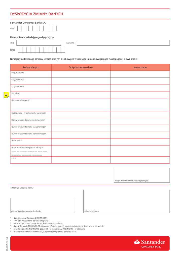 DYSPOZYCJA ZMIANY DANYCH Santander Consumer Bank S.A. data1 Dane Klienta składającego dyspozycję imię nazwisko PESEL Niniejszym dokonuję zmiany swoich danych osobowych wskazując jako obowiązujące następujące, nowe dane: Rodzaj danych Dotychczasowe dane Nowe dane Imię, nazwisko Obywatelstwo Kraj urodzenia Rezydent 2 Adres zameldowania3 Rodzaj, seria i nr dokumentu tożsamości Data ważności dokumentu tożsamości4 Numer krajowy telefonu stacjonarnego5 Numer krajowy telefonu komórkowego 6 Adres e-mail Adres korespondencyjny do lokaty nr: PESEL Adnotacje Oddziału Banku: pieczęć i podpis pracownika Banku 3 4 5 6 1 [Z_ZD/K_w.4.3] 2 adnotacje Banku data bieżąca w formacie DD.MM.RRRR TAK albo NIE zależnie od właściwej opcji ulica, numer domu, numer lokalu, kod pocztowy, miasto data w formacie RRRR-MM-DD lub wyraz „Bezterminowy” zależnie od zapisu na dokumencie tożsamości nr w formacie KK NNNNNNN, gdzie: KK - nr kierunkowy, NNNNNNN – nr abonenta nr w formacie MMMMMMMMM, z pominięciem prefiksu państwa (+48) podpis Klienta składającego dyspozycję