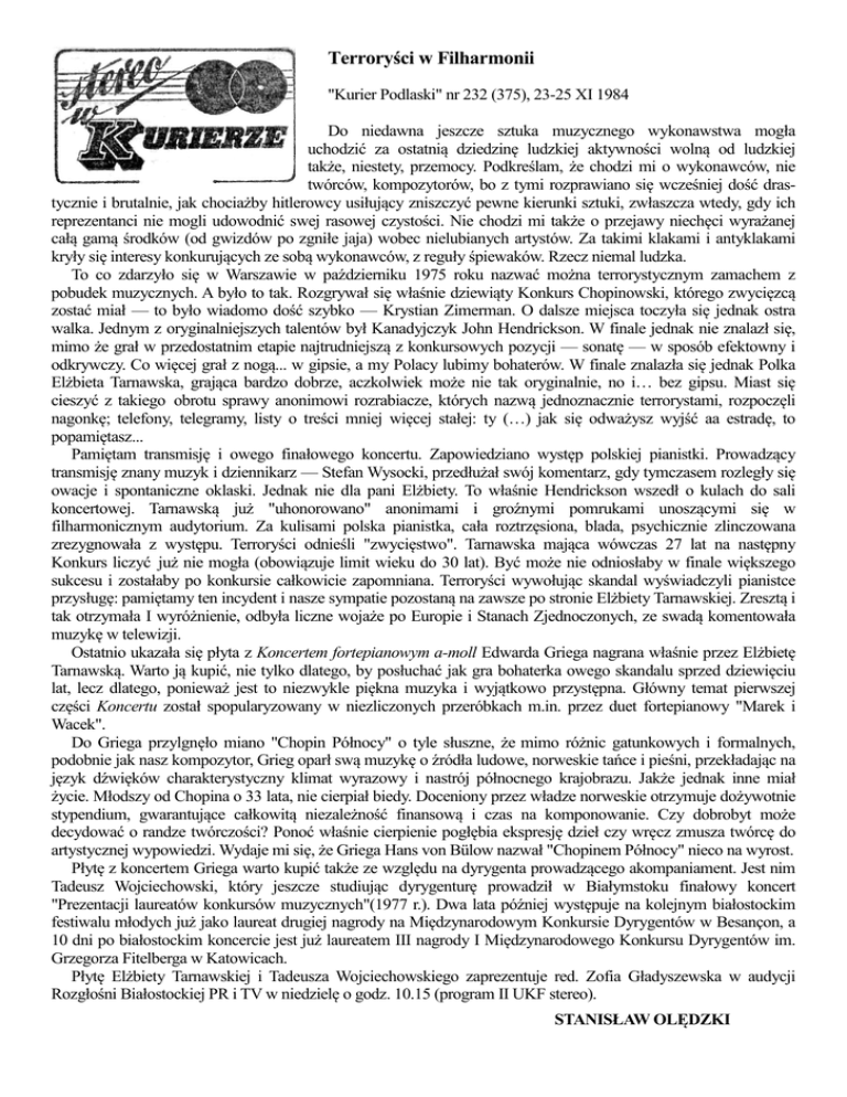 Terroryści w Filharmonii "Kurier Podlaski" nr 232 (375), 23-25 XI 1984 Do niedawna jeszcze sztuka muzycznego wykonawstwa mogła uchodzić za ostatnią dziedzinę ludzkiej aktywności wolną od ludzkiej także, niestety, przemocy. Podkreślam, że chodzi mi o wykonawców, nie twórców, kompozytorów, bo z tymi rozprawiano się wcześniej dość drastycznie i brutalnie, jak chociażby hitlerowcy usiłujący zniszczyć pewne kierunki sztuki, zwłaszcza wtedy, gdy ich reprezentanci nie mogli udowodnić swej rasowej czystości. Nie chodzi mi także o przejawy niechęci wyrażanej całą gamą środków (od gwizdów po zgniłe jaja) wobec nielubianych artystów. Za takimi klakami i antyklakami kryły się interesy konkurujących ze sobą wykonawców, z reguły śpiewaków. Rzecz niemal ludzka. To co zdarzyło się w Warszawie w październiku 1975 roku nazwać można terrorystycznym zamachem z pobudek muzycznych. A było to tak. Rozgrywał się właśnie dziewiąty Konkurs Chopinowski, którego zwycięzcą zostać miał — to było wiadomo dość szybko — Krystian Zimerman. O dalsze miejsca toczyła się jednak ostra walka. Jednym z oryginalniejszych talentów był Kanadyjczyk John Hendrickson. W finale jednak nie znalazł się, mimo że grał w przedostatnim etapie najtrudniejszą z konkursowych pozycji — sonatę — w sposób efektowny i odkrywczy. Co więcej grał z nogą... w gipsie, a my Polacy lubimy bohaterów. W finale znalazła się jednak Polka Elżbieta Tarnawska, grająca bardzo dobrze, aczkolwiek może nie tak oryginalnie, no i… bez gipsu. Miast się cieszyć z takiego obrotu sprawy anonimowi rozrabiacze, których nazwą jednoznacznie terrorystami, rozpoczęli nagonkę; telefony, telegramy, listy o treści mniej więcej stałej: ty (…) jak się odważysz wyjść aa estradę, to popamiętasz... Pamiętam transmisję i owego finałowego koncertu. Zapowiedziano występ polskiej pianistki. Prowadzący transmisję znany muzyk i dziennikarz — Stefan Wysocki, przedłużał swój komentarz, gdy tymczasem rozległy się owacje i spontaniczne oklaski. Jednak nie dla pani Elżbiety. To właśnie Hendrickson wszedł o kulach do sali koncertowej. Tarnawską już "uhonorowano" anonimami i groźnymi pomrukami unoszącymi się w filharmonicznym audytorium. Za kulisami polska pianistka, cała roztrzęsiona, blada, psychicznie zlinczowana zrezygnowała z występu. Terroryści odnieśli "zwycięstwo". Tarnawska mająca wówczas 27 lat na następny Konkurs liczyć już nie mogła (obowiązuje limit wieku do 30 lat). Być może nie odniosłaby w finale większego sukcesu i zostałaby po konkursie całkowicie zapomniana. Terroryści wywołując skandal wyświadczyli pianistce przysługę: pamiętamy ten incydent i nasze sympatie pozostaną na zawsze po stronie Elżbiety Tarnawskiej. Zresztą i tak otrzymała I wyróżnienie, odbyła liczne wojaże po Europie i Stanach Zjednoczonych, ze swadą komentowała muzykę w telewizji. Ostatnio ukazała się płyta z Koncertem fortepianowym a-moll Edwarda Griega nagrana właśnie przez Elżbietę Tarnawską. Warto ją kupić, nie tylko dlatego, by posłuchać jak gra bohaterka owego skandalu sprzed dziewięciu lat, lecz dlatego, ponieważ jest to niezwykle piękna muzyka i wyjątkowo przystępna. Główny temat pierwszej części Koncertu został spopularyzowany w niezliczonych przeróbkach m.in. przez duet fortepianowy "Marek i Wacek". Do Griega przylgnęło miano "Chopin Północy" o tyle słuszne, że mimo różnic gatunkowych i formalnych, podobnie jak nasz kompozytor, Grieg oparł swą muzykę o źródła ludowe, norweskie tańce i pieśni, przekładając na język dźwięków charakterystyczny klimat wyrazowy i nastrój północnego krajobrazu. Jakże jednak inne miał życie. Młodszy od Chopina o 33 lata, nie cierpiał biedy. Doceniony przez władze norweskie otrzymuje dożywotnie stypendium, gwarantujące całkowitą niezależność finansową i czas na komponowanie. Czy dobrobyt może decydować o randze twórczości? Ponoć właśnie cierpienie pogłębia ekspresję dzieł czy wręcz zmusza twórcę do artystycznej wypowiedzi. Wydaje mi się, że Griega Hans von Bülow nazwał "Chopinem Północy" nieco na wyrost. Płytę z koncertem Griega warto kupić także ze względu na dyrygenta prowadzącego akompaniament. Jest nim Tadeusz Wojciechowski, który jeszcze studiując dyrygenturę prowadził w Białymstoku finałowy koncert "Prezentacji laureatów konkursów muzycznych"(1977 r.). Dwa lata później występuje na kolejnym białostockim festiwalu młodych już jako laureat drugiej nagrody na Międzynarodowym Konkursie Dyrygentów w Besançon, a 10 dni po białostockim koncercie jest już laureatem III nagrody I Międzynarodowego Konkursu Dyrygentów im. Grzegorza Fitelberga w Katowicach. Płytę Elżbiety Tarnawskiej i Tadeusza Wojciechowskiego zaprezentuje red. Zofia Gładyszewska w audycji Rozgłośni Białostockiej PR i TV w niedzielę o godz. 10.15 (program II UKF stereo). STANISŁAW OLĘDZKI