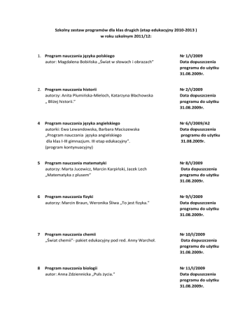 Szkolny zestaw programów dla klas drugich (etap edukacyjny 2010-2013 ) w roku szkolnym 2011/12: 1. Program nauczania języka polskiego autor: Magdalena Bobińska „Świat w słowach i obrazach” Nr 1/I/2009 Data dopuszczenia programu do użytku 31.08.2009r. 2. Program nauczania historii autorzy: Anita Plumińska-Mieloch, Katarzyna Błachowska „ Bliżej historii.” Nr 2/I/2009 Data dopuszczenia programu do użytku 31.08.2009r. 4 Program nauczania języka angielskiego autorki: Ewa Lewandowska, Barbara Maciszewska „Program nauczania języka angielskiego dla klas I-III gimnazjum. III etap edukacyjny”. (program kontynuacyjny) Nr 6/I/2009/A2 Data dopuszczenia programu do użytku 31.08.2009r. 5 Program nauczania matematyki autorzy: Marta Jucewicz, Marcin Karpiński, Jacek Lech „Matematyka z plusem” Nr 8/I/2009 Data dopuszczenia programu do użytku 31.08.2009r. 6 Program nauczania fizyki autorzy: Marcin Braun, Weronika Śliwa „To jest fizyka.” Nr 9/I/2009 Data dopuszczenia programu do użytku 31.08.2009r. 7 Program nauczania chemii „Świat chemii”- pakiet edukacyjny pod red. Anny Warchoł. Nr 10/I/2009 Data dopuszczenia programu do użytku 31.08.2009r. 8 Program nauczania biologii autor: Anna Zdziennicka „Puls życia.” Nr 11/I/2009 Data dopuszczenia programu do użytku 31.08.2009r. 9 Program nauczania geografii autorzy: Ewa Maria Tuz, Dawid Szczypiński „Planeta nowa.” Nr 12/I/2009 Data dopuszczenia programu do użytku 31.08.2009r. 10 Program nauczania informatyki autor: Ewa Filipowicz „ Informatyka dla ciebie.” Nr 13/I/2009 Data dopuszczenia programu do użytku 31.08.2009r. 11 Program nauczania wychowania fizycznego Program zredagowany na podstawie programu wychowania fizycznego o profilu rekreacyjno-zdrowotnym „ Wybierz sam” autorstwa Ewy Czerskiej i programu „Wychowanie fizyczne, klasy 1-3 gimnazjum” autorstwa Mirosławy Śmigielskiej oraz programu do nauki pływania autorstwa Magdaleny Mizerek i Agnieszki Radwańskiej Nr 14/I/2009 Data dopuszczenia programu do użytku 31.08.2009r. 12 Program nauczania religii „Wierzyć Chrystusowi” WAM Kraków, nr AZ-3-01/1 Nr 15/I/2009 Data dopuszczenia programu do użytku 31.08.2009r. 13 Program nauczania języka niemieckiego autor Paweł Piszczatowski „Program nauczania języka niemieckiego w gimnazjum” (kurs podstawowy) Nr 16/I/2009 Data dopuszczenia programu do użytku 31.08.2009r. 14 Program nauczania języka francuskiego autorka: Justyna Bacz- Kazior „Program nauczania języka języka francuskiego dla gimnazjum” (kurs kontynuacyjny) Nr 17/I/2009 data dopuszczenia programu do użytku 31.08.2009r. 15 Program nauczania wychowania do życia w rodzinie autorzy: Małgorzata Sitarska, Bożena Strzemieczna „Wychowanie do życia w rodzinie” Nr 18/I/2009 Data dopuszczenia programu do użytku 31.08.2009r. 16 Program do zajęć artystycznych ( plastyka) Program zajęć artystycznych w gimnazjum „Szkolna pracownia artystyczna” autorstwa Beaty Mikulik Nr 1/II/2010 Data dopuszczenia programu do użytku 30.08.2010r. 17 Program do zajęć artystycznych( muzyka) zredagowany na podstawie programu „Łączy nas śpiew” autorstwa Joanny Sztejnbis-Zdyb Nr 2/II/2011 Data dopuszczenia programu do użytku 31.08.2011r. 18 Program do zajęć technicznych autorzy: Waldemar Czyżewski, Ewa Uljasz „Technika w praktyce”. Program nauczania zajęć technicznych w Gimnazjum. Wyd. Nowa Era. Nr 3/II/2010 Data dopuszczenia programu do użytku 30.08.2010 r.
