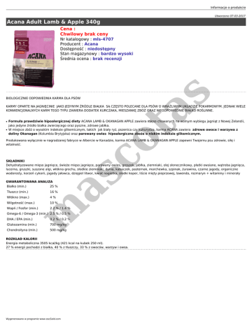Informacje o produkcie Utworzono 07-03-2017 Acana Adult Lamb & Apple 340g Cena : Chwilowy brak ceny s Nr katalogowy : mls-4707 Producent : Acana Dostępność : niedostępny Stan magazynowy : bardzo wysoki Średnia ocena : brak recenzji BIOLOGICZNIE ODPOWIEDNIA KARMA DLA PSÓW ● ● co ta KARMY OPARTE NA JAGNIĘCINIE JAKO JEDYNYM ŹRÓDLE BIAŁKA SĄ CZĘSTO POLECANE DLA PSÓW O WRAŻLIWYM UKŁADZIE POKARMOWYM. JEDNAK WIELE KONWENCJONALNYCH KARM TEGO TYPU ZAWIERA DODATEK KURCZAKA, MIESZANKĘ ZBÓŻ ORAZ NIEODPOWIEDNIE BIAŁKO ROŚLINNE. Formuła prawdziwie hipoalergicznej diety ACANA LAMB & OKANAGAN APPLE zawiera mięso chowanych na wolnym wybiegu jagniąt z Nowej Zelandii, jako jedyne źródło białka zwierzęcego oraz pyszne, zdrowe jabłka. W miejsce zbóż o wysokim indeksie glikemicznym, takich jak biały ryż, pszenica czy kukurydza, karma ACANA zawiera zdrowe owoce i warzywa z doliny Okanagan (Kolumbia Brytyjska) oraz parowany owies hipoalergiczne zboże o niskim indeksie glikemicznym. Produkowana wyłącznie w nagradzanej fabryce w Albercie w Kanadzie, karma ACANA LAMB & OKANAGAN APPLE zapewni Twojemu psu zdrowie, siłę i witalność. m as SKŁADNIKI Dehydratyzowane mięso jagnięce, świeże mięso jagnięce, parowany owies, groszek, jabłka, ziemniaki, olej słonecznikowy, płatki owsiane, wątroba jagnięca, lucerna, gruszki, suszone algi, włókna grochu, słodkie ziemniaki, dynia, kabaczek, pasternak, marchewka, szpinak, żurawina, czarne jagody, organiczne wodorosty, korzeń cykorii, jagody jałowca, dzięgiel litwor, kwiat nagietka, słodki koper, liście mięty pieprzowej, lawenda, rozmaryn + witaminy i minerały GWARANTOWANA ANALIZA Białko (min.) 25 % Tłuszcz (min.) 16 % Włókno (max.) 4% Wilgotność (max.) 10 % Wapń / Fosfor (min.) 2.2 % / 1.4 % Omega-6 / Omega-3 (min.) 2.5 % / 0.5 % DHA / EPA (min.) 0.2 % / 0.2 % Glukozamina (min.) 700 mg/kg Chondroityna (min.) 500 mg/kg ROZKŁAD KALORII Energia metaboliczna 3505 kcal/kg (421 kcal na kubek 250 ml). 27 % energii pochodzi z białka, 40 % z tłuszczy, 33 % z owoców, warzyw i owsa. Wygenerowano w programie www.oscGold.com