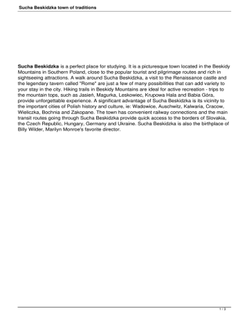 Sucha Beskidzka town of traditions Sucha Beskidzka is a perfect place for studying. It is a picturesque town located in the Beskidy Mountains in Southern Poland, close to the popular tourist and pilgrimage routes and rich in sightseeing attractions. A walk around Sucha Beskidzka, a visit to the Renaissance castle and the legendary tavern called "Rome" are just a few of many possibilities that can add variety to your stay in the city. Hiking trails in Beskidy Mountains are ideal for active recreation - trips to the mountain tops, such as Jasień, Magurka, Leskowiec, Krupowa Hala and Babia Góra, provide unforgettable experience. A significant advantage of Sucha Beskidzka is its vicinity to the important cities of Polish history and culture, ie: Wadowice, Auschwitz, Kalwaria, Cracow, Wieliczka, Bochnia and Zakopane. The town has convenient railway connections and the main transit routes going through Sucha Beskidzka provide quick access to the borders of Slovakia, the Czech Republic, Hungary, Germany and Ukraine. Sucha Beskidzka is also the birthplace of Billy Wilder, Marilyn Monroe's favorite director. 1/3 Sucha Beskidzka town of traditions Remember that ‘Education is an ornament in prosperity and a refuge in adversity.’ (Aristotle) In Sucha Beskidzka you can find: - Regional Hospital (the 2nd place in Lesser Poland according to ‘Rzeczpospolita’ ranking and the high, 25th place in the whole country!) - Headquarters of the Fire Fighting Brigade - Regional Police Station - 2 post offices - Regional Sanitary-Epidemiological Station - 5 banks (Alior Bank, Pekao SA, Pekao BP, Bank BGŻ, Bank Spółdzielczy) - The District Court - 8 ATMs - Student clubs - sports and leisure center - sports stadium - skating rink - fitness clubs - gym 2/3 Sucha Beskidzka town of traditions - hiking trails starting near the University (Magurka, Jasień, Mioduszyna, Zawoja) 3/3