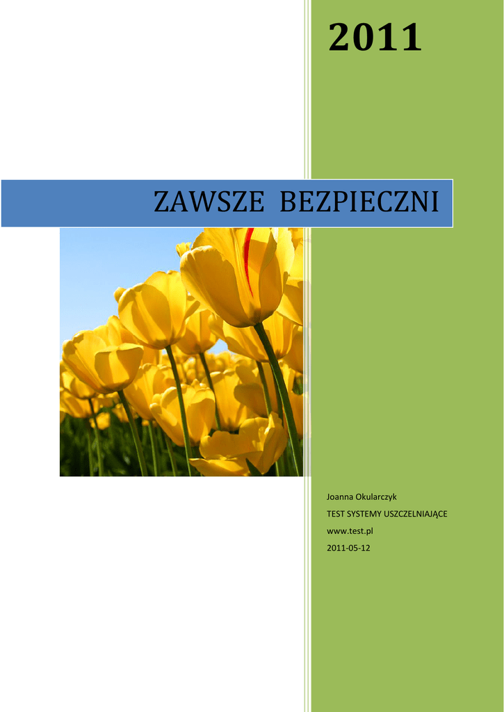 2011 ZAWSZE BEZPIECZNI Joanna Okularczyk TEST SYSTEMY USZCZELNIAJĄCE www.test.pl 2011-05-12 Szanowni Państwo, Witamy w naszej akcji „zawsze bezpieczni” – 2011 Nadszedł wyczekiwany czas częstych wypraw pieszych, rowerowych, a także samochodowych. Jako użytkownicy dróg we wszystkich wymienionych rolach, pomyśleliśmy o tym, jakim utrapieniem często jesteśmy wzajemnie dla siebie. Jak często jako kierowcy denerwujemy się, w ostatniej chwili dostrzegając nieoświetlony rower albo pieszego. I to niekoniecznie po zmroku. Dziwimy się tak beztroskiemu podejściu do bezpieczeostwa. Bo przecież jest to niejednokrotnie sprawa życia lub przynajmniej jego jakości. Specjaliści obliczyli, że poruszając się drogą po ciemku, bez elementów odblaskowych, jesteśmy widoczni w światłach mijania z odległości 20 – 30 metrów. Samochód jadący z prędkością 90 km/h (prędkośd dopuszczalna poza obszarem zabudowanym) pokonuje 25 metrów w ciągu 1 sekundy. Kierujący zatem nie ma żadnych szans na jakąkolwiek reakcję. Jeśli pieszy wyposażony jest w element odblaskowy - kierowca zauważy go już z odległości 130 -150 metrów, czyli ok. 5 razy szybciej. Pomyślmy zatem o bezpieczeostwie swoim i swoich bliskich, sprawmy, żeby byli widoczni na drodze. Przedsiębiorstwo TEST SYSTEMY USZCZELNIAJĄCE robi pierwszy krok - chcielibyśmy wyposażyd naszych przyjaciół, w elementy odblaskowe dla dorosłych i dzieci. Pamiętajmy jeszcze, że prawidłowo noszone odblaski powinny byd zauważalne dla kierujących nadjeżdżających z obu kierunków i umieszczone w takim miejscu, aby znalazły się w polu działania świateł samochodowych! Przygotowaliśmy ponad 2000 elementów odblaskowych, którymi się podzielimy, mając nadzieję, że wspólnie będziemy ambasadorami bezpieczeostwa poprzez poprawę widoczności na drodze. Skąd ta akcja? Po pierwsze, to my sami, właściciele i pracownicy firmy TEST SYSTEMY USZCZELNIAJĄCE, jesteśmy kierowcami, rowerzystami i pieszymi. Mamy dzieci, które jeżeli jeszcze nie są kierowcami, to rowerzystami lub pieszymi albo największym skarbem w wózku dziecięcym. Po drugie, cenimy bezpieczeostwo. Wiemy, jak jesteśmy ważni dla naszych rodzin i jak one są cenne dla nas. Po trzecie, dbamy o bezpieczeostwo naszych partnerów – klientów i współpracowników. Zawsze dokładamy starao, aby oferowane przez nas rozwiązania techniczne, projekty węzłów uszczelniających, uszczelnienia, remontowane siłowniki, działały sprawnie i powodowały „bezpieczny sen” zamawiających. Po czwarte, po prostu lubimy naszych klientów i chcemy aby oni i ich rodziny byli bezpieczni również fizycznie. A możemy się do tego przyczynid w chodby tak symboliczny, lecz przecież istotny sposób. Dlatego niech się sprawdzi - „zawsze bezpieczni” – Joanna Okularczyk (Test Systemy Uszczelniające)