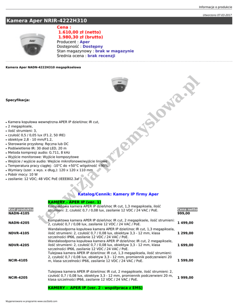 Informacje o produkcie Utworzono 07-03-2017 Kamera Aper NRIR-4222H310 Cena : 1.610,00 zł (netto) 1.980,30 zł (brutto) Producent : Aper Dostępność : Dostępny Stan magazynowy : brak w magazynie Średnia ocena : brak recenzji a. pl Kamera Aper NADN-4222H310 megapikselowa ● ● ● ● ● ● ● ● ● ● ● ● Kamera kopułowa wewnętrzna APER IP dzień/noc IR cut, 2 megapiksele, ilość strumieni: 3, czułość 0,5 / 0,05 lux (F1.2, 50 IRE) obiektyw 2,8 - 10 mm/F1.2, Sterowanie przysłoną: Ręczna lub DC Podświetlenie IR: 30 diod LED, 20 m Metoda kompresji audio: G.711, 8 kHz Wyjście monitorowe: Wyjście kompozytowe Wejście / wyjście audio: Wejście mikrofonowe/wyjście liniowe Temperatura pracy ciągłej: -10°C do +50°C wilgotność <90% Wymiary (szer. x wys. x dług,): 120 x 120 x 110 mm Pobór mocy: 10 W zasilanie: 12 VDC; 48 VDC PoE (IEEE802.3af ) -p r ● w iz ja ● ze m ys lo w Specyfikacja: Katalog/Cennik: Kamery IP firmy Aper Kompaktowa kamera APER IP dzień/noc IR cut, 1,3 megapiksela, ilość strumieni: 2, czułość 0,7 / 0,08 lux, zasilanie 12 VDC / 24 VAC / PoE. te Kod produktu NADN-4105 le KAMERY - APER IP (ver. 1) NADN-4205 NDVR-4105 NDVR-4205 NCIR-4105 NCIR-4205 Kompaktowa kamera APER IP dzień/noc IR cut, 2 megapiksele, ilość strumieni: 2, czułość 0,7 / 0,08 lux, zasilanie 12 VDC / 24 VAC / PoE. Wandaloodporna kopułowa kamera APER IP dzień/noc IR cut, 1,3 megapiksela, ilość strumieni: 2, czułość 0,7 / 0,08 lux, obiektyw 3,3 - 12 mm, klasa szczelności IP66, zasilanie 12 VDC / 24 VAC / PoE. Wandaloodporna kopułowa kamera APER IP dzień/noc IR cut, 2 megapiksele, ilość strumieni: 2, czułość 0,7 / 0,08 lux, obiektyw 3,3 - 12 mm, klasa szczelności IP66, zasilanie 12 VDC / 24 VAC / PoE. Tulejowa kamera APER IP dzień/noc IR cut, 1,3 megapiksela, ilość strumieni: 2, czułość 0,7 / 0,08 lux, obiektyw 3,3 - 12 mm, promiennik podczerwieni 20 m, klasa szczelności IP66, zasilanie 12 VDC / 24 VAC / PoE. Tulejowa kamera APER IP dzień/noc IR cut, 2 megapiksele, ilość strumieni: 2, czułość 0,7 / 0,08 lux, obiektyw 3,3 - 12 mm, promiennik podczerwieni 20 m, klasa szczelności IP66, zasilanie 12 VDC / 24 VAC / PoE. KAMERY - APER IP (ver. 2 - współpraca z EMS) Wygenerowano w programie www.oscGold.com Cena netto 999,00 1 499,00 1 299,00 1 699,00 1 599,00 1 999,00 Kod produktu NADN-4222H310 Kamera kopułowa wewnętrzna APER IP dzień/noc IR cut, 2 megapiksele, ilość strumieni: 3, czułość 0,5 / 0,05 lux, obiektyw 2,8 - 10 mm, zasilanie 12 VDC / PoE. Cena netto 1599,00 NRIR-4222H310 Kamera kopułowa wewnętrzna APER IP dzień/noc IR cut, 2 megapiksele, ilość strumieni: 3, czułość 0,5 / 0,0 lux, obiektyw 2,8 - 10 mm, promiennik podczerwieni 10 m, zasilanie 12 VDC / PoE. 1699,00 NRIR-4232H Wandaloodporna kamera kopułowa APER IP dzień/noc IR cut, 2 megapiksele, ilość strumieni: 3, czułość 0,5 / 0,0 lux, obiektyw 4 mm, promiennik podczerwieni 10m, zasilanie 12 VDC / PoE. 1299,00 NCIR-4222H Tulejowa kamera APER IP dzień/noc IR cut, 2 megapiksele, ilość strumieni: 3, czułość 0,5 / 0,0 lux, obiektyw 4 mm, promiennik podczerwieni 10m, klasa szczelności IP66, zasilanie 12 VDC / PoE. 1299,00 Kamera kompaktowa APER IP dzień/noc IR cut, 2 megapiksele, ilość strumieni: 2 299,00 3, czułość 0,5 / 0,01 lux, zasilanie 12 VDC / 24 VAC / PoE. Kamera kopułowa wewnętrzna APER IP dzień/noc IR cut, 2 megapiksele, ilość strumieni: 3, czułość 0,5 / 0,01 lux, obiektyw 3,5 - 16 mm ze zdalnym 2 999,00 sterowaniem, zasilanie 12 VDC / 24 VAC, PoE. Wandaloodporna kamera kopułowa APER IP dzień/noc IR cut, 2 megapiksele, ilość strumieni: 3, czułość 0,5 / 0,0 lux, obiektyw 3,5 - 16 mm ze zdalnym 3 399,00 sterowaniem, promiennik podczerwieni 30 m, klasa szczelności IP66, zasilanie 12 VDC / 24 VAC / PoE. NADN-4225H pl NADN-4235H316 ze m ys lo w a. NRIR-4235H316 NCIR-4225H316 Tulejowa kamera APER IP dzień/noc IR cut, 2 megapiksele, ilość strumieni: 3, czułość 0,5 / 0,0 lux, obiektyw 3,5 - 16 mm ze zdalnym sterowaniem, promiennik podczerwieni 30m, klasa szczelności IP66, zasilanie 12 VDC / 24 VAC / PoE. NADN-920H Kamera szybkoobrotowa zewnętrzna, zoom 20x, obiektyw ogniskowa f=4,7 94 mm, F1.6~3.5, czułość 0,08 lux (1/4 sec), IP67, wbudowana grzałka, wentylator, zasilanie 24 VAC. Kamera APER IP dzień/noc, 2 megapiksele, ilość 14 999,00 strumieni: 3, czułość 0,5 / 0,01 lux, obiektyw 4,7 - 94 mm, zoom 20x, zasilanie 12 VDC / 24 VAC / PoE. 4 299,00 KAMERY - APER IP (SLOC - kabel koncentryczny) Kamera kompaktowa APER IP dzień/noc IR cut, 2 megapiksele, ilość strumieni: Cena netto 3, czułość 0,5 / 0,01 lux, zasilanie 12 VDC / 24 VAC / PoE. Interfejs SLOC. 2 299,00 NRIR-S4235H316 Kamera kopułowa wewnętrzna APER IP dzień/noc IR cut, 2 megapiksele, ilość strumieni: 3, czułość 0,5 / 0,01 lux, obiektyw 3,5 - 16 mm ze zdalnym sterowaniem, zasilanie 12 VDC / 24 VAC, PoE. Interfejs SLOC. Tulejowa kamera APER IP dzień/noc IR cut, 2 megapiksele, ilość strumieni: 3, czułość 0,5 / 0,0 lux, obiektyw 3,5 - 16 mm ze zdalnym sterowaniem, promiennik podczerwieni 30m, klasa szczelności IP66, zasilanie 12 VDC / 24 VAC / PoE. Interfejs SLOC. te NCIR-S4225H316 Wandaloodporna kamera kopułowa APER IP dzień/noc IR cut, 2 megapiksele, ilość strumieni: 3, czułość 0,5 / 0,01 lux, obiektyw 3,5 - 16 mm ze zdalnym sterowaniem, promiennik podczerwieni 30 m, klasa szczelności IP66, zasilanie 12 VDC / 24 VAC / PoE. Interfejs SLOC. le NDVR-S4235H316 w iz ja -p r Kod produktu NADN-S4225H NADN-S920H 2 999,00 3 399,00 4 299,00 Kamera szybkoobrotowa zewnętrzna, zoom 20x, obiektyw ogniskowa f=4,7 94 mm, F1.6~3.5, czułość 0,08 lux (1/4 sec), IP67, wbudowana grzałka, wentylator, zasilanie 24 VAC. Kamera APER IP dzień/noc, 2 megapiksele, ilość 14 999,00 strumieni: 3, czułość 0,5 / 0,01 lux, obiektyw 4,7 - 94 mm, zoom 20x, zasilanie 12 VDC / 24 VAC / PoE. Interfejs SLOC. zadzwoń i zapytaj o rabat (22 672-36-36) (505-130-571