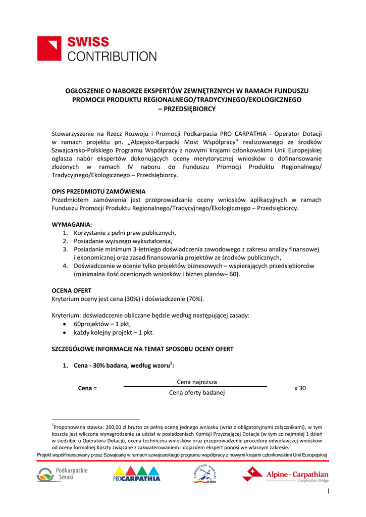OGŁOSZENIE O NABORZE EKSPERTÓW ZEWNĘTRZNYCH W RAMACH FUNDUSZU PROMOCJI PRODUKTU REGIONALNEGO/TRADYCYJNEGO/EKOLOGICZNEGO – PRZEDSIĘBIORCY Stowarzyszenie na Rzecz Rozwoju i Promocji Podkarpacia PRO CARPATHIA - Operator Dotacji w ramach projektu pn. „Alpejsko-Karpacki Most Współpracy” realizowanego ze środków Szwajcarsko-Polskiego Programu Współpracy z nowymi krajami członkowskimi Unii Europejskiej ogłasza nabór ekspertów dokonujących oceny merytorycznej wniosków o dofinansowanie złożonych w ramach IV naboru do Funduszu Promocji Produktu Regionalnego/ Tradycyjnego/Ekologicznego – Przedsiębiorcy. OPIS PRZEDMIOTU ZAMÓWIENIA Przedmiotem zamówienia jest przeprowadzanie oceny wniosków aplikacyjnych w ramach Funduszu Promocji Produktu Regionalnego/Tradycyjnego/Ekologicznego – Przedsiębiorcy. WYMAGANIA: 1. Korzystanie z pełni praw publicznych, 2. Posiadanie wyższego wykształcenia, 3. Posiadanie minimum 3-letniego doświadczenia zawodowego z zakresu analizy finansowej i ekonomicznej oraz zasad finansowania projektów ze środków publicznych, 4. Doświadczenie w ocenie tylko projektów biznesowych – wspierających przedsiębiorców (minimalna ilośd ocenionych wniosków i biznes planów– 60). OCENA OFERT Kryterium oceny jest cena (30%) i doświadczenie (70%). Kryterium: doświadczenie obliczane będzie według następującej zasady: 60projektów – 1 pkt, każdy kolejny projekt – 1 pkt. SZCZEGÓŁOWE INFORMACJE NA TEMAT SPOSOBU OCENY OFERT 1. Cena - 30% badana, według wzoru1: Cena = Cena najniższa Cena oferty badanej x 30 1 Proponowana stawka: 200,00 zł brutto za pełną ocenę jednego wniosku (wraz z obligatoryjnymi załącznikami), w tym koszcie jest wliczone wynagrodzenie za udział w posiedzeniach Komisji Przyznającej Dotacje (w tym co najmniej 1 dzieo w siedzibie u Operatora Dotacji), ocena techniczna wniosków oraz przeprowadzenie procedury odwoławczej wniosków od oceny formalnej.Koszty związane z zakwaterowaniem i dojazdem ekspert ponosi we własnym zakresie. Projekt współfinansowany przez Szwajcarię w ramach szwajcarskiego programu współpracy z nowymi krajami członkowskimi Unii Europejskiej 1 2. Doświadczenie - 70%, badane według wzoru: Doświadczenie = Oferta z doświadczeniem badanym Oferta z największym doświadczeniem x 70 OFERTA POWINNA ZAWIERAD NASTĘPUJĄCE ZAŁĄCZNIKI: 1. CV – według dowolnego wzoru, 2. Formularz aplikacyjny podpisany przez Kandydata/Kandydatkę, 3. Oświadczenie o korzystaniu z pełni praw publicznych według wzoru. Kandydaci i kandydatki powinni gwarantowad rzetelnośd, bezstronnośd oraz poufnośd oceny wniosków. Eksperci zobowiązani będą do złożenia deklaracji bezstronności i poufności. DODATKOWE INFORMACJE Dodatkowych informacji udziela Pani Ewelina Nycz pod numerem telefonu 17 852 85 26,661 113 291 oraz adresem e-mail: [email protected] Oferty zawierające wszystkie wymagane dokumenty należy dostarczyd (złożyd w biurze lub przesład pocztą tradycyjną) w zamkniętej kopercie z dopiskiem NABÓR EKSPERTÓW ZEWNĘTRZNYCH W RAMACH FPPRTEP, pod wskazany adres: Stowarzyszenie na Rzecz Rozwoju i Promocji Podkarpacia PRO CARPATHIA, Biuro Produktu Regionalnego, Tradycyjnego, Ekologicznego, Rynek 16/1, 35-064 Rzeszów do 23 stycznia 2015 r. (liczy się data wpływu oferty do biura). Oferty złożone drogą mailową lub faxem nie będą rozpatrywane. Ocena ofert zostanie dokonana najpóźniej do dnia 26.01.2015 r. Wszyscy eksperci poinformowani zostaną mailowo o wynikach nadesłanych ofert. W toku badania i oceny ofert Zamawiający może żądad od oferentów wyjaśnieo dotyczących treści złożonych ofert. * Zamawiający zastrzega sobie anulowanie zapytania ofertowego na każdym etapie bez podania przyczyny. Projekt współfinansowany przez Szwajcarię w ramach szwajcarskiego programu współpracy z nowymi krajami członkowskimi Unii Europejskiej 2