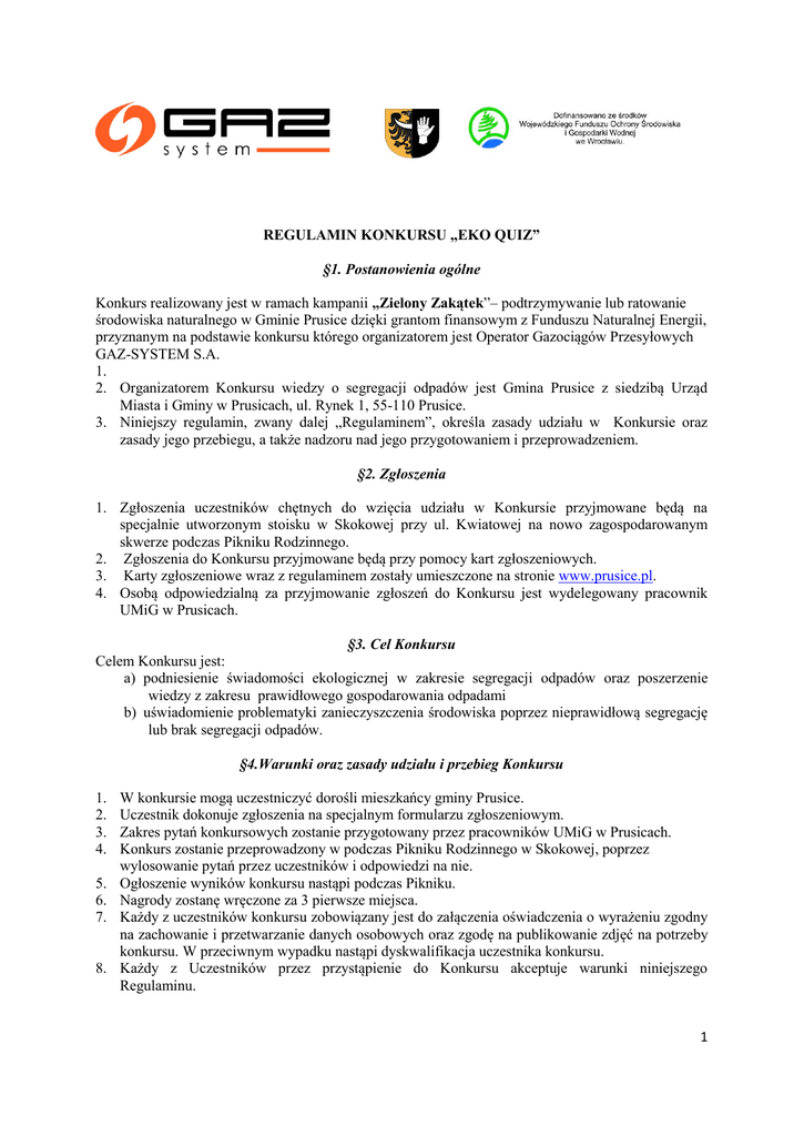 REGULAMIN KONKURSU „EKO QUIZ” §1. Postanowienia ogólne Konkurs realizowany jest w ramach kampanii „Zielony Zakątek”– podtrzymywanie lub ratowanie środowiska naturalnego w Gminie Prusice dzięki grantom finansowym z Funduszu Naturalnej Energii, przyznanym na podstawie konkursu którego organizatorem jest Operator Gazociągów Przesyłowych GAZ-SYSTEM S.A. 1. 2. Organizatorem Konkursu wiedzy o segregacji odpadów jest Gmina Prusice z siedzibą Urząd Miasta i Gminy w Prusicach, ul. Rynek 1, 55-110 Prusice. 3. Niniejszy regulamin, zwany dalej „Regulaminem”, określa zasady udziału w Konkursie oraz zasady jego przebiegu, a także nadzoru nad jego przygotowaniem i przeprowadzeniem. §2. Zgłoszenia 1. Zgłoszenia uczestników chętnych do wzięcia udziału w Konkursie przyjmowane będą na specjalnie utworzonym stoisku w Skokowej przy ul. Kwiatowej na nowo zagospodarowanym skwerze podczas Pikniku Rodzinnego. 2. Zgłoszenia do Konkursu przyjmowane będą przy pomocy kart zgłoszeniowych. 3. Karty zgłoszeniowe wraz z regulaminem zostały umieszczone na stronie www.prusice.pl. 4. Osobą odpowiedzialną za przyjmowanie zgłoszeń do Konkursu jest wydelegowany pracownik UMiG w Prusicach. §3. Cel Konkursu Celem Konkursu jest: a) podniesienie świadomości ekologicznej w zakresie segregacji odpadów oraz poszerzenie wiedzy z zakresu prawidłowego gospodarowania odpadami b) uświadomienie problematyki zanieczyszczenia środowiska poprzez nieprawidłową segregację lub brak segregacji odpadów. §4.Warunki oraz zasady udziału i przebieg Konkursu 1. 2. 3. 4. 5. 6. 7. 8. W konkursie mogą uczestniczyć dorośli mieszkańcy gminy Prusice. Uczestnik dokonuje zgłoszenia na specjalnym formularzu zgłoszeniowym. Zakres pytań konkursowych zostanie przygotowany przez pracowników UMiG w Prusicach. Konkurs zostanie przeprowadzony w podczas Pikniku Rodzinnego w Skokowej, poprzez wylosowanie pytań przez uczestników i odpowiedzi na nie. Ogłoszenie wyników konkursu nastąpi podczas Pikniku. Nagrody zostanę wręczone za 3 pierwsze miejsca. Każdy z uczestników konkursu zobowiązany jest do załączenia oświadczenia o wyrażeniu zgodny na zachowanie i przetwarzanie danych osobowych oraz zgodę na publikowanie zdjęć na potrzeby konkursu. W przeciwnym wypadku nastąpi dyskwalifikacja uczestnika konkursu. Każdy z Uczestników przez przystąpienie do Konkursu akceptuje warunki niniejszego Regulaminu. 1 § 5. Kryteria oceny i werdykt Komisji Konkursowej 1. Poprawność odpowiedzi oceniana będzie przez pracowników UMiG w Prusicach, odpowiedzialnych za przygotowanie konkursu wiedzy o segregacji odpadów komunalnych. 2. Decyzje Komisji są ostateczne i nieodwołalne. § 6. Nagrody 1. Zwycięzcy konkursu otrzymają wartościowe nagrody i pamiątkowe dyplomy. 2. Nagrody zostaną wręczone podczas Pikniku Rodzinnego. 3. Zakup nagród został sfinansowany dzięki grantom finansowym z Funduszu Naturalnej Energii, przyznanym na podstawie konkursu którego organizatorem jest Operator Gazociągów Przesyłowych GAZ-SYSTEM S.A. § 7. Postanowienia końcowe Organizator konkursu zastrzega prawo wprowadzenia zmian w Regulaminie Konkursu, zmiany czasu trwania konkursu, warunków udziału, a nawet jego odwołania w przypadku zdarzeń losowych. 2