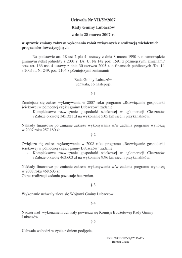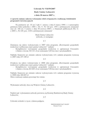 Uchwała Nr VII/59/2007 Rady Gminy Lubaczów z dnia 28 marca