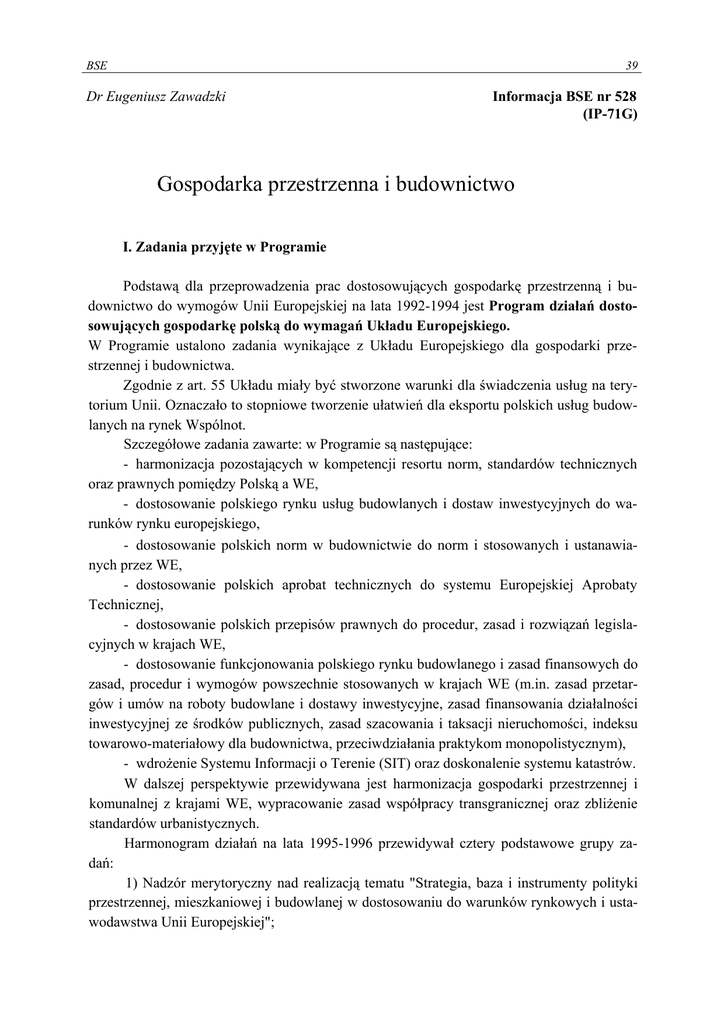 BSE 39 Dr Eugeniusz Zawadzki Informacja BSE nr 528 (IP-71G) Gospodarka przestrzenna i budownictwo I. Zadania przyjęte w Programie Podstawą dla przeprowadzenia prac dostosowujących gospodarkę przestrzenną i budownictwo do wymogów Unii Europejskiej na lata 1992-1994 jest Program działań dostosowujących gospodarkę polską do wymagań Układu Europejskiego. W Programie ustalono zadania wynikające z Układu Europejskiego dla gospodarki przestrzennej i budownictwa. Zgodnie z art. 55 Układu miały być stworzone warunki dla świadczenia usług na terytorium Unii. Oznaczało to stopniowe tworzenie ułatwień dla eksportu polskich usług budowlanych na rynek Wspólnot. Szczegółowe zadania zawarte: w Programie są następujące: - harmonizacja pozostających w kompetencji resortu norm, standardów technicznych oraz prawnych pomiędzy Polską a WE, - dostosowanie polskiego rynku usług budowlanych i dostaw inwestycyjnych do warunków rynku europejskiego, - dostosowanie polskich norm w budownictwie do norm i stosowanych i ustanawianych przez WE, - dostosowanie polskich aprobat technicznych do systemu Europejskiej Aprobaty Technicznej, - dostosowanie polskich przepisów prawnych do procedur, zasad i rozwiązań legislacyjnych w krajach WE, - dostosowanie funkcjonowania polskiego rynku budowlanego i zasad finansowych do zasad, procedur i wymogów powszechnie stosowanych w krajach WE (m.in. zasad przetargów i umów na roboty budowlane i dostawy inwestycyjne, zasad finansowania działalności inwestycyjnej ze środków publicznych, zasad szacowania i taksacji nieruchomości, indeksu towarowo-materiałowy dla budownictwa, przeciwdziałania praktykom monopolistycznym), - wdrożenie Systemu Informacji o Terenie (SIT) oraz doskonalenie systemu katastrów. W dalszej perspektywie przewidywana jest harmonizacja gospodarki przestrzennej i komunalnej z krajami WE, wypracowanie zasad współpracy transgranicznej oraz zbliżenie standardów urbanistycznych. Harmonogram działań na lata 1995-1996 przewidywał cztery podstawowe grupy zadań: 1) Nadzór merytoryczny nad realizacją tematu "Strategia, baza i instrumenty polityki przestrzennej, mieszkaniowej i budowlanej w dostosowaniu do warunków rynkowych i ustawodawstwa Unii Europejskiej"; 40 BSE 2) Prowadzenie stałego przeglądu i analiz dyrektyw Unii Europejskiej pod kątem ich powiązań z budownictwem i architekturą; 3) Harmonizację przepisów i norm budowlanych z dyrektywami Unii Europejskiej; 4) Działania integrujące w zakresie utworzenia europejskiego trójwymiarowego układu odniesień przestrzennych oraz wspólnych baz danych systemów informacji geograficznej. W zakresie gospodarki przestrzennej i komunalnej przewidywano: 1) harmonizację gospodarki przestrzennej i komunalnej z modelem wypracowanym w krajach Unii Europejskiej, wypracowanie zasad współpracy transgranicznej oraz zbliżenie standardów urbanistycznych; 2) wdrożenie Systemu Informacji o Terenie (SIT), doskonalenie systemu katastrów oraz tworzenie europejskiego trójwymiarowego układu odniesień przestrzennych; i 3) dostosowanie polskich przepisów prawnych do procedur, zasad i rozwiązań legislacyjnych funkcjonujących w krajach Unii Europejskiej. W zakresie budownictwa i gospodarki mieszkaniowej Harmonogram przewidywał: 1) dostosowanie polskiego rynku usług budowlanych (w tym mieszkaniowego), dostaw inwestycyjnych i zasad finansowania budownictwa do warunków rynku Unii Europejskiej; 2) dostosowanie eksportu usług budowlanych i czasowego przepływu osób do warunków rynku europejskiego; 3) nadzór merytoryczny nad realizacją tematu "Strategia, baza i instrumenty polityki przestrzennej, mieszkaniowej i budowlanej w dostosowaniu do warunków rynkowych i ustawodawstwa Unii Europejskiej"; 4) prowadzenie stałego przeglądu i analiz dyrektyw Unii Europejskiej pod kątem ich powiązania z budownictwem i architekturą; 5) gospodarowanie terenami pod budownictwo mieszkaniowe. Głównym celem opinii jest dokonanie oceny stopnia dopasowania gospodarki przestrzennej i rynku usług budowlanych (w tym mieszkaniowego) w Polsce do wymogów Unii Europejskiej. Niezbędna jest do tego znajomość modeli funkcjonowania tych instytucji w krajach Europy Zachodniej. BSE 41 II. Ocena stopnia zbieżności celów realizowanych w Unii Europejskiej i w Polsce w zakresie gospodarki przestrzennej i komunalnej oraz ocena stopnia realizacji Programu 1. Cele przestrzennego i komunalnego rozwoju Unii Europejskiej Przestrzenny i komunalny rozwój Unii Europejskiej oparty jest na pięciu podstawowych celach: 1) modernizacja sieci osadniczej, transportu i infrastruktury, 2) zmiany strukturalne w zagospodarowaniu przestrzennym, 3) ekologiczne uwarunkowania gospodarki przestrzennej, 4) regionalizacja gospodarki przestrzennej, 5) wzmacnianie transgranicznej współpracy na poziomie narodowym i lokalnym, włączając granice z krajami nie będącymi członkami Unii Europejskiej. 2. Kierunki działań integrujące polską przestrzeń z przestrzenią Unii Europejskiej Niski standard techniczny bazy materialnej polskiej przestrzeni powoduje, że głównym kierunkiem polityki przestrzennej państwa winna być powszechna modernizacja majątku. 2.1 Modernizacja sieci osadniczej, transportu i infrastruktury W skład prac modernizacyjnych wchodzą takie szczegółowe elementy jak: - harmonizacja rozwoju systemu osadniczego prowadząca do likwidacji powstałych dysproporcji głównie pomiędzy obszarem wschodnim i zachodnim Polski; - modernizacja rolnictwa poprzez działania zmierzające do wprowadzenia preferencji dla powiększania gospodarstw rolnych, znaczne zmniejszenie bezpośredniego zatrudnienia w rolnictwie (stworzenie minimum 1,0-1,5 min nowych miejsc pracy), wzrost nakładów kapitałowych na rolnictwo i przetwórstwo rolno-spożywcze oraz obsługę rolnictwa; - zły stan techniczny i ogromna skala "luki remontowej" infrastruktury technicznej: wymaga to przyśpieszonej modernizacji i rozbudowy już