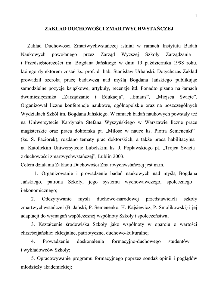 1 ZAKŁAD DUCHOWOŚCI ZMARTWYCHWSTAŃCZEJ Zakład Duchowości Zmartwychwstańczej istniał w ramach Instytutu Badań Naukowych powołanego przez Zarząd Wyższej Szkoły Zarządzania i Przedsiębiorczości im. Bogdana Jańskiego w dniu 19 października 1998 roku, którego dyrektorem został ks. prof. dr hab. Stanisław Urbański. Dotychczas Zakład prowadził szeroką pracę badawczą nad myślą Bogdana Jańskiego publikując samodzielne pozycje książkowe, artykuły, recenzje itd. Ponadto pisano na łamach dwumiesięcznika „Zarządzanie i Edukacja”, „Emaus”, „Miejsca Święte”. Organizował liczne konferencje naukowe, ogólnopolskie oraz na poszczególnych Wydziałach Szkół im. Bogdana Jańskiego. W ramach badań naukowych powstały też na Uniwersytecie Kardynała Stefana Wyszyńskiego w Warszawie liczne prace magisterskie oraz praca doktorska pt. „Miłość w nauce ks. Piotra Semenenki” (ks. S. Paciorek), rozdano tematy prac doktorskich, a także praca habilitacyjna na Katolickim Uniwersytecie Lubelskim ks. J. Popławskiego pt. „Trójca Święta z duchowości zmartwychwstańczej”, Lublin 2003. Celem działania Zakładu Duchowości Zmartwychwstańczej jest m.in.: 1. Organizowanie i prowadzenie badań naukowych nad myślą Bogdana Jańskiego, patrona Szkoły, jego systemu wychowawczego, społecznego i ekonomicznego; 2. Odczytywanie myśli duchowo-narodowej przedstawicieli szkoły zmartwychwstańczej (B. Jański, P. Semenenko, H. Kajsiewicz, P. Smolikowski) i jej adaptacji do wymagań współczesnej wspólnoty Szkoły i społeczeństwa; 3. Kształcenie środowiska Szkoły jako wspólnoty w oparciu o wartości chrześcijańskie: eklezjalne, patriotyczne, duchowo-kulturalne; 4. Prowadzenie doskonalenia formacyjno-duchowego studentów i wykładowców Szkoły; 5. Opracowywanie programu formacyjnego poprzez sondaż opinii i poglądów młodzieży akademickiej; 2 6. Analiza procesów zachodzących w kształtowaniu postaw studentów. I. Działalność w ramach Roku Jańskiego 1. ROK JAŃSKIEGO otworzył dnia 11 października 1999 r. Prowincjał Zgromadzenia Księży Zmartwychwstańców ks. Adam Piasecki na inauguracji roku akademickiego 1999/2000 w Wyższej Szkole Zarządzania i Przedsiębiorczości im. Bogdana Jańskiego w Warszawie, której Założycielem jest ks. Marian Piwko – w obecności zaproszonych gości, grona profesorskiego, pracowników Szkoły i studentów. Na czele obchodów Roku Jańskiego stanął ks. Prowincjał Adam Piasecki oraz ks. Założyciel Marian Piwko CR. Realizację prowadził Instytut Badań Naukowych WSZiP, kierowany przez ks. Stanisława Urbańskiego. Rok Jańskiego miał na celu przybliżenie tej postaci Sługi Bożego, kandydata do beatyfikacji. Jako żarliwy katolik, wielki patriota może być on wzorem do naśladowania dla współczesnego człowieka i wzorem na drodze do duchowego odrodzenia Europy. W dniu dorocznego Święta Szkoły, 8 grudnia 1999 r. miał miejsce panel poświęcony Bogdanowi Jańskiemu, prowadzony przez dyrektora Instytutu Badań Naukowych ks. prof. dr. hab. Stanisława Urbańskiego, – w którym wzięli udział: kanclerz WSZiP Zbigniew Jacniacki, prof. dr hab. Tadeusz Klimski, kierownik Biura Zarządu WSZiP Gerard Kowalski, prodziekan Wydziału Zarządzania WSZiP w Warszawie dr Tomasz Ochinowski, mgr Elżbieta Połomska, mgr Marek Połomski, dr Krzysztof Wojcieszek oraz przedstawiciel samorządu studenckiego Grzegorz Moszczyński. Uczestnicy panelu wskazywali na charakterystyczne i bliskie im osobiście rysy życia i działalności Jańskiego. Szczególnie podkreślali jego aktywność na polu życia religijnego i politycznego oraz edukacyjnego na emigracji – w perspektywie celu, jakim było odrodzenie Polski. W spotkaniu udział wzięli pracownicy naukowi i studenci. W ramach działalności Zakładu Duchowości Zmartwychwstańczej WSZiP im. Bogdana Jańskiego w Warszawie, w siedzibie WSZiP przy ul. Chełmskiej 21a 3 została zorganizowana wystawa publikacji poświęconych Bogdanowi Jańskiemu (biografie, antologie pism, opracowania, artykuły, czasopisma itd.) – przygotowana przez ks. prof. dr. hab. Stanisława Urbańskiego, która prezentowała prace różnych autorów oraz osobiste opracowania ks. prof. Urbańskiego. Wystawa obejmowała prawie wszystkie publikacje, jakie ukazały się na temat B. Jańskiego w języku polskim (w sumie 82 pozycje). Ukazały się też liczne artykuły w miesięczniku WSZiP w Warszawie „Emaus 2000” – poświęcone Bogdanowi Jańskiemu. W numerze 10 (11) z października 1999 r. opublikowany został artykuł ks. prof. S. Urbańskiego „Bogdan Jański – wzór osobowy trzeciego tysiąclecia” oraz artykuł ks. dr Bolesława Micewskiego „Jański wobec polityki i stronnictw – cz. 1”. W marcowym numerze „Emaus 2000” (nr 3 [4]) ukazał się wywiad Gerarda Kowalskiego z ks. Jerzym Mrówczyńskim „O Jańskim i nie tylko”. W numerze majowym tegoż miesięcznika (5 [6]) zamieszczony został artykuł mgr Marka Połomskiego, zawierający syntetyczny życiorys założyciela zmartwychwstańców pt. „Bogdan Jański”. Ks. S. Urbański przedstawił informację nt. Roku Jańskiego w wakacyjnym numerze „Emaus” z 2000 r. (nr 2-3 [21-22]). W tym samym numerze opublikowane zostało kalendarium Bogdana Jańskiego oraz opowiadanie na kanwie jego życia autorstwa Moniki Rotulskiej pt.: „Odnaleziona droga”. W listopadowym numerze miesięcznika „Miejsca Święte” z 1999 r. (nr 11 [35]) została wyakcentowana i obszernie przedstawiona tematyka, związana z Rokiem Jańskiego – stanowiąc zasadniczą treść tego numeru. O postaci Jańskiego oraz o aplikacji jego myśli do wyzwań współczesności opowiedział w udzielonym przez siebie wywiadzie ks. Marian Piwko CR – założyciel Wyższej Szkoły Zarządzania i Przedsiębiorczości im. Bogdana Jańskiego. O duchowości zmartwychwstańczej w kontekście polskiej szkoły duchowości mówił w wywiadzie ks. prof. dr. h