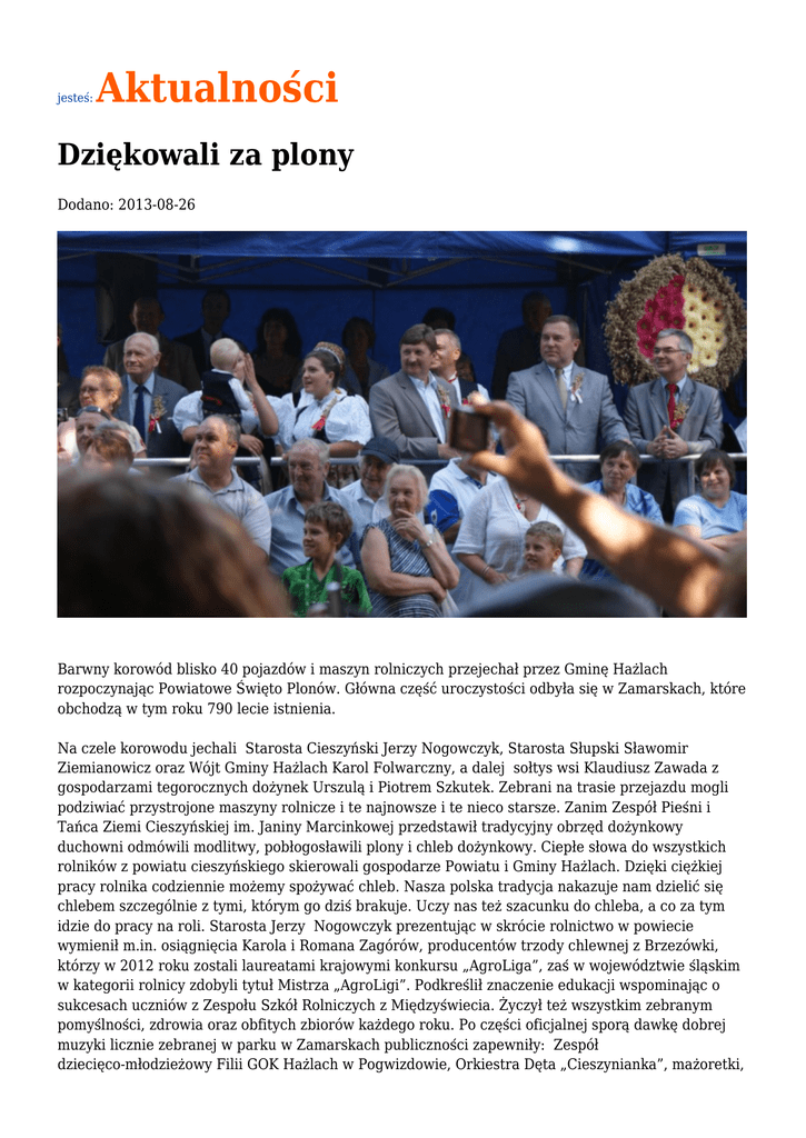 jesteś: Aktualności Dziękowali za plony Dodano: 2013-08-26 Barwny korowód blisko 40 pojazdów i maszyn rolniczych przejechał przez Gminę Hażlach rozpoczynając Powiatowe Święto Plonów. Główna część uroczystości odbyła się w Zamarskach, które obchodzą w tym roku 790 lecie istnienia. Na czele korowodu jechali Starosta Cieszyński Jerzy Nogowczyk, Starosta Słupski Sławomir Ziemianowicz oraz Wójt Gminy Hażlach Karol Folwarczny, a dalej sołtys wsi Klaudiusz Zawada z gospodarzami tegorocznych dożynek Urszulą i Piotrem Szkutek. Zebrani na trasie przejazdu mogli podziwiać przystrojone maszyny rolnicze i te najnowsze i te nieco starsze. Zanim Zespół Pieśni i Tańca Ziemi Cieszyńskiej im. Janiny Marcinkowej przedstawił tradycyjny obrzęd dożynkowy duchowni odmówili modlitwy, pobłogosławili plony i chleb dożynkowy. Ciepłe słowa do wszystkich rolników z powiatu cieszyńskiego skierowali gospodarze Powiatu i Gminy Hażlach. Dzięki ciężkiej pracy rolnika codziennie możemy spożywać chleb. Nasza polska tradycja nakazuje nam dzielić się chlebem szczególnie z tymi, którym go dziś brakuje. Uczy nas też szacunku do chleba, a co za tym idzie do pracy na roli. Starosta Jerzy Nogowczyk prezentując w skrócie rolnictwo w powiecie wymienił m.in. osiągnięcia Karola i Romana Zagórów, producentów trzody chlewnej z Brzezówki, którzy w 2012 roku zostali laureatami krajowymi konkursu „AgroLiga”, zaś w województwie śląskim w kategorii rolnicy zdobyli tytuł Mistrza „AgroLigi”. Podkreślił znaczenie edukacji wspominając o sukcesach uczniów z Zespołu Szkół Rolniczych z Międzyświecia. Życzył też wszystkim zebranym pomyślności, zdrowia oraz obfitych zbiorów każdego roku. Po części oficjalnej sporą dawkę dobrej muzyki licznie zebranej w parku w Zamarskach publiczności zapewniły: Zespół dziecięco-młodzieżowy Filii GOK Hażlach w Pogwizdowie, Orkiestra Dęta „Cieszynianka”, mażoretki, Męski Zespół Śpiewaczy przy OSP w Zamarskach oraz Zespół Regionalny „Wielokończanie” z Kończyc Wielkich. Uroczystość nie zakończyła się jednak tylko na podziwianiu, ponieważ po występach artystycznych wszyscy zostali zaproszeni do zabawy tanecznej. Razem z rolnikami z powiatu cieszyńskiego w Zamarskach świętowali zaproszeni goście. Wśród nich znaleźli się m.in: Poseł do Parlamentu Europejskiego Jan Olbrycht, Posłowie na Sejm RP; Aleksandra Trybuś, Czesław Gluza, Stanisław Szwed, Stanisław Pięta, Radny Sejmiku Woj. Ślaskiego Jan Kawulok, Wójtowie i Burmistrzowie, Radni Powiatu Cieszyńskiego, Radni Gminy Hażlach, Biskup Diecezji Cieszyńskiej Kościoła Ewangelicko-Augsburskiego ks. bp Paweł Anweiler, duchowni, przedstawiciele różnych instytucji, organizacji i służb. Gośćmi specjalnymi imprezy była delegacja władz Powiatu Słupskiego, ze Starostą Sławomirem Ziemianowiczem, Wicestarostą Andrzejem Burym oraz Sekretarzem Ireną Tkaczuk-Kawalerowicz, z którym Powiat Cieszyński współpracuje. Wszystkim, którzy mieli swój udział w przygotowaniu tego szczególnego wydarzenia serdecznie dziękujemy!!! Rolnikom życzymy, aby tak pięknych, słonecznych dni było w ich życiu jak najwięcej. Źródło: www.powiat.cieszyn.pl