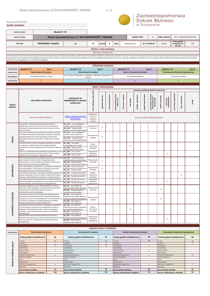 Moduł specjalnościowy (1) RACHUNKOWOŚĆ I FINANSE 1/2 obowiązuje od: 2015/2016 karta modułu Moduł E/ 10 numer modułu Moduł specjalnościowy (1) RACHUNKOWOŚĆ I FINANSE nazwa modułu EKONOMIA I stopień kierunek III rok punkty ECTS 5 semestr obligatoryjny status 16 lider modułu liczba godzin kontaktowych łącznie polski jęz. wykładowy dr D. Majewska-Bielecka 104 ISTOTA I CELE MODUŁU Krótki opis i katalog celów Istotą modułu jest zrozumienie zależności między rachunkowością finansową a rachunkowością zarządczą, a także między finansowaniem działalności gospodarczej a dostępnymi na rynku instrumentami finansowymi. Celem modułu jest przedstawienie możliwości informacyjnych rachunkowości finansowej dla celów zarządzania firmą i podejmowania decyzji, a także wielości rozwiązań w zakresie pozyskiwania źródeł do finansowania działalności gospodarczej oraz szans i zagrożeń wynikających z charakteru rynku finansowego. Zakres modułu stanowi dobre podstawy dla pracowników działów finansowo-księgowych oraz samodzielnych księgowych. STRUKTURA MODUŁU numer kursu Moduł E/ 10 kurs 1 Moduł E/ 10 kurs 2 Moduł E/ 10 kurs 3 Moduł E/ 10 kurs 4 nazwa kursu Rachunkowość finansowa Rachunkowość zarządcza Rynek i instrumenty finansowe Finansowanie działalności gospodarczej prowadzący dr D. Majewska-Bielecka, + praktyk dr A. Turczak, M. Skulmowski, J. Włodarek, I. Majchrzak, J. Bamberska, P. Pietrzak dr D. Majewska-Bielecka dr M. Bzunek + praktyk punkty ECTS 5 5 3 3 WIEDZA UMIEJĘTNOŚCI KOMPETENCJE SPOŁECZNE Zna wymogi i zasady prowadzenia ksiąg rachunkowych i obowiązujące przepisy w tym zakresie, rozumie rozwiązania ewidencyjne operacji gospodarczych oraz ich wpływ na bilans i wynik finansowy. Zna system gromadzenia, opracowania i prezentacji informacji finansowych i operacyjnych dotyczących przeszłych i przyszłych zjawisk gospodarczych w celu wspomagania kierownictwa jednostki gospodarczej w planowaniu, podejmowaniu decyzji i kontroli. Rozumie znaczenie rynku finansowego w gospodarce rynkowej, zna segmenty i podmioty rynku finansowego, klasyfikuje instrumenty finansowe według kryterium rentowności, płynności i ryzyka. Zna formy i żródła finansowania działalności gospodarczej, rozumie pojęcie kapitału własnego i kapitału obcego, a także rozróżnia sposoby finansowania krótko- i długotermnowego. Potrafi opracować plan kont na potrzeby jednostki, potrafi odnieść ogólne zasady rachunkowości do rozwiązywania zadań problemowych z zakresu ewidencji syntetycznej i analitycznej, a także opracowuje sprawozdania obligatoryjne. Potrafi identyfikować, sklasyfikować, syntetyzować i analizować informacje, głównie z rachunkowości finansowej, dla procesu podejmowania decyzji w jednostce gospodarczej. Potrafi dokonać obserwacji i interpretacji zjawisk finansowych oraz posiada umiejętność oceny tych zjawisk, a także potrafi wskazać przyczyny i skutki określonych zachowań na rynku finansowym. Potrafi dokonać wyboru optymalnej formy i źródła finansowania określonej działalności gospodarczej, a także przeprowadzić analizę struktury kapitału i ocenić kondycję finansową podmiotu. Zachowuje należytą starnność, odpowiedzialność i uczciwość wykonując zadania polegające na samodzielnym lub grupowym rozwiązywaniu moralnych dylematów związanych z wykonywaniem zawodu księgowego. KE1_W13 Posiada pogłębioną wiedzę w zakresie wybranej specjalności;Posiada zna podstawowe KE1_W14 wiedzę praktyczną, umożliwiającą podjęcie pracy zawodowej lubpogłębioną działalności KE1_W13 Posiada wiedzę w zakresie wybranej specjalności; zna podstawowe KE1_W14 Posiada wiedzę praktyczną, umożliwiającą podjęcie pracy zawodowej lub działalności KE1_W03 Ma wiedzę umożliwiającą ocenę zjawisk ekonomicznych i powiązań KE1_W05 Posiada wiedzęmiędzy umożliwiającą krytyczną ocenę KE1_W07 Zna i rozumie podstawy tworzenia, organizacji, KE1_W08 Zna i rozumie podstawowe mechanizmy KE1_U06 Potrafi zastosować wiedzę teoretyczną w określonym obszarze zjawisk ekonomicznych, w KE1_U15 Posiada wiedzę praktyczną, umożliwiającą podjęcie pracy zawodowej działalności KE1_U06 Potrafilub zastosować wiedzę teoretyczną w określonym KE1_U15 Posiada wiedzę praktyczną, umożliwiającą podjęcie KE1_U01 Potrafi wykorzystywać podstawową wiedzę teoretyczną z KE1_U02 Posiada elementarne umiejętności badawcze KE1_U02 Posiada elementarne umiejętności badawcze KE1_U08 Posiada umiejętność formułowania praktycznych KE1_K01 Ma świadomość poziomu swojej wiedzy, dokonuje samoocenyPostępuje własnych kompetencji, KE1_K06 zgodnie z zasadami etyki zawodowej, z poszanowaniem praw autorskich, KE1_K01 Ma świadomość poziomu swojej wiedzy, dokonuje samooceny własnych kompetencji, nabytą wiedzę i umiejętności KE1_K03 Myśli logicznie i analitycznie, jest zdolny do samodzielnej pracy badawczej, KE1_K02 Jest świadomy złożoności procesów zachodzących we współczesnej gospodarce KE1_K03 Myśli logicznie i analitycznie, jest zdolny do samodzielnej pracy badawczej, KE1_K02 Jest świadomy złożoności procesów zachodzących we współczesnej gospodarce KE1_K03 Myśli logicznie i Jest świadomy konieczności dostosowania przygotowywanej informacji do potrzeb wewnętrznych użytkowników jednostki gospodarczej, a także do spoczywającej na nim odpowiedzialności za rzetelność i obiektywizm przygotowywanych materiałów służących podejmowaniu decyzji menadżerskich. Jest świadomy złożoności procesów zachodzących na globalnym rynku finansowym, jest zdolny do samodzielnej ich oceny na podstawie przeprowadzonej analizy, a także do wyciągania wniosków, a nawet prognozowania wybranych parametrów ekonomicznych. Ma świadomość zróżnicowanych możliwości finansowania działalności gospodarczej, jest zdolny do samodzielnej oceny danej formy finansowania i jej dopasowania do dane