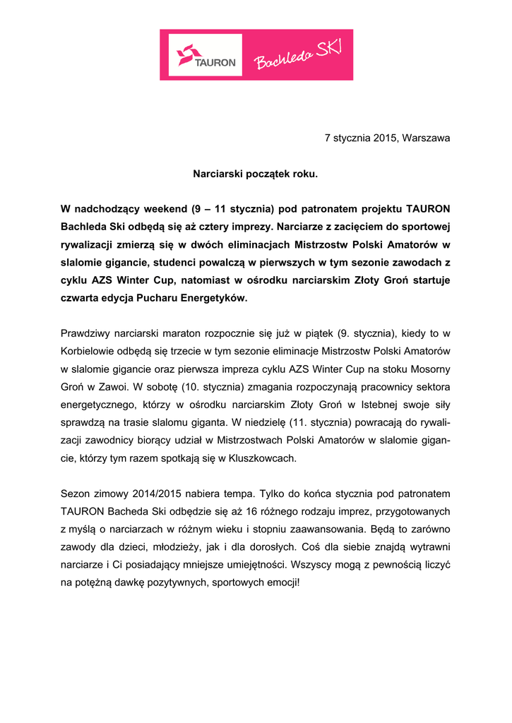 7 stycznia 2015, Warszawa Narciarski początek roku. W nadchodzący weekend (9 – 11 stycznia) pod patronatem projektu TAURON Bachleda Ski odbędą się aż cztery imprezy. Narciarze z zacięciem do sportowej rywalizacji zmierzą się w dwóch eliminacjach Mistrzostw Polski Amatorów w slalomie gigancie, studenci powalczą w pierwszych w tym sezonie zawodach z cyklu AZS Winter Cup, natomiast w ośrodku narciarskim Złoty Groń startuje czwarta edycja Pucharu Energetyków. Prawdziwy narciarski maraton rozpocznie się już w piątek (9. stycznia), kiedy to w Korbielowie odbędą się trzecie w tym sezonie eliminacje Mistrzostw Polski Amatorów w slalomie gigancie oraz pierwsza impreza cyklu AZS Winter Cup na stoku Mosorny Groń w Zawoi. W sobotę (10. stycznia) zmagania rozpoczynają pracownicy sektora energetycznego, którzy w ośrodku narciarskim Złoty Groń w Istebnej swoje siły sprawdzą na trasie slalomu giganta. W niedzielę (11. stycznia) powracają do rywalizacji zawodnicy biorący udział w Mistrzostwach Polski Amatorów w slalomie gigancie, którzy tym razem spotkają się w Kluszkowcach. Sezon zimowy 2014/2015 nabiera tempa. Tylko do końca stycznia pod patronatem TAURON Bacheda Ski odbędzie się aż 16 różnego rodzaju imprez, przygotowanych z myślą o narciarzach w różnym wieku i stopniu zaawansowania. Będą to zarówno zawody dla dzieci, młodzieży, jak i dla dorosłych. Coś dla siebie znajdą wytrawni narciarze i Ci posiadający mniejsze umiejętności. Wszyscy mogą z pewnością liczyć na potężną dawkę pozytywnych, sportowych emocji! Więcej informacji i kalendarz wydarzeń znaleźć można na stronie internetowej www.tauronbachledaski.pl oraz pod adresem facebook.com/TauronBachledaSki. Andrzej Lesiewski [email protected] +48 512 348 232 TAURON Polska Energia SA jest spółką holdingową w grupie kapitałowej, która zajmuje się wydobyciem węgla, wytwarzaniem, dystrybucją i sprzedażą energii. Grupa TAURON wraz z GZE obejmuje swoim działaniem 18 proc. powierzchni kraju i jest jednym z największych podmiotów gospodarczych w Polsce, posiadającym 5,2 mln klientów. W skład Grupy TAURON wchodzą m.in. TAURON Wytwarzanie, TAURON Dystrybucja, TAURON Sprzedaż, TAURON Obsługa Klienta, Południowy Koncern Węglowy, TAURON Ciepło, TAURON Ekoenergia oraz spółki należące do GZE. Andrzej Bachleda-Curuś II – (ur. 2 stycznia 1947 roku w Zakopanem) to najbardziej utytułowany polski narciarz alpejski. Dwukrotnie reprezentował Polskę na Igrzyskach Olimpijskich – w 1968 roku w Grenoble, gdzie zdobył 6. lokatę w slalomie specjalnym oraz w Sapporo w roku 1972, plasując się na 9. pozycji w slalomie gigancie. W jego kolekcji znajdują się też medale Narciarskich Mistrzostw Świata - brąz za kombinację alpejską w Val Gardena w 1970 roku oraz srebro zdobyte w 1974 w St. Moritz w tej samej konkurencji. Wybitnym wynikiem było też 2. miejsce w slalomowej klasyfikacji Pucharu Świata i 6. miejsce w klasyfikacji generalnej w sezonie 1971/1972. Andrzej Bachleda-Curuś wielokrotnie tryumfował też na Zimowych Uniwersjadach i Spartakiadach Armii Zaprzyjaźnionych. Na najwyższym podium Mistrzostw Polski stawał aż 14 razy. W trakcie swojej kariery ścigał się z największymi legendami narciarstwa alpejskiego, takimi jak Jean Claude Killy czy Gustavo Thöni. Jest pierwszym Polakiem uhonorowanym prestiżową nagrodą „Fair Play” przyznawaną przez UNESCO. W 2009 roku otrzymał Krzyż Kawalerski Orderu Odrodzenia Polski.