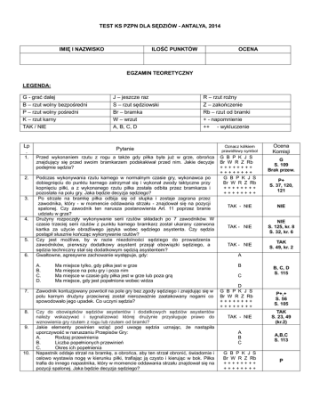 TEST KS PZPN DLA SĘDZIÓW - ANTALYA, 2014 IMIĘ I NAZWISKO ILOŚĆ PUNKTÓW OCENA EGZAMIN TEORETYCZNY LEGENDA: G - grać dalej B – rzut wolny bezpośredni P – rzut wolny pośredni K – rzut karny TAK / NIE Lp . J – jeszcze raz S – rzut sędziowski Br – bramka W – wrzut A, B, C, D R – rzut rożny Z – zakończenie Rb – rzut od bramki + - napomnienie ++ - wykluczenie Pytanie 1. Przed wykonaniem rzutu z rogu a także gdy piłka była już w grze, obrońca znajdujący się przed swoim bramkarzem podskakiwał przed nim. Jakie decyzje podejmie sędzia? 2. Podczas wykonywania rzutu karnego w normalnym czasie gry, wykonawca po dobiegnięciu do punktu karnego zatrzymał się i wykonał zwody taktyczne przy kopnięciu piłki, a z wykonanego rzutu piłka została odbita przez bramkarza i pozostała na polu gry. Jaka będzie decyzja sędziego? Po strzale na bramkę piłka odbija się od słupka i zostaje zagrana przez zawodnika, który - w momencie oddawania strzału - znajdował się na pozycji spalonej. Czy zawodnik ten narusza postanowienia Art. 11 poprzez branie udziału w grze? Drużyny rozpoczęły wykonywanie serii rzutów składach po 7 zawodników. W czasie trzeciej serii rzutów z punktu karnego bramkarz został ukarany czerwona kartka za użycie obraźliwego języka wobec sędziego asystenta. Czy sędzia postąpił słusznie kończąc wykonywanie rzutów? Czy jest możliwe, by w razie niezdolności sędziego do prowadzenia zawodników, pierwszy dodatkowy asystent przejął obowiązki sędziego, a sędzia techniczny stał się dodatkowym sędzią asystentem? Gwałtowne, agresywne zachowanie występuje, gdy: 3. 4. 5. 6. A. B. C. D. Ma miejsce tylko, gdy piłka jest w grze Ma miejsce na polu gry i poza nim Ma miejsce w czasie gdy piłka jest w grze lub poza grą Ma miejsce, gdy jest popełnione wobec widza 7. Zawodnik kontuzjowany powrócił na pole gry bez zgody sędziego i znajdując się w polu karnym drużyny przeciwnej został nierozważnie zaatakowany nogami co spowodowało jego upadek. Co uczyni sędzia? 8. Czy do obowiązków sędziów asystentów i dodatkowych sędziów asystentów należy wskazywać i sygnalizować której drużynie przysługuje prawo do wznowienia gry rzutem z rogu lub rzutem od bramki? Jakie elementy powinien wziąć pod uwagę sędzia uznając, że nastąpiła uporczywość w naruszaniu Przepisów Gry: A. Rodzaj przewinienia B. Liczba popełnionych przewinień C. Okres ich popełnienia Napastnik oddaje strzał na bramkę, a obrońca, aby ten strzał obronić, świadomie i celowo wystawia nogę w kierunku piłki, trafiając ją czysto i kierując w bok. Piłka trafia do innego napastnika, który w momencie oddawania strzału znajdował się na pozycji spalonej. Jaka będzie decyzja sędziego? 9. 10. Oznacz kółkiem prawidłowy symbol G B P K J S Br W R Z Rb ++++++++ ++++++++ G B P K J S Br W R Z Rb ++++++++ ++++++++ Ocena Komisji G S. 109 Brak przew. P+ S. 37, 120, 121 TAK - NIE NIE TAK - NIE NIE S. 125, kr. 8 S. 32, kr. 6 TAK - NIE TAK S. 49, kr. 2 A B C D G B P K J S Br W R Z Rb ++++++++ ++++++++ B, C, D S. 115 P+,+ S. 56 S. 105 TAK - NIE TAK S. 23, 49 (kr.2) A B C A,B,C S. 113 G B P K J S Br W R Z Rb ++++++++ ++++++++ P TEST KS PZPN DLA SĘDZIÓW - ANTALYA, 2014 LEGENDA: G - grać dalej B – rzut wolny bezpośredni P – rzut wolny pośredni K – rzut karny TAK / NIE Lp . 11. 12 . 13 . 14 . 15 . J – jeszcze raz S – rzut sędziowski Br – bramka W – wrzut A, B, C, D R – rzut rożny Z – zakończenie Rb – rzut od bramki + - napomnienie ++ - wykluczenie Pytanie W 55 minucie zawodów sędzia stwierdził, że na polu gry znajduje się zawodnik rezerwowy zamiast innego zgłoszonego zawodnika. Przerwał grę i chciał udzielić napomnienia winnemu zawodnikowi. Widząc to kapitan podbiegł do sędziego informując, że zamiana została dokonana przed rozpoczęciem drugiej połowy. Co uczyni sędzia, jeżeli informacja kapitana była prawdziwa? W drugiej minucie gry, w środkowej strefie boiska zawodnik gości nieostrożnie podstawił nogę przeciwnikowi. Sędzia odgwizdał przewinienie a faulujący zawodnik z premedytacją uniemożliwiał szybkie wykonanie rzutu zawodnikowi gospodarzy. Jakie decyzje powinien podjąć sędzia, biorąc pod uwagę fakt, że było to pierwsze przewinienie w meczu: A. Rzut wolny bezpośredni oraz widoczna reprymenda słowna B. Rzut wolny bezpośredni oraz żółta kartka C. Rzut wolny bezpośredni Kierownik drużyny gospodarzy przed rozpoczęciem zawodów poinformował sędziów, że z powodu chwilowych problemów zdrowotnych zawodnik rezerwowy nr 11 zajmie miejsce w pierwszym składzie w miejsce zawodnika nr 20, który usiądzie na ławce jako zawodnik rezerwowy. Sędzia nie przychylił się do prośby kierownika. Czy postąpił słusznie? Oznacz kółkiem prawidłowy symbol G B P K J S Br W R Z Rb ++++++++ ++++++++ Ocena Komisji S S. 16 A B C B S. 119 TAK - NIE NIE S. 136/7a W momencie zagrania piłki przez napastnika, jego współpartner znajduje na pozycji spalonej i rozpoczyna bieg w stronę linii bramkowej, aby dojść do podania i znaleźć się w bramkowej sytuacji. Piłka ostatecznie trafia do współpartnera, jednak w międzyczasie jest dotknięta przez obrońcę, który próbował przeciąć podanie. Napastnik zdobywa bramkę, a obrońca czynnie okazuje niezadowolenie z decyzji sędziego. Co uczyni sędzia?. G B P K J S Br W R Z Rb Zawodnik wykonujący rzut karny w trakcie dobiegania do piłki wykonuje zwody taktyczne w celu zdezorientowania bramkarza. Natomiast współpartner bramkarza po sygnale gwizdka sędziego na wykonanie rzutu, ale przed zagraniem piłki przez wykonawcę, wchodzi w pole karne. Z wykonanego rzutu pada bramka. Co winien uczynić sędzia? G B P K J S Br W R Z Rb ++++++++ ++++++++ ++++++++ ++++++++ BR + BR S. TEST KS PZPN DLA SĘDZIÓW - ANTALYA, 2014 16 . 17 . 18 . 19 . 20 . W wyniku wzajemnego jednoczesnego ataku na piłkę w powietrzu nastąpiło zderzenie głowami zawodni