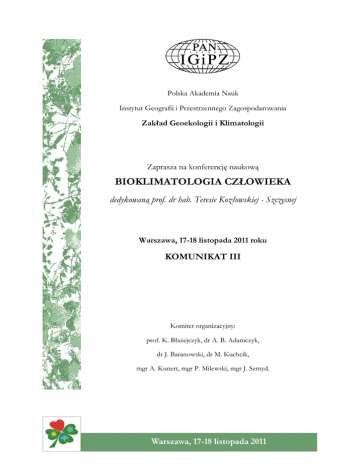 Polska Akademia Nauk Instytut Geografii i Przestrzennego Zagospodarowania Zakład Geoekologii i Klimatologii Zaprasza na konferencję naukową BIOKLIMATOLOGIA CZŁOWIEKA dedykowaną prof. dr hab. Teresie Kozłowskiej - Szczęsnej Warszawa, 17-18 listopada 2011 roku KOMUNIKAT III Komitet organizacyjny: prof. K. Błażejczyk, dr A. B. Adamczyk, dr J. Baranowski, dr M. Kuchcik, mgr A. Kunert, mgr P. Milewski, mgr J. Szmyd. Szanowni Państwo, Przekazujemy dalsze informacje o Konferencji Naukowej „Bioklimatologia człowieka”, która odbędzie się w dniach 17-18 listopada 2011 roku w siedzibie IGiPZ PAN w Warszawie, przy ul. Twardej 51/55. Uroczyste rozpoczęcie Konferencji nastąpi w czwartek 17 listopada 2011 r. o godz. 9:30 w Sali seminaryjnej na VI piętrze. Planowany program konferencji: 17.11.2011 CZWARTEK 8:00 – 9:30 rejestracja uczestników (IGiPZ PAN, ul.Twarda 51/55) 9:30 – 10:00 otwarcie Konferencji: prof. dr hab. T. Kozłowska-Szczęsna o Błażejczyk K.: Nowe trendy w bioklimatologii człowieka 10:00 – 11:20 I sesja, referatowa o Bröde P., Krüger E. L.: Analysing Urban Thermal Comfort by the Universal Thermal Climate Index UTCI o Jaskulski K.: Bioklimatyczna charakterystyka Polski na podstawie wskaźnika UTCI o Chabior M.: Próba oceny zmian bioklimatu Pomorza w 40-leciu 1966-2005 o Bąkowska M.: Zmienność wieloletnia warunków bioklimatycznych w Polsce na przykładzie wskaźnika UTCI 11:20 - 11:40 przerwa na kawę, herbatę 11:40 - 13:00 II sesja, referatowa o Baranowski J., Błażejczyk K.: Wpływ hałasu na zdrowie człowieka o Wieczorek J.: Wpływ wybranych cech oświetlenia na produkcję melatoniny w warunkach dnia polarnego o Wieczorek Ł.: Zależność pomiędzy środowiskiem atmosferycznym a wybitnymi osiągnięciami wśród uczestników Letnich Igrzysk Olimpijskich w latach 1936-2008 o Idzikowska D.: Związek warunków biotermicznych z umieralnością 13:00 - 14:30 przerwa obiadowa 14:30 - 16:00 III sesja, posterowa 16:00 - 16:20 przerwa na kawę, herbatę 16:20 - 17:40 IV sesja, referatowa o Czarnecki W.: Noce uciążliwe termicznie w Poznaniu w skali topoklimatycznej o Twardosz R.: Gorące sezony letnie w Europie w pierwszym 10-leciu XXI wieku o Araźny A.: Warunki biometeorologiczne w regionie Forlandsundet (NW Spitsbergen) w sezonie letnim 2010 r. o Owczarek M.: Cyrkulacyjne uwarunkowania odczucia gorąca latem w Polsce według Fizjologicznej temperatury odczuwalnej (PST), 1951-2008 (Rezultaty Projektu KLIMAT) 19:00 uroczysta kolacja 18.11.2011 PIĄTEK 9:00 - 10:20 V sesja, referatowa o Milewski P.: Warunki bioklimatyczne Ziemi Kłodzkiej o Jarzyna K.: Zróżnicowanie warunków biometeorologicznych w profilu Łysogór o Miszuk B., Otop I., Owczarek M.: Warunki bioklimatyczne jako czynnik kształtujący potencjał rekeracyjny Sudetów o Limanówka D.: Ocena warunków klimatycznych i walory bioklimatyczne Tatr (w pierwszej dekadzie XXI wieku) 10:20 - 10:40 przerwa na kawę, herbatę 10:40 - 12:20 VI sesja, referatowa o Matuszko D., Piotrowicz K.: Wieloletnia zmienność sytuacji meteorotropowych w Krakowie o Dobek M.: Zróżnicowanie biotermiczne Lublina w latach 2009-2010 o Drzeniecka-Osiadacz A., Sikora S.: Ocena bodźcowości środowiska obszarów zurbanizowanych: analiza stężenia pyłu zawieszonego (PM2.5) i warunków biometeorologicznych na przykładzie Wrocławia o Lindner-Cendrowska K.: Metody oceny warunków bioklimatycznych na potrzeby turystyki i rekreacji na przykładzie Warszawy o Fortuniak K., Pawlak W.: Ekstremalne porywy wiatru - wybrane wnioski z pomiarów anemometrem akustycznym 12:20 zakończenie Konferencji Uprzejmie przypominamy, że czas przeznaczony na wygłoszenie referatu wynosi 20 minut (w tym zawarty jest też czas na dyskusję). W trakcie sesji posterowej przewidujemy 2-3-minutowe referowanie posterów. Postery nie mogą przekraczać wymiarów: 80x115 cm (orientacja pionowa). Bardzo prosimy o przygotowanie podpisów pod rycinami zamieszczonymi w swoich prezentacjach także w języku angielskim aby goście z zagranicy mogli zapoznać się z treścią wystąpienia. Referat może być wygłoszony po polsku lub po angielsku. II Szkoła Bioklimatologii W dniu 16 listopada 2011 roku odbędą się warsztaty w ramach II Szkoły Bioklimatologii Człowieka. Zajęcia będą miały miejsce w budynku IGiPZ PAN w Warszawie przy ul. Twardej 51/55 w Sali seminaryjnej na parterze. Zajęcia rozpoczną się o godzinie 10:30 i potrwają do godziny 18:00. Planowane są warsztaty z następujących dziedzin: o o o o Nowe metody i wskaźniki badań bioklimatycznych (UTCI, BCI, CTIS, CIT) Metody prezentacji warunków bioklimatycznych na mapach Wpływ klimatu na zdrowie człowieka (podstawy, metody badań) Charakterystyki bioklimatyczne terenów zurbanizowanych W ramach zajęć przewidziane są ćwiczenia, dlatego prosimy o zabranie ze sobą komputerów osobistych.