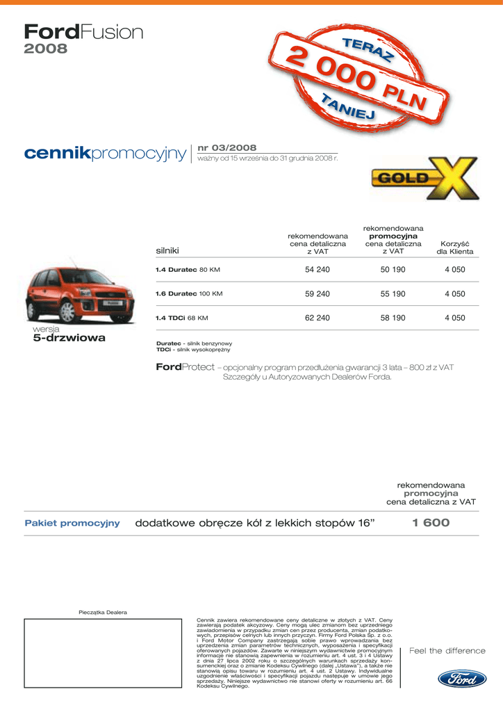 FordFusion 2008 T cennikpromocyjny A NI EJ nr 03/2008 wa˝ny od 15 wrzeÊnia do 31 grudnia 2008 r. rekomendowana cena detaliczna z VAT rekomendowana promocyjna cena detaliczna z VAT KorzyÊç dla Klienta 1.4 Duratec 80 KM 54 240 50 190 4 050 1.6 Duratec 100 KM 59 240 55 190 4 050 1.4 TDCi 68 KM 62 240 58 190 4 050 silniki wersja 5-drzwiowa Duratec - silnik benzynowy TDCi - silnik wysokopr´˝ny FordProtect – opcjonalny program przed∏u˝enia gwarancji 3 lata – 800 z∏ z VAT Szczegó∏y u Autoryzowanych Dealerów Forda. rekomendowana promocyjna cena detaliczna z VAT Pakiet promocyjny dodatkowe obr´cze kó∏ z lekkich stopów 16” Pieczàtka Dealera Cennik zawiera rekomendowane ceny detaliczne w z∏otych z VAT. Ceny zawierajà podatek akcyzowy. Ceny mogà ulec zmianom bez uprzedniego zawiadomienia w przypadku zmian cen przez producenta, zmian podatkowych, przepisów celnych lub innych przyczyn. Firmy Ford Polska Sp. z o.o. i Ford Motor Company zastrzegajà sobie prawo wprowadzania bez uprzedzenia zmian parametrów technicznych, wyposa˝enia i specyfikacji oferowanych pojazdów. Zawarte w niniejszym wydawnictwie promocyjnym informacje nie stanowià zapewnienia w rozumieniu art. 4 ust. 3 i 4 Ustawy z dnia 27 lipca 2002 roku o szczególnych warunkach sprzeda˝y konsumenckiej oraz o zmianie Kodeksu Cywilnego (dalej „Ustawa”), a tak˝e nie stanowià opisu towaru w rozumieniu art. 4 ust. 2 Ustawy. Indywidualne uzgodnienie w∏aÊciwoÊci i specyfikacji pojazdu nast´puje w umowie jego sprzeda˝y. Niniejsze wydawnictwo nie stanowi oferty w rozumieniu art. 66 Kodeksu Cywilnego. 1 600 FordFusion 2008 wybrane elementy wyposa˝enia Poduszka powietrzna kierowcy s Poduszka powietrzna pasa˝era s Wspomaganie uk∏adu kierowniczego s Ko∏o kierownicy pokryte skórà s Trzypunktowe pasy bezpieczeƒstwa i trzy zag∏ówki z ty∏u s Regulacja pochylenia kolumny kierownicy s Zamykany schowek w górnej cz´Êci deski rozdzielczej s Schowek pod unoszonym siedzeniem fotela pasa˝era s Siedzenie i oparcie tylnej kanapy sk∏adane i dzielone asymetrycznie (60:40) s Elektroniczny immobilizer PATS s Zamki drzwi – z obudowanym mechanizmem i wzmocnionymi mocowaniami, zabezpieczenie tylnych drzwi przed otwarciem przez dzieci s 15” stalowe obr´cze kó∏ – opony 195/60 R15 s Zestaw do naprawy ogumienia s Dodatkowe gniazdo wejÊciowe audio s Elektrycznie sterowane szyby przednich drzwi s Fotel pasa˝era z p∏asko sk∏adanym oparciem, tworzàcym podr´czny blat s Regulacja wysokoÊci fotela kierowcy s Centralny zamek i otwieranie klapy baga˝nika przyciskiem z wn´trza pojazdu s Radioodtwarzacz kasetowy – Ford ICE 5000 (4 g∏oÊniki, antena) s ABS z EBD s Klimatyzacja s Zdalne sterowanie centralnego zamka s Podgrzewana przednia szyba s Elektrycznie regulowane, sk∏adane i podgrzewane lusterka boczne s Przednie Êwiat∏a przeciwmgielne s wyposa˝enie dodatkowe Komputer pok∏adowy 600 Wycieraczka przedniej szyby z czujnikiem deszczu, automatyczne reflektory 350 Dodatkowo przyciemniane szyby 500 Okno dachowe 2 000 Pilot parkowania – czujniki odleg∏oÊci cofania 1 900 Zdalne sterowanie radioodtwarzacza z kolumny kierownicy Radioodtwarzacz p∏yt CD – Ford ICE 6000 (4 g∏oÊniki, antena) Zestaw g∏oÊnomówiàcy Bluetooth 300 600 1 300 Lakier metalizowany 1 700 15” obr´cze kó∏ z lekkiego stopu – opony 195/60 R15 1 800 16” obr´cze kó∏ z lekkiego stopu – opony 195/55 R16 2 800 Pakiet wyposa˝enia 6 – poduszki boczne i kurtyny powietrzne 2 250 ESP(2) 3 000 Pakiet dla palàcych 40 Podstawowy baga˝nik dachowy (akcesoria) 510 Ko∏o zapasowe z obr´czà stalowà 14” 100 s – wyposa˝enie standardowe (1) (2) wyposa˝enie standardowe w wersji z przek∏adnià Durashift EST opcja niedost´pna z silnikiem 1.4 (80 KM)