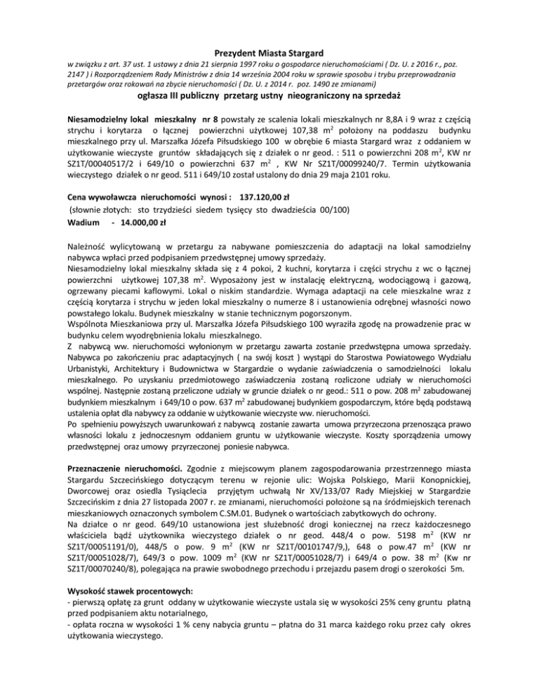 Prezydent Miasta Stargard w związku z art. 37 ust. 1 ustawy z dnia 21 sierpnia 1997 roku o gospodarce nieruchomościami ( Dz. U. z 2016 r., poz. 2147 ) i Rozporządzeniem Rady Ministrów z dnia 14 września 2004 roku w sprawie sposobu i trybu przeprowadzania przetargów oraz rokowań na zbycie nieruchomości ( Dz. U. z 2014 r. poz. 1490 ze zmianami) ogłasza III publiczny przetarg ustny nieograniczony na sprzedaż Niesamodzielny lokal mieszkalny nr 8 powstały ze scalenia lokali mieszkalnych nr 8,8A i 9 wraz z częścią strychu i korytarza o łącznej powierzchni użytkowej 107,38 m2 położony na poddaszu budynku mieszkalnego przy ul. Marszałka Józefa Piłsudskiego 100 w obrębie 6 miasta Stargard wraz z oddaniem w użytkowanie wieczyste gruntów składających się z działek o nr geod. : 511 o powierzchni 208 m 2, KW nr SZ1T/00040517/2 i 649/10 o powierzchni 637 m2 , KW Nr SZ1T/00099240/7. Termin użytkowania wieczystego działek o nr geod. 511 i 649/10 został ustalony do dnia 29 maja 2101 roku. Cena wywoławcza nieruchomości wynosi : 137.120,00 zł (słownie złotych: sto trzydzieści siedem tysięcy sto dwadzieścia 00/100) Wadium - 14.000,00 zł Należność wylicytowaną w przetargu za nabywane pomieszczenia do adaptacji na lokal samodzielny nabywca wpłaci przed podpisaniem przedwstępnej umowy sprzedaży. Niesamodzielny lokal mieszkalny składa się z 4 pokoi, 2 kuchni, korytarza i części strychu z wc o łącznej powierzchni użytkowej 107,38 m2. Wyposażony jest w instalację elektryczną, wodociągową i gazową, ogrzewany piecami kaflowymi. Lokal o niskim standardzie. Wymaga adaptacji na cele mieszkalne wraz z częścią korytarza i strychu w jeden lokal mieszkalny o numerze 8 i ustanowienia odrębnej własności nowo powstałego lokalu. Budynek mieszkalny w stanie technicznym pogorszonym. Wspólnota Mieszkaniowa przy ul. Marszałka Józefa Piłsudskiego 100 wyraziła zgodę na prowadzenie prac w budynku celem wyodrębnienia lokalu mieszkalnego. Z nabywcą ww. nieruchomości wyłonionym w przetargu zawarta zostanie przedwstępna umowa sprzedaży. Nabywca po zakończeniu prac adaptacyjnych ( na swój koszt ) wystąpi do Starostwa Powiatowego Wydziału Urbanistyki, Architektury i Budownictwa w Stargardzie o wydanie zaświadczenia o samodzielności lokalu mieszkalnego. Po uzyskaniu przedmiotowego zaświadczenia zostaną rozliczone udziały w nieruchomości wspólnej. Następnie zostaną przeliczone udziały w gruncie działek o nr geod.: 511 o pow. 208 m2 zabudowanej budynkiem mieszkalnym i 649/10 o pow. 637 m2 zabudowanej budynkiem gospodarczym, które będą podstawą ustalenia opłat dla nabywcy za oddanie w użytkowanie wieczyste ww. nieruchomości. Po spełnieniu powyższych uwarunkowań z nabywcą zostanie zawarta umowa przyrzeczona przenosząca prawo własności lokalu z jednoczesnym oddaniem gruntu w użytkowanie wieczyste. Koszty sporządzenia umowy przedwstępnej oraz umowy przyrzeczonej poniesie nabywca. Przeznaczenie nieruchomości. Zgodnie z miejscowym planem zagospodarowania przestrzennego miasta Stargardu Szczecińskiego dotyczącym terenu w rejonie ulic: Wojska Polskiego, Marii Konopnickiej, Dworcowej oraz osiedla Tysiąclecia przyjętym uchwałą Nr XV/133/07 Rady Miejskiej w Stargardzie Szczecińskim z dnia 27 listopada 2007 r. ze zmianami, nieruchomości położone są na śródmiejskich terenach mieszkaniowych oznaczonych symbolem C.SM.01. Budynek o wartościach zabytkowych do ochrony. Na działce o nr geod. 649/10 ustanowiona jest służebność drogi koniecznej na rzecz każdoczesnego właściciela bądź użytkownika wieczystego działek o nr geod. 448/4 o pow. 5198 m2 (KW nr SZ1T/00051191/0), 448/5 o pow. 9 m2 (KW nr SZ1T/00101747/9,), 648 o pow.47 m2 (KW nr SZ1T/00051028/7), 649/3 o pow. 1009 m2 (KW nr SZ1T/00051028/7) i 649/4 o pow. 38 m2 (Kw nr SZ1T/00070240/8), polegająca na prawie swobodnego przechodu i przejazdu pasem drogi o szerokości 5m. Wysokość stawek procentowych: - pierwszą opłatę za grunt oddany w użytkowanie wieczyste ustala się w wysokości 25% ceny gruntu płatną przed podpisaniem aktu notarialnego, - opłata roczna w wysokości 1 % ceny nabycia gruntu – płatna do 31 marca każdego roku przez cały okres użytkowania wieczystego. Wysokość opłaty rocznej podlega aktualizacji nie częściej niż raz na trzy lata, jeżeli wartość tej nieruchomości ulegnie zmianie. Do pierwszej opłaty i opłat rocznych doliczony zostanie 23 % podatek VAT. Pierwszy przetarg - 21 października 2016 r.; Drugi przetarg - 20 grudnia 2016 r. UWAGA: 1. Przetarg odbędzie się w siedzibie Stargardzkiego TBS - ul. Struga 29 w Stargardzie w sali przetargów - o godz. 10:30, dnia 24 lutego 2017 r. 2. Wadium w wyżej określonej wysokości winno wpłynąć na konto Stargardzkiego TBS Sp. z o.o. w Banku PEKAO S.A. I O/Stargard Nr 10124039011111000042204466, najpóźniej w dniu 20 lutego 2017 r. 3. O wysokości postąpienia decydują uczestnicy przetargu, z tym że wysokość postąpienia nie może być niższa niż 1 % ceny wywoławczej. 4. Wyniki przetargu podlegają zatwierdzeniu przez Prezydenta Miasta Stargard . 5. Wpłacone wadium przez uczestnika, który wygra przetarg zalicza się na poczet ceny nabycia nieruchomości, pozostałym uczestnikom wpłacone wadium zostanie zwrócone w terminie 3 dni od dnia zamknięcia przetargu z zastrzeżeniem, że dniem zwrotu wadium jest dzień obciążenia rachunku bankowego Stargardzkiego TBS Sp. z o.o. 6. Organizator przetargu zawiadomi osobę ustaloną jako nabywcę nieruchomości o miejscu i terminie zawarcia przedwstępnej umowy notarialnej a następnie umowy przyrzeczonej. Jeżeli osoba ustalona jako nabywca nieruchomości nie stawi się bez usprawiedliwienia w miejscu i terminie podanym w zawiadomieniu w celu zawarcia umowy przedwstępnej a następnie umowy przyrzeczonej , organizator przetargu odstąpi od zawarcia umowy, a wpłacone wadium nie podlega zwrotowi. 7. Nabywca przejmuje lokal w stanie