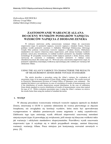 Materiały XXXVI Międzyuczelnianej Konferencji Metrologów MKM’04 _________________________________________________________________________________ Dobrosława SOCHOCKA Główny Urząd Miar Zakład Metrologii Elektrycznej ZASTOSOWANIE WARIANCJI ALLANA DO OCENY WYNIKÓW POMIARÓW NAPIĘCIA WZORCÓW NAPIĘCIA Z DIODAMI ZENERA W referacie omówiono próbę zastosowania wariancji Allana do szacowania niepewności (typu A) pomiarów napięcia, wzorców napięcia z diodami Zenera. Ocenie poddano wyniki pomiarów uzyskane w Zakładzie Metrologii Elektrycznej, Głównego Urzędu Miar podczas wzorcowania wzorców napięcia z diodami Zenera. Odchylenie standardowe nie stanowi właściwej miary niepewności, jeśli istnieje korelacja wyników pomiaru. nawet przy stwierdzeniu, że rozkład wyników pomiarów ma charakter rozkładu normalnego W przypadku wzorcowania źródeł napięcia opartych o diody Zenera, mamy zazwyczaj do czynienia z rozkładem wyników pomiarów w funkcji czasu charakterystycznym dla szumu typu 1/f.. Wówczas przy szacowaniu niepewności (typu A) pomiarów najbardziej miarodajną wielkością reprezentującą taki rozkład jest wariancja lub odchylenie Allana. USING THE ALLAN’S VARINCE TO CHARACTERSIE THE REZALTS OF MEASUREMENT ZENER DIODE VOTAGE STANDARDS The article describes a procedure using the Allan’s variance for evaluation of uncertainty (type A) in measurement of Zener diode voltage standards. The results received in Electricity Measurement Division of Central Office of Measures were estimated. The standard deviation is not satisfactory in case of correlation of results of measurements, even if the distribution of results characterises normal distribution. In the case of calibration Zener diode standard we receive distribution of results of measurements versus time typical for type of 1/f. While evaluation uncertainty type A using the Allan’s variance we receive the results better than using the method of standard deviation. 1. WSTĘP W obecnej procedurze wzorcowania wtórnych wzorców napięcia opartych na diodach Zenera, stosowanej w GUM w systemie odniesienia do wzorca pierwotnego ze złączem Josephsona, nie uwzględnia się korelacji wyników, która może być spowodowana występowaniem w układzie pomiarowych szumu migotania o małej częstotliwości. Zakłócenia tego typu zmieniają wynik obliczeń niepewności szacowanej metodami statystycznymi (typu A) powodując jej zwiększenie, jeśli stosuje się klasyczne wielkości takie jak wariancja i odchylenie standardowe eksperymentalne. Prawidłowy wynik szacowania niepewności typu A uzyskuje się w takich przypadkach stosując, zamiast klasycznej wariancji, wariancję Allana. Praca niniejsza jest kontynuacją rozważań zawartych w pracy [9]. Dobrosława SOCHOCKA ________________________________________________________________________________ 310 2. WPŁYWU KORELACJI WARTOŚCI NAPIĘĆ WYZNACZONYCH W CZASIE POJEDYNCZEGO POMIARU NA WARTOŚĆ NIEPEWNOŚCI SZACOWANEJ METODĄ TYPU A – ZASTOSOWANIE WARIANCJI ALLANA W przypadku wzorcowania źródeł napięcia z diodami Zenera, mamy zazwyczaj do czynienia z rozkładem wyników pomiarów w funkcji czasu charakterystycznym dla szumu typu 1/f tzn. rozkładem okresowo zmiennym o małej częstotliwości zmian nie większej niż 0,05 Hz. Wówczas przy szacowaniu typu A niepewności pomiarów najbardziej miarodajną wielkością reprezentującą taki rozkład jest wariancja lub odchylenie Allana. Odchylenie Allana wyznaczane na podstawie wyników pomiarów napięcia elektrycznego wzorca z diodą Zenera oblicza się – w przypadku gdy dysponujemy wynikami pomiarów uzyskanymi w równych przedziałach czasu – stosując następującą zależność będącą pierwiastkiem kwadratowym zwykłej wariancji Allana [4]: σ y (τ ) = Σ [ y k +1 (τ ) − y 2 ⋅ Po k ( τ )] 2 , (1) gdzie: σy(τ) – odchylenie Allana dla przedziału czasu τ, w którym wyznaczano wartości napięcia w procedurze wzorcowania uzyskane w kolejnych odczytach pojedynczych pomiarów, yk+1(τ) – wartość napięcia wzorca w przedziale k+1 okresu czasu o wartości τ, yk(τ) – wartość napięcia wzorca w przedziale k okresu czasu o wartości τ, P0 – ilość przedziałów czasu k pomniejszona o jeden. Przy wyznaczaniu odchylenia Allana zgodnie z wzorem (1) należy dobierać przedziały czasu τ, w których dokonywano pomiaru wartości napięcia w kolejnych pojedynczych pomiarach, w taki sposób, aby były one równe i przylegały do siebie (tzn. aby czas odstępu między kolejnymi przedziałami był równy zeru). W przypadku jednak gdy kolejne odczyty w pomiarach napięcia elektrycznego wzorców Zenera dokonywane są w różnych odstępach czasu, odchylenie Allana oblicza się na podstawie zmodyfikowanej wersji wariancji Allana [4]. W przypadku pojedynczych pomiarów wykonywanych metodą NISTVolt kolejne wartości napięcia wyjściowego wzorców wyznaczane są w różnych odstępach czasu zależnie od przebiegu procesu równoważenia układu pomiarowego. Należy więc w tym przypadku stosować zmodyfikowaną wariancję Allana według poniższego równania: 2 N − 2 n +1 1 1 k + 2 n −1 1 k + n −1 mod σ y (τ ) = ⋅ ∑ ⋅ ∑ y j − ⋅ ∑ y j , 2 ⋅ ( N − 2 ⋅ n + 1) k =1 n j = k + n n j =k 2 (2) gdzie: N – ilość wykonanych pomiarów, n – krotność okresu czasu wykonania pojedynczego pomiaru zastosowana w obliczeniu, y j – kolejna wartość wielkości mierzonej. Zastosowanie wariancji Allana do oceny wyników pomiarów napięcia wzorców napięcia ... 311 ________________________________________________________________________________ Zmodyfikowaną wariancję Allana można stosować niezależnie od tego, czy dysponujemy wynikami pomiarów wykonanych w równych czy nierównych odstępach czasu. W przypadku, gdy pomiary wykonane były w nierównych odstępach czasu a tzw. czas martwy (okres czasu pomiędzy kolejnymi pomiarami) nie był także jednakowy, wskazane j