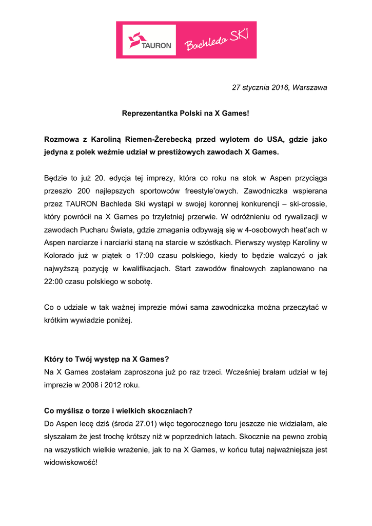 27 stycznia 2016, Warszawa Reprezentantka Polski na X Games! Rozmowa z Karoliną Riemen-Żerebecką przed wylotem do USA, gdzie jako jedyna z polek weźmie udział w prestiżowych zawodach X Games. Będzie to już 20. edycja tej imprezy, która co roku na stok w Aspen przyciąga przeszło 200 najlepszych sportowców freestyle’owych. Zawodniczka wspierana przez TAURON Bachleda Ski wystąpi w swojej koronnej konkurencji – ski-crossie, który powrócił na X Games po trzyletniej przerwie. W odróżnieniu od rywalizacji w zawodach Pucharu Świata, gdzie zmagania odbywają się w 4-osobowych heat’ach w Aspen narciarze i narciarki staną na starcie w szóstkach. Pierwszy występ Karoliny w Kolorado już w piątek o 17:00 czasu polskiego, kiedy to będzie walczyć o jak najwyższą pozycję w kwalifikacjach. Start zawodów finałowych zaplanowano na 22:00 czasu polskiego w sobotę. Co o udziale w tak ważnej imprezie mówi sama zawodniczka można przeczytać w krótkim wywiadzie poniżej. Który to Twój występ na X Games? Na X Games zostałam zaproszona już po raz trzeci. Wcześniej brałam udział w tej imprezie w 2008 i 2012 roku. Co myślisz o torze i wielkich skoczniach? Do Aspen lecę dziś (środa 27.01) więc tegorocznego toru jeszcze nie widziałam, ale słyszałam że jest trochę krótszy niż w poprzednich latach. Skocznie na pewno zrobią na wszystkich wielkie wrażenie, jak to na X Games, w końcu tutaj najważniejsza jest widowiskowość! Kto według ciebie będzie faworytem do zwycięstwa? Faworytkami będą Kanadyjki. One potrafią naprawdę świetnie i szybko jeździć na takich trasach jak ta w Aspen, czyli poprowadzonych prawie na wprost. Groźna będzie też aktualna liderka Pucharu Świata, szwedka Anna Holmlund. Jaka atmosfera panuje na tej imprezie? Świetna! Można ją śmiało porównać do tej panującej podczas igrzysk olimpijskich. Jest bardzo dużo kibiców, wspaniała oprawa medialna, a zawody zorganizowane są z wielkim rozmachem. Do tego dochodzi jeszcze freestyle’owy luz. Jaki event chciałabyś zobaczyć na żywo? Na pewno chciałabym zobaczyć halfpipe mężczyzn. Ta konkurencja zawsze robi piorunujące wrażenie, a w Aspen pipe jest potężnych rozmiarów. Czego Ci życzyć przed startem? W tym sezonie szczęście mi ewidentnie nie dopisuje, więc śmiało można mi go życzyć! Kontakt dla mediów: Andrzej Lesiewski [email protected] +48 512 348 232 TAURON Polska Energia SA jest spółką holdingową w grupie kapitałowej, która zajmuje się wydobyciem węgla, wytwarzaniem, dystrybucją i sprzedażą energii. Grupa TAURON wraz z GZE obejmuje swoim działaniem 18 proc. powierzchni kraju i jest największym sprzedawcą i dystrybutorem energii w Polsce oraz jednym z największych podmiotów gospodarczych w kraju. W skład Grupy TAURON wchodzą m.in. TAURON Wydobycie, TAURON Wytwarzanie, TAURON Ekoenergia, TAURON Ciepło, TAURON Dystrybucja, TAURON Sprzedaż oraz TAURON Obsługa Klienta. Andrzej Bachleda-Curuś II – (ur. 2 stycznia 1947 roku w Zakopanem) to najbardziej utytułowany polski narciarz alpejski. Dwukrotnie reprezentował Polskę na Igrzyskach Olimpijskich – w 1968 roku w Grenoble, gdzie zdobył 6. lokatę w slalomie specjalnym oraz w Sapporo w roku 1972, plasując się na 9. pozycji w slalomie gigancie. W jego kolekcji znajdują się też medale Narciarskich Mistrzostw Świata - brąz za kombinację alpejską w Val Gardena w 1970 roku oraz srebro zdobyte w 1974 w St. Moritz w tej samej konkurencji. Wybitnym wynikiem było też 2. miejsce w slalomowej klasyfikacji Pucharu Świata i 6. miejsce w klasyfikacji generalnej w sezonie 1971/1972. Andrzej Bachleda-Curuś wielokrotnie tryumfował też na Zimowych Uniwersjadach i Spartakiadach Armii Zaprzyjaźnionych. Na najwyższym podium Mistrzostw Polski stawał aż 14 razy. W trakcie swojej kariery ścigał się z największymi legendami narciarstwa alpejskiego, takimi jak Jean Claude Killy czy Gustavo Thöni. Jest pierwszym Polakiem uhonorowanym prestiżową nagrodą „Fair Play” przyznawaną przez UNESCO. W 2009 roku otrzymał Krzyż Kawalerski Orderu Odrodzenia Polski.