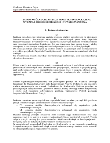 Akademia Morska w Gdyni Wydział Przedsiębiorczości i Towaroznawstwa ZASADY OGÓLNE ORGANIZACJI PRAKTYK STUDENCKICH NA WYDZIALE PRZEDSIĘBIORCZOŚCI I TOWAROZNAWSTWA 1. Postanowienia ogólne §1 Praktyka zawodowa jest integralną częścią programu studiów zawodowych na kierunkach Towaroznawstwo i Innowacyjna Gospodarka, zatwierdzonych przez Radę Wydziału Przedsiębiorczości i Towaroznawstwa i zgodnych z Krajowymi Ramami Kwalifikacyjnymi oraz przyjętymi standardami kształcenia. Jest ona traktowana jako proces łączący wiedzę teoretyczną z zawodowymi umiejętnościami nabywanymi w trakcie realizacji praktyki. Do realizacji praktyk zobowiązani są studenci studiów stacjonarnych oraz niestacjonarnych wszystkich specjalności Wydziału Przedsiębiorczości i Towaroznawstwa Akademii Morskiej w Gdyni. Nie zrealizowanie praktyki powoduje powstanie długu punktowego, który stanowi podstawę niezaliczenia semestru. §2 Celem praktyk jest ugruntowanie wiedzy zawodowej, nabycie i pogłębienie umiejętności praktycznych/zawodowych oraz ukształtowanie pozytywnych, istotnych w przyszłej pracy, cech osobowościowych a w szczególności umiejętności pracy w zespole. Istotnym celem praktyki może być również zbieranie materiałów niezbędnych dla realizacji pracy dyplomowej. §3 Nadzór organizacyjno-merytoryczny nad przebiegiem praktyk na Wydziale sprawuje Prodziekan ds. Studenckich, zwany dalej Kierownikiem Praktyk. Dodatkowo dla studentów studiów stacjonarnych, na wniosek Prodziekana ds. Studenckich, Dziekan powołuje na poszczególnych specjalnościach Opiekunów Praktyk, którzy sprawują nadzór merytoryczny i opiekę nad studentami odbywającymi praktykę. Opiekunowie Praktyk podlegają bezpośrednio Kierownikowi Praktyk. §4 Praktyka zawodowa trwa 4 tygodnie (co odpowiada 20 dniom roboczym czyli 160 godzinom pracy) i realizowana jest przez studentów studiów stacjonarnych po: IV. semestrze studiów dwustopniowych kończących się uzyskaniem tytułu zawodowego - licencjat, VI. semestrze studiów dwustopniowych kończących się uzyskaniem tytułu zawodowego – inżynier. Studenci realizują praktyki zawodowe poza okresem zajęć dydaktycznych oraz sesji egzaminacyjnej tj. w jednym z miesięcy wakacyjnych: lipiec, sierpień lub wrzesień. Termin odbycia praktyki ustalany jest przez studentów z Opiekunem Praktyk na danej specjalności. Powyższy zapis nie dotyczy studentów studiów niestacjonarnych. W uzasadnionych przypadkach Prodziekan ds. Studenckich, na merytorycznie uzasadniony i zaopiniowany przez Opiekuna Praktyk wniosek zainteresowanego studenta, może zezwolić na odbycie praktyki poza regulaminowym czasem. Akademia Morska w Gdyni Wydział Przedsiębiorczości i Towaroznawstwa W przypadku studentów studiów niestacjonarnych czas realizacji praktyki obejmuje okres zatrudnienia w trakcie realizacji studiów zawodowych. W szczególnych, uzasadnionych przypadkach, Prodziekan ds. Studenckich może zaliczyć jako praktykę zawodową zatrudnienie z okresu poprzedzającego podjęcie studiów zawodowych. §5 Praktyki realizowane są w oparciu o ramowe programy praktyk, opracowane przez Opiekunów Praktyk na poszczególnych specjalnościach i zatwierdzone przez Kierownika Praktyk. Podstawą przygotowania ramowych programów praktyk są zakładane efekty kształcenia w obszarze wiedzy, umiejętności i kompetencji społecznych dla danych specjalności. Podmiot przyjmujący studenta na praktykę zawodową powinien umożliwić zrealizowanie ramowego programu praktyk, przy uwzględnieniu specyfiki jego funkcjonowania. §6 Praktyki mogą być realizowane na podstawie umowy o praktykę, zawartej pomiędzy Akademią Morską a odpowiednimi przedsiębiorstwami, która nie powoduje nawiązania stosunku pracy lub na podstawie umowy o pracę zawartej pomiędzy studentem a konkretnym przedsiębiorstwem. W uzasadnionych przypadkach, na wniosek Opiekuna Praktyk, Kierownik Praktyk może uznać za praktykę pracę studentów w przedsiębiorstwach zagranicznych. Na wniosek studenta, pozytywnie zaopiniowany przez Opiekuna Praktyk, Kierownik Praktyk może uznać za praktykę pracę studentów wykonywaną podczas stażu realizowanego w ramach projektu unijnego, którego uczestnikiem jest Akademia Morska w Gdyni. Warunkiem zaliczenia tej formy realizacji praktyki zawodowej jest przedstawienie dokumentów potwierdzających udział w stażu . Praca studenta na warunkach „umowy o pracę" uznana może być za praktykę, o ile w trakcie jej trwania zrealizowany zostanie ramowy program praktyki i przedstawione zostaną stosowne dokumenty potwierdzające zatrudnienie studenta w przedsiębiorstwie. §7 Praktyki zawodowe mogą odbywać się w: 1. instytucjach i przedsiębiorstwach branżowych, których działalność związana jest z kierunkiem bądź specjalnością studiów studenta; 2. jednostkach organizacyjnych Akademii Morskiej; 3. statkach szkolnych Akademii Morskiej w Gdyni (dot. studentów studiów stacjonarnych) – na wniosek zgłoszony przez Dział Armatorski AM w Gdyni. W takim przypadku studenci są zobowiązani do odbycia właściwych szkoleń oraz do przedstawienia stosownej dokumentacji medycznej. Miejsce praktyki może być wskazane przez Uczelnię lub samego studenta. Miejsce praktyki wskazane przez studenta musi uzyskać akceptację Opiekuna Praktyk na danej specjalności, a w spornych przypadkach akceptację Kierownika Praktyk. Studenci decydujący się odbyć praktykę na statkach szkolnych AM sami pokrywają koszty szkoleń specjalistycznych i dokumentów żeglarskich. Na wniosek studenta J.M. Rektor może zwolnić studenta z tych kosztów. Akademia Morska w Gdyni Wydział Przedsiębiorczości i Towaroznawstwa §8 Podczas praktyk studenci nie otrzymują żadnych świadczeń finansowych (stypendia, diety, zwrot kosztów za przejazdy). Stąd zaleca się, aby na miejsce praktyk wybierać w miarę możliwości przedsiębiorstwa zlokalizowane w miejscu zamieszkania studenta. W 
