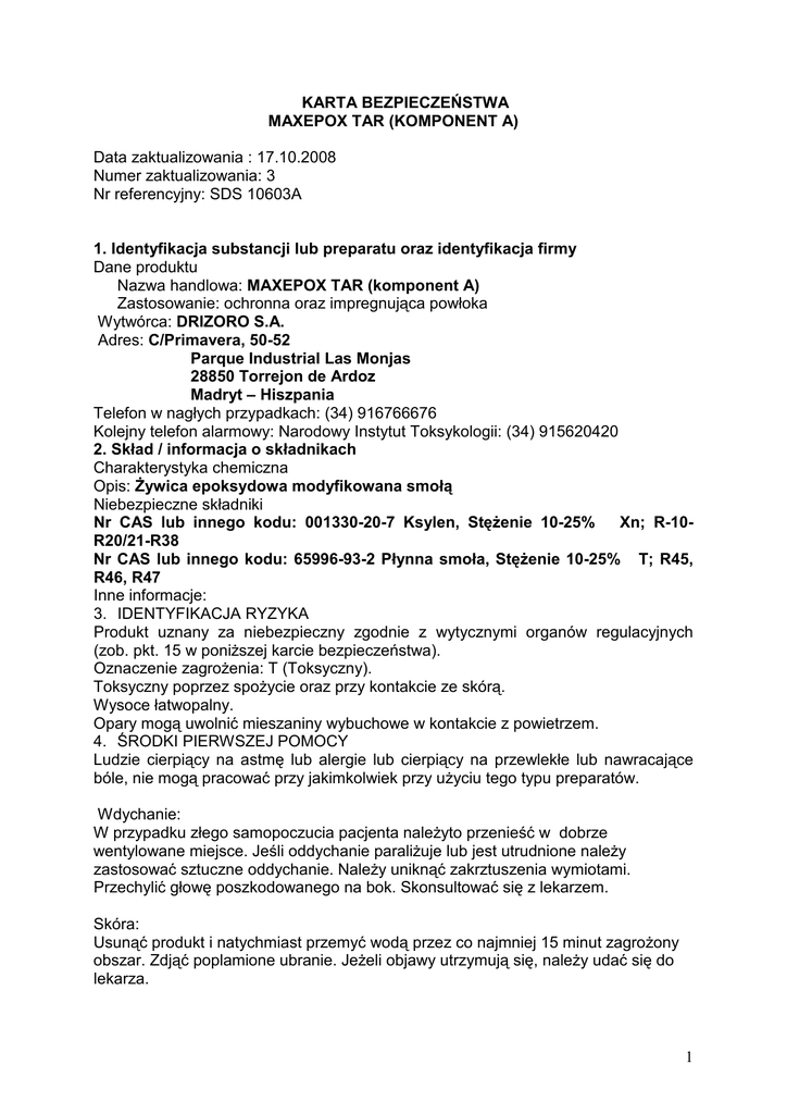 KARTA BEZPIECZEŃSTWA MAXEPOX TAR (KOMPONENT A) Data zaktualizowania : 17.10.2008 Numer zaktualizowania: 3 Nr referencyjny: SDS 10603A 1. Identyfikacja substancji lub preparatu oraz identyfikacja firmy Dane produktu Nazwa handlowa: MAXEPOX TAR (komponent A) Zastosowanie: ochronna oraz impregnująca powłoka Wytwórca: DRIZORO S.A. Adres: C/Primavera, 50-52 Parque Industrial Las Monjas 28850 Torrejon de Ardoz Madryt – Hiszpania Telefon w nagłych przypadkach: (34) 916766676 Kolejny telefon alarmowy: Narodowy Instytut Toksykologii: (34) 915620420 2. Skład / informacja o składnikach Charakterystyka chemiczna Opis: śywica epoksydowa modyfikowana smołą Niebezpieczne składniki Nr CAS lub innego kodu: 001330-20-7 Ksylen, StęŜenie 10-25% Xn; R-10R20/21-R38 Nr CAS lub innego kodu: 65996-93-2 Płynna smoła, StęŜenie 10-25% T; R45, R46, R47 Inne informacje: 3. IDENTYFIKACJA RYZYKA Produkt uznany za niebezpieczny zgodnie z wytycznymi organów regulacyjnych (zob. pkt. 15 w poniŜszej karcie bezpieczeństwa). Oznaczenie zagroŜenia: T (Toksyczny). Toksyczny poprzez spoŜycie oraz przy kontakcie ze skórą. Wysoce łatwopalny. Opary mogą uwolnić mieszaniny wybuchowe w kontakcie z powietrzem. 4. ŚRODKI PIERWSZEJ POMOCY Ludzie cierpiący na astmę lub alergie lub cierpiący na przewlekłe lub nawracające bóle, nie mogą pracować przy jakimkolwiek przy uŜyciu tego typu preparatów. Wdychanie: W przypadku złego samopoczucia pacjenta naleŜyto przenieść w dobrze wentylowane miejsce. Jeśli oddychanie paraliŜuje lub jest utrudnione naleŜy zastosować sztuczne oddychanie. NaleŜy uniknąć zakrztuszenia wymiotami. Przechylić głowę poszkodowanego na bok. Skonsultować się z lekarzem. Skóra: Usunąć produkt i natychmiast przemyć wodą przez co najmniej 15 minut zagroŜony obszar. Zdjąć poplamione ubranie. JeŜeli objawy utrzymują się, naleŜy udać się do lekarza. 1 Zabrudzenie oczu: Trzymać powieki otwarte i natychmiast przemyć oczy duŜą ilością ciepłej wody, przez przynajmniej 10 minut. Skonsultować się z okulistą. Połknięcie: Nie wywoływać wymiotów. NaleŜy pić wodę małymi łykami (efekt rozpuszczenia). NaleŜy natychmiast udać się do szpitala, by umówić się do lekarza oraz pokazać poniŜszą Kartę Bezpieczeństwa. Decyzja o wywołaniu wymiotów lub nie, będzie opierać się na kryteriach medycznych. Informacja dla lekarza: Kauteryzacje traktować jak poparzenie. W przypadku połknięcia zastosować przeczyszczenie Ŝołądka. UŜyć aktywnego węgla i kwasu sodowego jako środka przeczyszczającego. Jeśli zachodzi potrzeba, zrobić sztuczne oddychanie. Tlenoterapia. 5. ŚRODKI GASZENIA OGNIA Odpowiednie środki gaśnicze: Mgła wodna, proszek chemiczny, dwutlenek węgla (CO2), piana. Środki gaśnicze, których nie naleŜy uŜywać ze względów bezpieczeństwa: Obfity strumień wody (moŜe rozniecić ogień). Specjalne wyposaŜenie ochronne w razie poŜaru: StraŜacy muszą nosić buty, rękawice i ognioodporne kombinezony oraz własne aparaty do oddychania. Niebezpieczne produkty spalania: W przypadku poŜaru oprócz spalania takich produktów jak dwutlenek węgla, tlenek węgla lub innych gazów oraz benzopirenów, które mogą być rakotwórcze. Inne wskazówki: NaleŜy zachować ciecze zuŜyte przy gaszeniu poŜaru do późniejszego usunięcia. 6. ŚRODKI OSTROśNOŚCI Procedura powiadamiania: W razie przypadkowego rozlania lub wycieku powiadomić odpowiednie władze zgodnie z obowiązującymi przepisami. Środki zapobiegawcze Unikać źródeł zapłonu. Nie palić. Zapewnić odpowiednią wentylacją. Nie wdychać Ŝadnych oparów, które mogły się uwolnić oraz unikać kontaktu z oczami oraz skórą. Nosić ochronną odzieŜ oraz rękawiczki, buty jak i ochraniać oczy (okulary dopasowane po bokach). Zaleca się stosowanie własnego aparatu oddechowego oraz eksplozymetra. Środki ostroŜności w zakresie ochrony środowiska: NaleŜy unikać przenikania produktów do ziemi, kanalizacji lub wszelkiego rodzaju źródeł wody, takŜe tych gruntowych 2 Metody czyszczenia: Odzyskiwanie za pomocą materiałów wchłaniających (piasek, trociny, uniwersalny absorbent) 7. PRZENOSZENIE I PRZECHOWYWANIE Przenoszenie Stosować tylko w dobrze wentylowanych miejscach. Przechowywać w oryginalnych, zamkniętych opakowaniach. Trzymać z daleka od źródła zapłonu. Przechowywanie Przechowywać pojemniki szczelnie zamknięte w suchym, chłodnym i dobrze wentylowanym pomieszczeniu. Składować w temperaturze między 50-200C. Chronić przed wilgocią. Nie przechowywać za zewnątrz. 8. KONTROLA PRACY/OCHRONA OSOBISTA Wartości dopuszczalne dla ekspozycji: Środki ochrony indywidualnej Ochrona układu oddechowego Stosować maskę przeciwgazową. Ochrona oczu Nosić ochronne okulary z całkowitą widocznością. Ochrona skóry i ciała: Nosić gumowy lub z syntetycznego materiału fartuch. NaleŜy zapewnić odpowiednią ochronę dla ramion na wypadek moŜliwego kontaktu z ciałem. Specjalne instrukcje dotyczące ochrony i higieny Przestrzegać zasad bezpieczeństwa i środków higieny podczas przenoszenia produktów chemicznym, jak unikanie kontaktu z oczami i skórą, mycie rąk, nie picia , nie jedzenia. Okresowo naleŜy przeprowadzać badania medyczne. 9. WŁŚCIWOŚCI FIZYCZNE I CHEMICZNE Stan fizyczny: ciecz Stan / kolor: Czarny wiskozowy Zapach: Aromatyczny PH: Punkt wrzenia/zakres wrzenia: > 1000C Punkt topnienia / zakres (ºC): Temperatura krzepnięcia (ºC): Temperatura rozkładu(ºC): Temperatura zapłonu: > 230C Granice palności (ºC): Temperatura samozapłonu (ºC): Niebezpieczeństwa wybuchu: Granica eksplozji a) dolna: 1% objętości b) górna: 7,5% objętości Właściwości utleniające: Ciśnienie pary: (ksyylen) 8 hPa Gęstość względny: > 1,5kg/l Rozpuszczalność: nierozpuszczalne w temperaturze 20 ° C Lepkość (cps): 3 Współczynnik podziału: StęŜenie LZO (g / l): 270 10. STABILNOŚĆ I ODDZAIŁYWANIE Stabilność: Przy odpowi