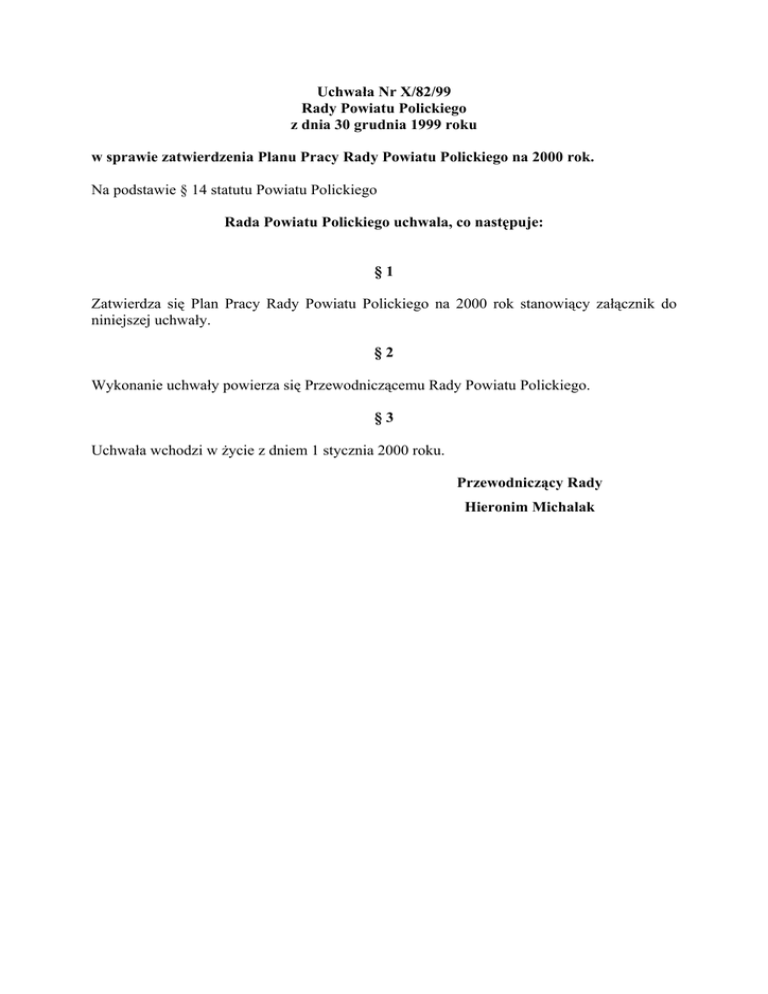 Uchwała Nr X/82/99 Rady Powiatu Polickiego z dnia 30 grudnia