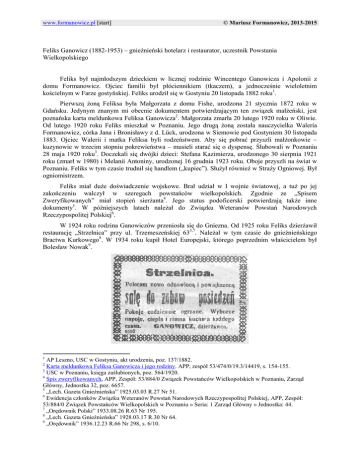 www.formanowicz.pl [start] © Mariusz Formanowicz, 2013-2015 Feliks Ganowicz (1882-1953) – gnieźnieński hotelarz i restaurator, uczestnik Powstania Wielkopolskiego Feliks był najmłodszym dzieckiem w licznej rodzinie Wincentego Ganowicza i Apolonii z domu Formanowicz. Ojciec familii był płóciennikiem (tkaczem), a jednocześnie wieloletnim kościelnym w Farze gostyńskiej. Feliks urodził się w Gostyniu 20 listopada 1882 roku1. Pierwszą żoną Feliksa była Małgorzata z domu Fishe, urodzona 21 stycznia 1872 roku w Gdańsku. Jedynym znanym mi obecnie dokumentem potwierdzającym ten związek małżeński, jest poznańska karta meldunkowa Feliksa Ganowicza2. Małgorzata zmarła 20 lutego 1920 roku w Oliwie. Od lutego 1920 roku Feliks mieszkał w Poznaniu. Jego drugą żoną została nauczycielka Waleria Formanowicz, córka Jana i Bronisławy z d. Lück, urodzona w Siemowie pod Gostyniem 30 listopada 1883. Ojciec Walerii i matka Feliksa byli rodzeństwem. Aby się pobrać przyszli małżonkowie – kuzynowie w trzecim stopniu pokrewieństwa – musieli starać się o dyspensę. Ślubowali w Poznaniu 28 maja 1920 roku3. Doczekali się dwójki dzieci: Stefana Kazimierza, urodzonego 30 sierpnia 1921 roku (zmarł w 1980) i Melanii Antoniny, urodzonej 16 grudnia 1923 roku. Oboje przyszli na świat w Poznaniu. Feliks w tym czasie trudnił się handlem („kupiec”). Służył również w Straży Ogniowej. Był ogniomistrzem. Feliks miał duże doświadczenie wojskowe. Brał udział w I wojnie światowej, a tuż po jej zakończeniu walczył w szeregach powstańców wielkopolskich. Zgodnie ze „Spisem Zweryfikowanych” miał stopień sierżanta4. Jego status podoficerski potwierdzają także inne dokumenty5. W późniejszych latach należał do Związku Weteranów Powstań Narodowych Rzeczypospolitej Polskiej6. W 1924 roku rodzina Ganowiczów przeniosła się do Gniezna. Od 1925 roku Feliks dzierżawił restaurację „Strzelnica” przy ul. Trzemeszeńskiej 635,7. Należał w tym czasie do gnieźnieńskiego Bractwa Kurkowego8. W 1934 roku kupił Hotel Europejski, którego poprzednim właścicielem był Bolesław Nowak9. 1 AP Leszno, USC w Gostyniu, akt urodzenia, poz. 137/1882. Karta meldunkowa Feliksa Ganowicza i jego rodziny. APP, zespół 53/474/0/19.3/14419, s. 154-155. 3 USC w Poznaniu, księga zaślubionych, poz. 564/1920. 4 Spis zweryfikowanych, APP, Zespół: 53/884/0 Związek Powstańców Wielkopolskich w Poznaniu, Zarząd Główny, Jednostka 32, poz. 6657. 5 „Lech. Gazeta Gnieźnieńska” 1925.03.03 R.27 Nr 51. 6 Ewidencja członków Związku Weteranów Powstań Narodowych Rzeczypospolitej Polskiej, APP, Zespół: 53/884/0 Związek Powstańców Wielkopolskich w Poznaniu » Seria: 1 Zarząd Główny » Jednostka: 44. 7 „Orędownik Polski” 1933.08.26 R.63 Nr 195. 8 „Lech. Gazeta Gnieźnieńska” 1928.03.17 R.30 Nr 64. 9 „Orędownik” 1936.12.23 R.66 Nr 298, s. 6/10. 2 Hotel Europejski w Gnieźnie. Zdjęcie z 1929 roku Podczas okupacji Feliks z rodziną został wysiedlony do Generalnej Guberni. W Krakowie otworzył w tym czasie restaurację (Gaststätte Feliks Ganowicz, Kommandanturstr. 5)10. Po wojnie wrócił do Gniezna i prowadził restaurację przy Hotelu Europejskim. Feliks Ganowicz zmarł 5 maja 1953 roku w Gnieźnie. Jego żona Waleria z Formanowiczów przeżyła Feliksa o kilkanaście lat. Zmarła w Gnieźnie 10 kwietnia 1969 roku. 10 Amtliches Fernsprechbuch fűr das Generalgouvernement, 1942, s. 46.