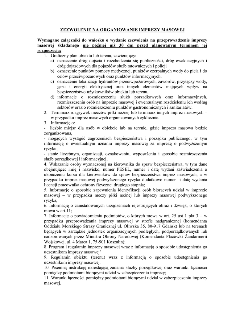 ZEZWOLENIE NA ORGANIOWANIE IMPREZY MASOWEJ Wymagane załączniki do wniosku o wydanie zezwolenia na przeprowadzenie imprezy masowej składanego nie później niż 30 dni przed planowanym terminem jej rozpoczęcia: 1. Graficzny plan obiektu lub terenu, zawierający: a) oznaczenie dróg dojścia i rozchodzenia się publiczności, dróg ewakuacyjnych i dróg dojazdowych dla pojazdów służb ratowniczych i policji b) oznaczenie punktów pomocy medycznej, punktów czerpalnych wody do picia i do celów przeciwpożarowych oraz punktów informacyjnych, c) oznaczenie lokalizacji hydrantów przeciwpożarowych, zaworów, przyłączy wody, gazu i energii elektrycznej oraz innych elementów mających wpływ na bezpieczeństwo użytkowników obiektu lub terenu, d) informacje o rozmieszczeniu służb porządkowych oraz informacyjnych, rozmieszczeniu osób na imprezie masowej i ewentualnym rozdzieleniu ich według sektorów oraz o rozmieszczeniu punktów gastronomicznych i sanitariatów. 2. Terminarz rozgrywek meczów piłki nożnej lub terminarz innych imprez masowych – w przypadku imprez masowych organizowanych cyklicznie. 3. Informację o: - liczbie miejsc dla osób w obiekcie lub na terenie, gdzie impreza masowa będzie zorganizowana, - mogących wystąpić zagrożeniach bezpieczeństwa i porządku publicznego, w tym informację o ewentualnym uznaniu imprezy masowej za imprezę o podwyższonym ryzyku, - stanie liczebnym, organizacji, oznakowaniu, wyposażeniu i sposobie rozmieszczenia służb porządkowej i informacyjnej; 4. Wskazanie osoby wyznaczonej na kierownika do spraw bezpieczeństwa, w tym dane obejmujące: imię i nazwisko, numer PESEL, numer i datę wydani zaświadczenia o ukończeniu kursu dla kierowników do spraw bezpieczeństwa imprez masowych, a w przypadku imprez masowej podwyższonego ryzyka dodatkowo numer i datę wydania licencji pracownika ochrony fizycznej drugiego stopnia; 5. Informację o sposobie zapewnienia identyfikacji osób biorących udział w imprezie masowej – w przypadku meczy piłki nożnej lub imprezy masowej podwyższonego ryzyka; 6. Informację o zainstalowanych urządzeniach rejestrujących obraz i dźwięk, o których mowa w art.11; 7. Informację o powiadomieniu podmiotów, o których mowa w art. 25 ust 1 pkt 3 – w przypadku przeprowadzania imprezy masowej w strefie nadgranicznej (komendanta Oddziału Morskiego Straży Granicznej ul. Oliwska 35, 80-917 Gdańsk) lub na terenach będących w zarządzie jednostek organizacyjnych podległych, podporządkowanych lub nadzorowanych przez Ministra Obrony Narodowej (Komendanta Placówki Żandarmerii Wojskowej, ul. 4 Marca 1, 75-901 Koszalin); 8. Program i regulamin imprezy masowej wraz z informacją o sposobie udostępnienia go uczestnikom imprezy masowej’ 9. Regulamin obiektu (terenu) wraz z informacją o sposobie udostępnienia go uczestnikom imprezy masowej. 10. Pisemną instrukcję określającą zadania służby porządkowej oraz warunki łączności pomiędzy podmiotami biorącymi udział w zabezpieczeniu imprezy; 11. Warunki łączności pomiędzy podmiotami biorącymi udział w zabezpieczeniu imprezy masowej. Wykaz załączników składanych niezwłocznie jednak nie później niż 14 dni przed terminem rozpoczęcia imprezy masowej: 1. Opinie zawierające informacje o niezbędnej wielkości sił i środków potrzebnych do zabezpieczenia imprezy, zastrzeżeniach do stanu technicznego obiektu (terenu) oraz przewidywanych zagrożeniach: - właściwego miejscowo komendanta policji – Komenda Miejska Policji w Koszalinie, ul. Słowackiego 11, 75-009 Koszalin - właściwego miejscowo komendanta państwowej straży pożarnej - Komenda Miejska Państwowej Straży Pożarnej we Koszalinie, ul. Strażacka 8, 75-736 Koszalin - kierownika jednostki organizacyjnej pomocy doraźnej (pogotowia ratunkowego) – Wojewódzka Stacja Pogotowia Ratunkowego w Szczecinie, ul. Mazowiecka 14, 70526 Szczecin - państwowego inspektora sanitarnego – Państwowy Powiatowy Inspektor Sanitarny w Koszalinie, ul. Zwycięstwa 136, 75-613 Koszalin 2. Instrukcję postępowania w przypadku powstania pożaru lub innego miejscowo zagrożenia w miejscu i w czasie imprezy masowej 3. w przypadku gdy właściciel, posiadacz, użytkownik obiektu lub zarządzający obiektem na terenie którego ma być przeprowadzona impreza masowa rozpoczął jego użytkowanie zgodnie z przepisami prawa budowlanego, a charakter imprezy masowej jest zgodny z przeznaczeniem obiektu, organizator do wniosku, o którym mowa w art. 25 ust. 1 pkt 1 dołącza ważne opinie, o których mowa w art. 25 ust. 1 pkt 2 właściwych miejscowo: komendanta powiatowego PSP i państwowego inspektora sanitarnego. Wykaz dodatkowych załączników składanych na żądanie Wójta Gminy Mielno: 1) kopie aktualnych protokołów z kontroli, o których mowa w art. 62 ust. 1 ustawy z dnia 7 lipca 1994 r. – Prawo budowlane (Dz. U. z 2006 r. Nr 156, poz. 1118 z pó żn. zm.); 2) dokumentu poświadczającego spełnienie obowiązku zawarcia umowy ubezpieczenia o którym mowa w art. 53 ust. 1; 3) pisemnej zgody na przeprowadzenie imprezy masowej wydanej przez kierownika jednostki organizacyjnej Lasów Państwowych, parku narodowego lub krajobrazowego – w razie przeprowadzania imprezy na terenach będących w zarządzie tej jednostki.