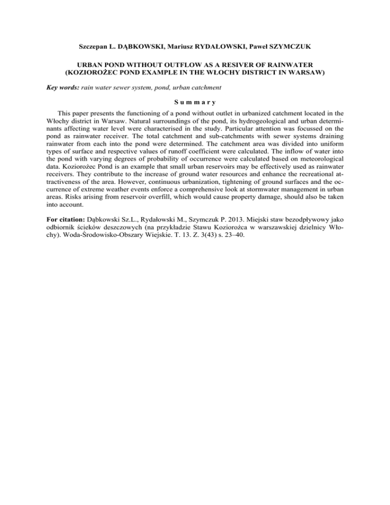 Szczepan L. DĄBKOWSKI, Mariusz RYDAŁOWSKI, Paweł SZYMCZUK URBAN POND WITHOUT OUTFLOW AS A RESIVER OF RAINWATER (KOZIOROŻEC POND EXAMPLE IN THE WŁOCHY DISTRICT IN WARSAW) Key words: rain water sewer system, pond, urban catchment Summary This paper presents the functioning of a pond without outlet in urbanized catchment located in the Włochy district in Warsaw. Natural surroundings of the pond, its hydrogeological and urban determinants affecting water level were characterised in the study. Particular attention was focussed on the pond as rainwater receiver. The total catchment and sub-catchments with sewer systems draining rainwater from each into the pond were determined. The catchment area was divided into uniform types of surface and respective values of runoff coefficient were calculated. The inflow of water into the pond with varying degrees of probability of occurrence were calculated based on meteorological data. Koziorożec Pond is an example that small urban reservoirs may be effectively used as rainwater receivers. They contribute to the increase of ground water resources and enhance the recreational attractiveness of the area. However, continuous urbanization, tightening of ground surfaces and the occurrence of extreme weather events enforce a comprehensive look at stormwater management in urban areas. Risks arising from reservoir overfill, which would cause property damage, should also be taken into account. For citation: Dąbkowski Sz.L., Rydałowski M., Szymczuk P. 2013. Miejski staw bezodpływowy jako odbiornik ścieków deszczowych (na przykładzie Stawu Koziorożca w warszawskiej dzielnicy Włochy). Woda-Środowisko-Obszary Wiejskie. T. 13. Z. 3(43) s. 23–40.