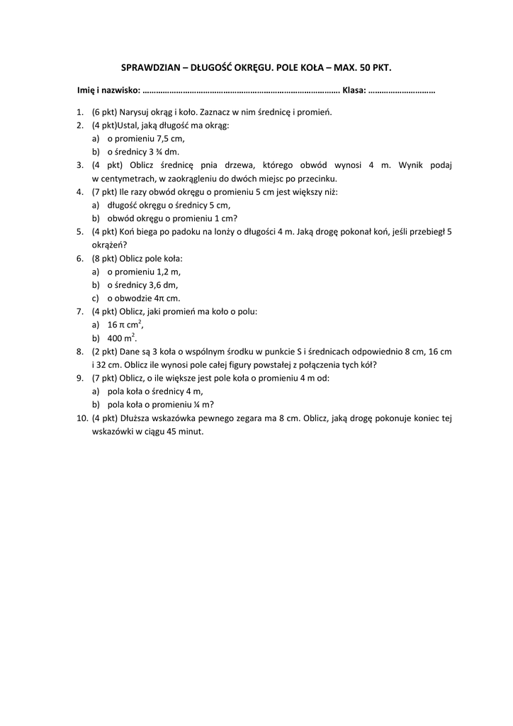 SPRAWDZIAN – DŁUGOŚĆ OKRĘGU. POLE KOŁA – MAX. 50 PKT.