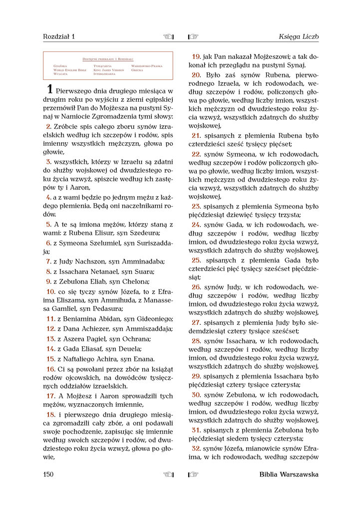 L R Rozdział 1 Dostępne przekłady 1 Rozdziału *W-4m1* Tysiąclecia Warszawsko-Praska King James Version Grecka Interlinearna Gdańska World English Bible Wulgata 1 Pierwszego dnia drugiego miesiąca w drugim roku po wyjściu z ziemi egipskiej przemówił Pan do Mojżesza na pustyni Synaj w Namiocie Zgromadzenia tymi słowy: 2. Zróbcie spis całego zboru synów izraelskich według ich szczepów i rodów, spis imienny wszystkich mężczyzn, głowa po głowie, 3. wszystkich, którzy w Izraelu są zdatni do służby wojskowej od dwudziestego roku życia wzwyż, spiszcie według ich zastępów ty i Aaron, 4. a z wami będzie po jednym mężu z każdego plemienia. Będą oni naczelnikami rodów. 5. A te są imiona mężów, którzy staną z wami: z Rubena Elisur, syn Szedeura; 6. z Symeona Szelumiel, syn Suriszaddaja; 7. z Judy Nachszon, syn Amminadaba; 8. z Issachara Netanael, syn Suara; 9. z Zebulona Eliab, syn Chelona; 10. co się tyczy synów Józefa, to z Efraima Eliszama, syn Ammihuda, z Manassesa Gamliel, syn Pedasura; 11. z Beniamina Abidan, syn Gideoniego; 12. z Dana Achiezer, syn Ammiszaddaja; 13. z Aszera Pagiel, syn Ochrana; 14. z Gada Eliasaf, syn Deuela; 15. z Naftaliego Achira, syn Enana. 16. Ci są powołani przez zbór na książąt rodów ojcowskich, na dowódców tysięcznych oddziałów izraelskich. 17. A Mojżesz i Aaron sprowadzili tych mężów, wyznaczonych imiennie, 18. i pierwszego dnia drugiego miesiąca zgromadzili cały zbór, a oni podawali swoje pochodzenie, zapisując się imiennie według swoich szczepów i rodów, od dwudziestego roku życia wzwyż, głowa po głowie, 150 Księga Liczb 19. jak Pan nakazał Mojżeszowi; a tak dokonał ich przeglądu na pustyni Synaj. 20. Było zaś synów Rubena, pierworodnego Izraela, w ich rodowodach, według szczepów i rodów, policzonych głowa po głowie, według liczby imion, wszystkich mężczyzn od dwudziestego roku życia wzwyż, wszystkich zdatnych do służby wojskowej, 21. spisanych z plemienia Rubena było czterdzieści sześć tysięcy pięćset; 22. synów Symeona, w ich rodowodach, według szczepów i rodów policzonych głowa po głowie, według liczby imion, wszystkich mężczyzn od dwudziestego roku życia wzwyż, wszystkich zdatnych do służby wojskowej, 23. spisanych z plemienia Symeona było pięćdziesiąt dziewięć tysięcy trzysta; 24. synów Gada, w ich rodowodach, według szczepów i rodów, według liczby imion, od dwudziestego roku życia wzwyż, wszystkich zdatnych do służby wojskowej, 25. spisanych z plemienia Gada było czterdzieści pięć tysięcy sześćset pięćdziesiąt; 26. synów Judy, w ich rodowodach, według szczepów i rodów, według liczby imion, od dwudziestego roku życia wzwyż, wszystkich zdatnych do służby wojskowej, 27. spisanych z plemienia Judy było siedemdziesiąt cztery tysiące sześćset; 28. synów Issachara, w ich rodowodach, według szczepów i rodów, według liczby imion, od dwudziestego roku życia wzwyż, wszystkich zdatnych do służby wojskowej, 29. spisanych z plemienia Issachara było pięćdziesiąt cztery tysiące czterysta; 30. synów Zebulona, w ich rodowodach, według szczepów i rodów, według liczby imion, od dwudziestego roku życia wzwyż, wszystkich zdatnych do służby wojskowej, 31. spisanych z plemienia Zebulona było pięćdziesiąt siedem tysięcy czterysta; 32. synów Józefa, mianowicie synów Efraima, w ich rodowodach, według szczepów L R Biblia Warszawska Księga Liczb L R Rozdział 2 i rodów, według liczby imion, od dwudziestego roku życia wzwyż, wszystkich zdatnych do służby wojskowej, 47. Lecz Lewici, według pochodzenia swego rodu, nie zostali wraz z nimi spisani. 33. spisanych z plemienia Efraima było czterdzieści tysięcy pięćset; 48. I przemówił Pan do Mojżesza tymi słowy: 34. synów Manassesa, w ich rodowodach, według szczepów i rodów, według liczby imion, od dwudziestego roku życia wzwyż, wszystkich zdatnych do służby wojskowej, 49. Zaiste, nie obejmuj spisem plemienia Lewiego i nie wliczaj ich do innych Izraelitów, 35. spisanych z plemienia Manassesa było trzydzieści dwa tysiące dwieście; 36. synów Beniamina, w ich rodowodach, według szczepów i rodów, według liczby imion, od dwudziestego roku życia wzwyż, wszystkich zdatnych do służby wojskowej, 37. spisanych z plemienia Beniamina było trzydzieści pięć tysięcy czterysta; 38. synów Dana, w ich rodowodach, według szczepów i rodów, według liczby imion, od dwudziestego roku życia wzwyż, wszystkich zdatnych do służby wojskowej, 39. spisanych z plemienia Dana było sześćdziesiąt dwa tysiące siedemset; 40. synów Asera, w ich rodowodach, według szczepów i rodów, według liczby imion od dwudziestego roku życia wzwyż, wszystkich zdatnych do służby wojskowej, 41. spisanych z plemienia Asera było czterdzieści jeden tysięcy pięćset; 42. synów Naftaliego, w ich rodowodach, według szczepów i rodów, według liczby imion, od dwudziestego roku życia wzwyż, wszystkich zdatnych do służby wojskowej, 43. spisanych z plemienia Naftaliego było pięćdziesiąt trzy tysiące czterysta. 44. To są spisani, których przeglądu dokonał Mojżesz i Aaron, i książęta izraelscy w liczbie dwunastu mężów, po jednym mężu z każdego rodu. 50. lecz wyznacz Lewitów do służby w Przybytku Świadectwa i zleć im staranie o wszystkie jego sprzęty i wszystko, co do niego należy. Oni będą nosić przybytek i wszystkie jego sprzęty, oni też będą go obsługiwali i wokoło przybytku mieszkali. 51. A kiedy przybytek ma być przeniesiony gdzie indziej, niech go rozbiorą Lewici, w czasie obozowania zaś przybytek ustawią Lewici. Obcy, który się zbliży do niego, poniesie śmierć. 52. Synowie izraelscy obozować będą, każdy w swoim obozie i każdy przy swoim sztandarze, według swoich zastępów. 53. Lewici zaś będą obozować wokół Przybytku Świadectwa, aby nie spadł gniew na zbór synów izraelskich; Lewici 