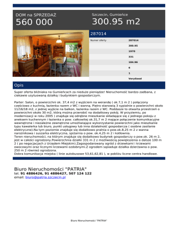 Szczecin, Gumieńce DOM na SPRZEDAŻ 300.95 m2 560 000 287014 Numer oferty 287014 300.95 1970 331 184.96 6 1 VeryGood Opis Super oferta bliźniaka na Gumieńcach za nieduże pieniądze! Nieruchomość bardzo zadbana, z ciekawie usytuowaną działką i budynkiem gospodarczym. Parter: Salon, o powierzchni ok. 37,4 m2 z wyjściem na werandę ( ok.7,1 m 2 ) połączony częściowo z kuchnią, łazienka razem z WC i wanną. Piętro stanowią 3 sypialnie o powierzchni około 11/16/18 m2, z jednej wyjście na balkon, łazienka razem z WC. Poddasze to otwarta przestrzeń o powierzchni około 30 m2, którą można przerobić na dodatkowy pokój. W przyziemiu, po modernizacji w roku 2005 ) znajduje się odrębne mieszkanie składające się z jednego pokoju z aneksem kuchennym i łazienka o pow. całkowitej ok.31,7 m 2 mające połączenie komunikacyjne wewnętrzne i niezależne zewnętrzne umożliwiające wykorzystanie powierzchni jako mieszkanie typu kawalerka lub biuro, punkt usługowy lub inna działalność gospodarcza ( osobne zasilanie elektryczne).Na tym poziomie znajduje się dodatkowo pralnia o pow.ok.8,25 m 2 z wanna narożnikowa i suszarka elektryczna, spiżarnia o pow. ok.4,25 m 2 i kotłownia. Teren nieruchomości, na którym znajduje się dodatkowo budynek gospodarczy o pow.ok. 26 m 2, jest w całości ogrodzony.Powierzchnia działki 331 m 2 z możliwością powiększenia o dalsze 100 m 2 ( po negocjacjach z Urzędem Miejskim).Zagospodarowany ogród z drzewkami i krzewami owocowymi oraz licznymi krzewami ozdobnymi.Z ogrodem sąsiaduje działka dzierżawna o pow. 250 m 2 również ogrodzona. Dobra komunikacja miejska ( linie autobusowe 53,61,62,81 ), w pobliżu liczne centra handlowe. Biuro Nieruchomości "PATRIA" tel. 91 4886426, 91 4886427, 507 124 122 email: [email protected] Biuro Nieruchomości "PATRIA" Powered by TCPDF (www.tcpdf.org)