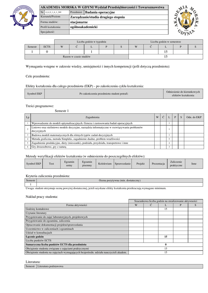 AKADEMIA MORSKA W GDYNI Wydział Przedsiębiorczości i Towaroznawstwa Nr 4_6_0_1_6_1_269 Przedmiot: Badania operacyjne Kierunek/Poziom Zarządzanie/studia drugiego stopnia Forma studiów: stacjonarne Profil kształcenia: ogólnoakademicki Specjalność: Liczba godzin w tygodniu Semestr ECTS 1 0 W Ć L P Liczba godzin w semestrze S W Ć L 1 P S 15 15 Razem w czasie studiów Wymagania wstępne w zakresie wiedzy, umiejętności i innych kompetencji (jeśli dotyczą przedmiotu): Cele przedmiotu: Efekty kształcenia dla całego przedmiotu (EKP) - po zakończeniu cyklu kształcenia: Symbol EKP Odniesienie do kierunkowych efektów kształcenia Po zakończeniu przedmiotu student potrafi: Treści programowe: Semestr 1 Lp Zagadnienia W Ć L 1 Wprowadzenie do modeli optymalizacyjnych. Geneza i zastosowania badań operacyjnych 1 2 Liniowe oraz nieliniowe modele decyzyjne, narzędzia informatyczne w rozwiązywaniu problemów decyzyjnych 1 3 4 5 6 Budowa modeli matematycznych dla różnych typów zadań decyzyjnych Metoda graficzna, metoda Simpleks, zagadnienie dualne, problem wrażliwości Zagadnienie produkcyjne, diety (mieszanki), podziału, przydziału, transportowe i inne Gry dwuosobowe, gry z naturą P S Odn. do EKP 1 5 4 3 Metody weryfikacji efektów kształcenia (w odniesieniu do poszczególnych efektów): Symbol EKP Test Egzamin ustny Egzamin pisemny Kolokwium Sprawozdanie Projekt Prezentacja Zaliczenie praktyczne Inne Kryteria zaliczenia przedmiotu: Semestr Ocena pozytywna (min. dostateczny) 1 Uwaga: student otrzymuje ocenę powyżej dostatecznej, jeżeli uzyskane efekty kształcenia przekraczają wymagane minimum. Nakład pracy studenta: Forma aktywności Godziny kontaktowe Czytanie literatury Przygotowanie do zajęć laboratoryjnych, projektowych Przygotowanie do egzaminu, zaliczenia Opracowanie dokumentacji projektu/sprawozdania Uczestnictwo w zaliczeniach i egzaminach Udział w konsultacjach Łącznie godzin Liczba punktów ECTS Sumaryczna liczba punktów ECTS dla przedmiotu Obciążenie studenta związane z zajęciami praktycznymi Obciążenie studenta na zajęciach wymagających bezpośredn. udziału nauczycieli akadem. Literatura: Semestr Literatura podstawowa Szacunkowa liczba godzin na zrealizowanie aktywności W Ć L P S 15 15 0 15 15 1 Semestr 1 1. Grabowski W., „Programowanie matematyczne”, PWE, Warszawa 1980 2. Gruszczyński M., Podgórska M. (red.), „Ekonometria”, SGH, Warszawa, 2004 3. Ignasiak E. (red.), „Badania operacyjne”, PWE, Warszawa, 2001 4. Krawczyk S. (red.), „Programowanie matematyczne. Zbiór zadań”, PWE, Warszawa 1978 5. Kukuła K. (red.), „Badania operacyjne w przykładach i zadaniach”, PWN, Warszawa, 19976. Lange O., „ Optymalne decyzje, zasady programowania”, PWN, Warszawa, 1967 7. Wagner H.M., „Badania operacyjne”, PWE, Warszawa 19808. Van der Veen B., „Wstęp do badań operacyjnych”, PWN, Warszawa, 1974 9. Wayne L., „Operations Research. Applications and Algorithms”, PWS-Kent Publishing Company, Boston, 1991 Literatura uzupełniająca 1. Anderson R., D., Sweeney D., J., Williams T., A., „An Introduction to Management Science” [w:] „Quantitative Approaches to Decision Making”, West Publishing Company St. Paul, New York, Los Angeles, San Francisco 1991 2. Gauss S.I., „Programowanie liniowe”, PWN, Warszawa, 1963 3. Kozubski J.J. „Wybrane zagadnienia badań operacyjnych w transporcie”, Wydawnictwo UG, Gdańsk, 1976 4. Krzysztofiak M. (red.), „Ekonometria”, PWE, Warszawa, 1979 5. Miszczyński M., Programowanie liniowe. Elementy teorii i zadania, Absolwent, Łódź, 1996 6. Wencel J.S., „Elementy teorii gier”, PWN, Warszawa, 1961 Prowadzący przedmiot: Tytuł/stopień, Imię i Nazwisko 1. Osoba odpowiedzialna za przedmiot Jednostka dydaktyczna dr hab. Kazimierz Krauze prof. nadzw. AM KEiZ dr hab. Kazimierz Krauze prof. nadzw. AM dr Krzysztof Sarnowski KEiZ KEiZ 2. Pozostałe osoby prowadzące zajęcia AKADEMIA MORSKA W GDYNI Wydział Przedsiębiorczości i Towaroznawstwa Nr 4_6_0_1_6_1_325 Przedmiot: Etyka w zarządzaniu Kierunek/Poziom Zarządzanie/studia drugiego stopnia Forma studiów: stacjonarne Profil kształcenia: ogólnoakademicki Specjalność: Liczba godzin w tygodniu Semestr ECTS W 1 2 2 Ć L P Liczba godzin w semestrze S W Ć L P S 30 30 Razem w czasie studiów Wymagania wstępne w zakresie wiedzy, umiejętności i innych kompetencji (jeśli dotyczą przedmiotu): 1 znajomość podstaw etyki lub filozofii Cele przedmiotu: 1 poznanie i zrozumienie i zastosowanie wiedzy o tym jak sprzyjać dobru wspólnemu i jednocześnie realizować własne moralnie uprawnione cele w zarządzaniu Efekty kształcenia dla całego przedmiotu (EKP) - po zakończeniu cyklu kształcenia: Symbol EKP Odniesienie do kierunkowych efektów kształcenia Po zakończeniu przedmiotu student potrafi: EKP_1 identyfikuje i wyjaśnia uwarunkowania etyczne funkcjonowania przedsiębiorstw na rynku K_W03 EKP_1 zna i wyjaśnia procesy przemian etycznych i ich wpływ na funkcjonowanie organizacji K_W16 EKP_2 dokonywanie obserwacji zjawisk i procesów w organizacji oraz ich analizy i interpretacji K_U04 przestrzeganie i propagowanie etycznej postawy i wrażliwości społecznej w organizacji K_K08 Treści programowe: Semestr 1 Lp Zagadnienia W 1 Etyka jako nauka o moralności, etyczny wymiar relacji międzyludzkich i społecznych Charakterystyka podstawowych norm moralnych: w obronie życia biologicznego, w obronie godności, normy służące organizacji życia społecznego, stojące na straży sprawiedliwości i służące potrzebie zaufania 3 EKP_1 4 EKP_1 3 Etyka w teorii i praktyce życia gospodarczego. 4 EKP_1 i+ EKP_2 4 4 7 Odpowiedzialność społeczna biznesu i przedsiębiorstwa - idea a praktyka SRI i CSR Wartość pracy zarobkowej Miejsce i rola etyki w zarządzaniu. Sens ekonomiczny etyki w zarządzaniu Programy standaryzacji postaw etycznych w organizacji 8 Zapobieganie i sprzeciw wobec zachowań nieetycznych w biznesie 2 2 