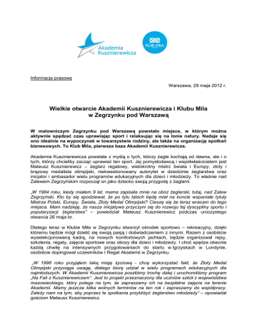 Informacja prasowa Warszawa, 29 maja 2012 r. Wielkie otwarcie Akademii Kusznierewicza i Klubu Mila w Zegrzynku pod Warszawą W malowniczym Zegrzynku pod Warszawą powstało miejsce, w którym można aktywnie spędzać czas uprawiając sport i relaksując się na łonie natury. Nadaje się ono idealnie na wypoczynek w towarzystwie rodziny, ale także na organizację spotkań biznesowych. To Klub Mila, pierwsza baza Akademii Kusznierewicza. Akademia Kusznierewicza powstała z myślą o tych, którzy żagle kochają od dawna, ale i o tych, którzy chcieliby zacząć uprawiać ten sport. Jej pomysłodawcą i współwłaścicielem jest Mateusz Kusznierewicz – żeglarz regatowy, wielokrotny mistrz świata i Europy, złoty i brązowy medalista olimpijski, niekwestionowany autorytet w dziedzinie żeglarstwa oraz inicjator i ambasador wielu programów edukacyjnych dla dzieci i młodzieży. To właśnie nad Zalewem Zegrzyńskim rozpoczął on jako dziecko swoją przygodę z żaglami. „W 1984 roku, kiedy miałem 9 lat, mama zapisała mnie na obóz żeglarski, tutaj, nad Zalew Zegrzyński. Kto by się spodziewał, że po tylu latach będę miał na koncie wspaniałe tytuły Mistrza Polski, Europy, Świata, Złoty Medal Olimpijski? Cieszę się że teraz wracam do tego miejsca. Mam nadzieję, że nasza inicjatywa przyczyni się do rozwoju tej dyscypliny sportu i popularyzacji żeglarstwa” – powiedział Mateusz Kusznierewicz podczas uroczystego otwarcia 26 maja br. Dlatego teraz w Klubie Mila w Zegrzynku stworzył ośrodek sportowo – rekreacyjny, dzięki któremu będzie mógł dzielić się swoją pasją i doświadczeniem z innymi. Razem z osobiście wyselekcjonowaną kadrą, na nowych komfortowych jachtach, będzie organizował rejsy, szkolenia, regaty, zajęcia sportowe oraz obozy dla dzieci i młodzieży. I choć spędza obecnie każdą chwilę na intensywnych przygotowaniach do startu w Igrzyskach w Londynie, osobiście dopingował uczestników I Regat Akademii w Zegrzynku. „W 1996 roku przyjąłem taką misję życiową - chcę wykorzystać fakt, że Złoty Medal Olimpijski przyciąga uwagę, dlatego biorę udział w wielu programach edukacyjnych dla najmłodszych. W Akademii Kusznierewicza poszliśmy trochę dalej i uruchomiliśmy program „Na Fali z Kusznierewiczem”. Jest to projekt przeznaczony dla uczniów szkół z województwa mazowieckiego, który polega na tym, że zapraszamy ich na bezpłatne zajęcia na terenie Akademii. Mamy jeszcze kilka wolnych terminów na ten rok i zapraszamy do współpracy. Zależy nam na tym, aby poprzez te spotkania przybliżyć żeglarstwo młodzieży” – opowiadał gościom Mateusz Kusznierewicz. Podczas uroczystego otwarcia miłośnicy żeglarstwa mieli okazję spróbować swoich sił w regatach na jachtach Sigma Club, łódkach z floty Akademii. Wśród gości, którzy odwiedzili Klub Mila pojawili się m.in. Marta Kuligowska z rodziną, Katarzyna Montgomery, burmistrz gminy Serock Sylwester Sokolniki, Wojciech Eichelberger, Dominika Figurska spodziewająca się czwartego dziecka oraz Anna Klara Majewska z mężem Cezarym Stypułkowskim. Niektórzy skorzystali z bazy noclegowej dla ponad 120 osób, którą oferuje Klub Mila. Dodatkowo goście pierwszej bazy Akademii Kusznierewicza mają do dyspozycji dwie sale konferencyjne, restaurację, Klub Kapitański, tradycyjną saunę, a także miejsce na grill i ognisko oraz parking. Zaproszeni goście i ich dzieci skorzystali z licznych atrakcji, w tym z rejsów jachtem kabinowym, wyprawy rowerowo-kajakowej i parku linowego. Wszystkie mamy, z okazji ich święta, miały do dyspozycji Strefę Relaks i liczne niespodzianki. Wieczorem odbyło się Garden Party nad jeziorem i chrzest floty. Do roli matki chrzestnej Mateusz Kusznierewicz zaprosił Patricię Kazadi. Zgodnie z ideą Akademii Kusznierewicza był to pełen wrażeń dzień w Klubie Mila zarówno dla tych, którzy kochają sport, jak i dla tych, którzy przyjechali tylko po to, by zrelaksować się i wyciszyć w otoczeniu natury. Więcej informacji udzieli: Monika Falk BC MFD Media Communications tel. 22 403 50 91 mail: [email protected]