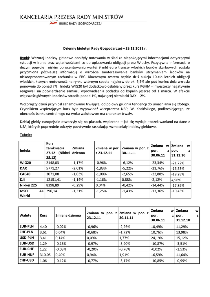 Dzienny biuletyn Rady Gospodarczej – 29.12.2011 r. Rynki: Wczoraj indeksy giełdowe obniżyły notowania w ślad za niepokojącymi informacjami dotyczącymi sytuacji w Iranie oraz wątpliwościami co do uplasowania obligacji przez Włochy. Pozytywna informacja o dużym popycie i niskim oprocentowaniu wartej 9 mld euro transzy włoskich bonów skarbowych została przyćmiona późniejszą informacją o wzroście zainteresowania banków utrzymaniem środków na niskooprocentowanym rachunku w EBC. Kluczowym testem będzie dziś aukcja 10-cio letnich obligacji włoskich, których rentowność na rynku wtórnym spadła najpierw do ok. 6,5% ale pod koniec dnia wzrosła ponownie do ponad 7%. Indeks WIG20 był dodatkowo osłabiany przez kurs KGHM - inwestorzy negatywnie reagowali na potwierdzenie zamiaru wprowadzenia podatku od kopalin jeszcze od 1 marca. W efekcie większość głównych indeksów straciła ponad 1%, najwięcej niemiecki DAX – 2%. Wczorajszy dzień przyniósł zahamowanie trwającej od polowy grudnia tendencji do umacniania się złotego. Czynnikiem wspierającym kurs była wypowiedź wiceprezesa NBP, W. Kozińskiego, podkreślającego, że obecnośc banku centralnego na rynku walutowym ma charakter trwały. Dzisiaj giełdy europejskie otworzyły się na plusach, wspierane – jak się wydaje –oczekiwaniami na dane z USA, których poprzednie odczyty pozytywnie zaskakując wzmacniały indeksy giełdowe. Tabele: Kurs zamknięcia Indeks 27.12 (Nikkei 28.12) WIG20 2148,03 DAX 5771,27 CAC40 3071,08 DJI 12151,41 Nikkei 225 8398,89 MSCI AC 296,14 World Zmiana dzienna Zmiana w Zmiana w Zmiana w por. Zmiana w por. z por. z por. z z 23.12.11 30.11.11 30.06.11 31.12.10 -1,17% -2,01% -1,03% -1,14% -0,29% -1,31% -0,96% -1,83% -1,00% -1,16% 0,04% -1,25% -6,12% -5,22% -2,65% 0,88% -0,42% -1,43% -23,34% -21,76% -22,88% -2,12% -14,44% -13,36% Waluty Kurs Zmiana dzienna Zmiana Zmiana w por. z Zmiana w por. z por. 23.12.11 30.11.11 30.06.11 EUR-PLN CHF-PLN USD-PLN EUR-USD EUR-CHF EUR-HUF CHF-USD 4,40 3,61 3,41 1,29 1,22 310,05 1,06 -0,02% 0,04% 0,14% -0,16% -0,03% 0,40% -0,12% -0,96% -0,68% 0,09% -0,97% -0,20% 0,94% -0,77% -2,26% -1,72% 1,77% -3,90% -0,76% 1,91% -3,17% 10,49% 10,76% 24,19% -10,87% -0,02% 16,59% -10,85% -21,72% -16,53% -19,28% 4,96% -17,89% -10,43% w Zmiana z por. 31.12.10 11,29% 13,98% 15,12% -3,51% -2,53% 11,64% -0,99% w z Rentowności obligacji 10Y Zmiana dzienna Zmiana w por. z Zmiana w por. z denominowanych w (pkt. bazowe) 16.12.11 (pb.) 30.11.11 (pb.) walucie krajowej (%) Niemcy Francja Hiszpania Polska Włochy Węgry 1,90 3,01 5,23 5,86 7,03 0 -3 0 -6 5 -9 0 -8 3 15 9,65 12 65 -40 -53 -128 -20 -34 20 UE: Wybory parlamentarne w Grecji przesunięto na kwiecień. Technokratyczny rząd ekspertów, których zadaniem jest wdrożenie trudnych i kosztownych społecznie reform uznał, iż potrzebuje dodatkowych dwóch miesięcy na zamknięcie negocjacji z bankami odnośnie wartego 100 mld euro odpisu zadłużenia Grecji wobec sektora prywatnego. W styczniu planowana jest kolejna runda wizyt ekspertów MFW, KE i EBC oceniających stan wdrażania pakietu reform i możliwość uruchomienia kolejnego pakietu wartej 130 mld euro pomocy. MFW uzależnia wznowienie negocjacji w sprawie nowej pożyczki dla Węgier od reakcji rządu na zastrzeżenia MFW i KE. Eksperci obu organizacji kwestionują projekt ustawy zwiększającej wpływ rządu na bank centralny oraz pomysł wprowadzenia jednolitej stawki podatku dochodowego. Zawieszenie negocjacji pomiędzy rządem Węgier a MFW i KE coraz bardziej niepokoi rynki. Kolejny dzień słabł kurs forinta w stosunku do euro osiągając wczoraj poziom 308,80 HUF za euro. Poza zadłużeniem wewnętrznym, w 2012 roku Węgry muszą spłacić ponad 4,8 mld euro zagranicznych pożyczek. Dane: Włochy sprzedały w środę na aukcji półroczne bony o wartości 9 mld euro. Rentowność wyniosła 3,251 proc. wobec 6,504 proc. na aukcji 25 listopada. Stosunek popytu do podaży wyniósł 1,69 wobec 1,47 podczas aukcji w listopadzie. Sprzedane zostały również dwuletnie obligacje o wartości 1,733 mld euro rentowność spadła do 4,853% wobec 7,814% przed miesiącem, a stosunek popytu do podaży wyniósł 2,24 wobec 1,59 wcześniej Na dziś planowana jest aukcja obligacji o wartości 8,5 mld euro. Szwajcarski indeks wskaźników wyprzedzających koniunktury KOF spadł do poziomu 0,01 (z 0,34) – poniżej oczekiwań i najniżej od sierpnia 2009 r. Włoski urząd statystyczny ISTAT poinformował o spadku wyrównanego sezonowo wskaźnika koniunktury do najniższego od dwóch lata poziomu 92,5 pkt. (z 94,4 pkt. w listopadzie). Indeks włoskiej giełdy nie zareagował w sposób znaczący na publikację. Dzisiejsze publikacje: Czas publikacji 11:00 Kraj Raport Okres Prognoza Poprzednia Strefa Euro Podaż pieniądza M3 listopad 2,5% r/r 2,6% r/r 15:00 Niemcy Inflacja konsumencka - wst. grudzień 15:30 USA Wnioski o zasiłek dla bezrobotnych tydzień 375 tys. 364 tys. 16:45 USA Indeks Chicago PMI 17:00 USA Indeks podpisanych domów grudzień umów kupna listopad 61 62,6 1,9% m/m 10,4% m/m Źródło: macronext.pl Inne: Turcja wyraziła zgodę na przebieg gazociągu South Stream przez swoje wody terytorialne, usuwając w ten sposób ostatnią przeszkodę która wstrzymywała Rosję przed rozpoczęciem prac nad drugim (po nitce północnej) gazociągiem w kierunku UE. Turecka decyzja zaskoczyła komentatorów, szczególnie po listopadowych zapowiedziach Ankary o nieprzedłużaniu umowy z rosyjskim Gazpromem. Decyzja ta może potencjalnie wpłynąć na zaangażowanie Turcji w projekt europejskiego gazociągu Nabucco, który przebiegając po dnie morza śródziemnego zapewniać miał dywersyfikację dostaw gazu; jest też kolejnym przykładem zauważalnego oziębienia stosunków Turcji z Unią Europejską i niektórymi państwami członkowskimi. Turecka lira osiągnęła najniższy poziom w stosunku do dolara, a obligacje zanotowały znaczący wzrost po wypowiedziach