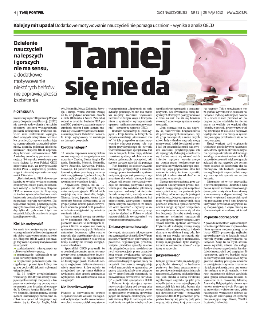 4 TWÓJ PORTFEL GŁOS NAUCZYCIELSKI NR 21 23 MAJA 2012 WWW.GLOS.PL Kolejny mit upada! Dodatkowe motywowanie nauczycieli nie pomaga uczniom – wynika a analiz OECD PIOTR SKURA Najnowszy raport Organizacji Współpracy Gospodarczej i Rozwoju (OECD) nie wywoła zadowolenia u krytyków obecnego systemu wynagradzania polskich nauczycieli. Podważa bowiem sens uzależniania wynagrodzeń uczących od wyników uczniów. Na pytanie „Czy system uzależniający wynagrodzenia nauczycieli od wyników uczniów polepsza jakość nauczania?” eksperci OECD odpowiadają bowiem jednoznacznie: NIE. A wiedzą, co mówią, ponieważ zrzeszająca 34 wysoko rozwinięte państwa świata (w tym Polskę) OECD odpowiada m.in. za przygotowanie badań PISA – najbardziej prestiżowego i miarodajnego testu umiejętności 15-latków. „Doświadczenia PISA dawno pokazały, że wysoko wydajne systemy edukacyjne często płacą nauczycielom więcej” – podkreślają eksperci PISA w swoim raporcie. Przyznają, że trudna sytuacja budżetowa wielu krajów nie pozwala odpowiednio wynagradzać tej grupy zawodowej. Dlatego coraz częściej pojawiają się pomysły kierowania większych pieniędzy tylko do tych szkół i tych nauczycieli, których uczniowie osiągają najlepsze wyniki. Kto i jak motywuje? Na razie tzw. motywacyjny system wynagradzania belfrów jest generalnie słabo rozpowszechniony na świecie. Eksperci OECD wzięli pod uwagę trzy różne sposoby motywowania nauczycieli: » uzależnienie ich miesięcznych zarobków od efektów pracy; » premiowanie najlepszych w postaci corocznych nagród; » wypłacanie jednorazowych, nieregularnych premii tym, którzy mogą się pochwalić jakimiś wybitnymi osiągnięciami. Na 36 krajów uwzględnionych w rankingu OECD tylko cztery stosują wszystkie rodzaje motywacji – tzn. poprzez comiesięczną pensję, roczne premie oraz incydentalne nagrody. To Czechy, Anglia, Holandia i Nowa Zelandia. Siedem państw stosuje system uzależniający miesięczne zarobki nauczycieli od osiąganych wyników. Są to: Czechy, Anglia, Mek- Taniej się nie da syk, Holandia, Nowa Zelandia, Szwecja i Turcja. Warto zwrócić uwagę na to, że jedynie uczniowie dwóch z nich (Holandia i Nowa Zelandia) zebrali w ostatnim badaniu PISA ponad 500 punktów z czytania oraz rozumienia tekstu i tym samym znaleźli się w światowej czołówce badania umiejętności 15-latków. Pozostałe kraje wylądowały w rankingu na dalszych pozycjach. Co robią najlepsi? 11 krajów zapewnia nauczycielom roczne nagrody za osiągnięcia w nauczaniu – Czechy, Dania, Anglia, Estonia, Finlandia, Meksyk, Holandia, Nowa Zelandia, Nor wegia, Polska, Słowacja. 14 państw dopuszcza natomiast system premiujący nauczycieli w wy jątkowych, jednostkowych sytuacjach (większość z nich to już wymienione wcześniej kraje). Największa grupa, bo aż 17 państw, nie stosuje żadnych systemów motywacyjnych. Wśród nich znajdują się m.in.: Australia, Belgia, Niemcy, Izrael, Japonia, Korea, Luksemburg, Szkocja i Szwajcaria. W tej grupie jest aż siedem państw z wynikiem uczniów ponad 500 punktów w badaniu umiejętności czytania i rozumienia tekstu. Warto zwrócić uwagę na czołówkę w badaniach PISA. Zajmujące pierwsze miejsca w rankingach Japonia i Korea w ogóle nie stosują systemów motywacyjnych. Finlandia natomiast dopuszcza tylko roczne nagrody dla wyróżniających się nauczycieli. Rywalizujące z całą trójką Chiny niestety nie zostały uwzględnione w badaniu. Specjaliści OECD przyznali, że w ocenie skuteczności systemów motywacyjnych nie pomogło to, że „empiryczne analizy są niejednoznaczne. Efekty są po prostu trudne do oceny ze względu na nieliczne dane oraz wiele aspektów, które należy tu uwzględnić, jak np. sama definicja wydajności albo sposób zmierzenia wydajności lub zastosowana skala osiągnięć”. Nie liberalizować płac Płynące z doświadczeń prawie 40 państw świata wnioski nie są jednak optymistyczne dla zwolenników rewolucji w nauczycielskim systemie wynagradzania. „Spojrzenie na całą sytuację pokazuje, że nie ma związku między średnimi wynikami uczniów w danym kraju a korzystaniem z systemów wynagradzania opartych na finansowym motywowaniu” – czytamy w raporcie OECD. Badacze dopuszczają tu jeden wyjątek – kraje biedne, w których nauczyciele zarabiają „stosunkowo mało”. W ich przypadku system motywacyjny odgrywa pewną rolę magnesu przyciągającego do zawodu wykwalifikowanych specjalistów. Jednak w krajach, które mają stabilne i zasobne systemy szkolnictwa oraz dobrze opłacanych nauczycieli, taki system bardziej szkodzi niż pomaga. Tym bardziej że skonstruowanie uczciwego, przejrzystego i akceptowanego przez środowisko systemu motywacyjnego jest poważnym wyzwaniem dla władz danego kraju. „Nawet jeśli system motywacyjny wydaje się możliwą politycznie opcją, ważne jest, aby wiedzieć, jak należy ten sys tem wdrożyć skutecznie. Przede wszystkim, metody mierzenia osiągnięć nauczycieli muszą być odpowiednie, wiarygodne i uznane przez samych nauczycieli za uczciwe oraz rzetelne” – czytamy w raporcie OECD. Nie wystarczy więc – jak to słychać w Polsce – oddać nauczycielskich wynagrodzeń we władanie samorządowców. Zmiana systemu kosztuje Co więcej, stworzenie takiego systemu wymaga dużych nakładów. W państwach, w których on obowiązuje, to poważne, organizacyjne przedsięwzięcie. „Niektóre sposoby mierzenia osiągnięć oparte są na wielostronnych obserwacjach przez przeszkoloną grupę ewaluatorów używających wystandaryzowanych arkuszy odzwierciedlających sposób pracy nauczycieli. Inni jeszcze uwzględniają wkład nauczyciela w generalną poprawę działania szkoły oraz osiągnięcia w specyficznych obszarach, co poświadczają zewnętrzne certyfikaty” – podkreślili specjaliści z OECD. Kolejne kraje stosujące system motywacyjny biorą pod uwagę osiągnięcia ucznió