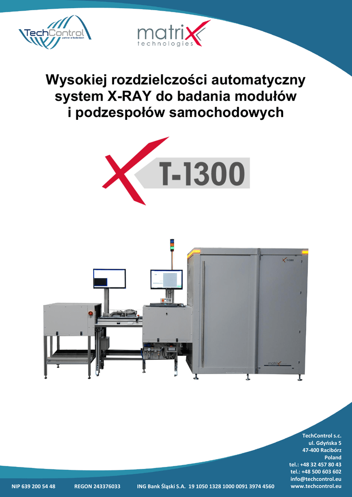 Wysokiej rozdzielczości automatyczny system X-RAY do badania modułów i podzespołów samochodowych NIP 639 200 54 48 REGON 243376033 ING Bank Śląski S.A. 19 1050 1328 1000 0091 3974 4560 TechControl s.c. ul. Gdyńska 5 47-400 Racibórz Poland tel.: +48 32 457 80 43 tel.: +48 500 603 602 [email protected] www.techcontrol.eu System z serii XT-1300 pozwalają na najwyższej jakości automatyczne badanie inline metodą X-RAY modułów i podzespołów. Systemy znajdują zastosowanie głównie w sektorach Automotive i Aerospace. System wyposażony jest w źródło 130kV z mikrofokusem i system transportowy łatwy do zaadaptowania do każdej aplikacji. Zintegrowana biblioteka badania zawiera algorytmy dla standardowej kontroli SMD złączy a także połączeń płytek obwodów drukowanych. MIPS_Tune – pakiet oprogramowania off-line to generowania programów badania z automatycznym importem CAD lub alternatywnie bez danych CAD. Oprogramowanie obsługuje listę generowaną przy badaniu automatycznym na podstawie zaawansowanych algorytmów do transmisji danych i kontroli połączeń off-axis. Zintegrowana funkcja generowania norm pozwala na manualne bądź automatyczne ich tworzenie. Moduł MIPS_Verify będący koncepcją układu zamkniętego pozwala na test in-line i off-line przy użyciu układu wyświetlenia tablicy graficznej i zdjęcia X-Ray z zaznaczeniem wady. MIPS-Verify może być połączony z wspólną platformą inspekcyjną AOI. Moduł czasu rzeczywistego MIPS_SPC zapewnia kontrolę procesu w czasie rzeczywistym z natychmiastowym feedbackiem z linii produkcyjnej. Właściwości urządzenia Technologia Transmission X-Ray & 3D Slice-Filter Źródło 135 kV mikrofokus Podwójny 4/2 wzmacniacz obrazu Wydajny handling z systemem transportowym i programowalnym stołem XY Automatyczna kalibracja skali szarości i geometrii Ruch osi-Z dla różnych wielkości pola widzenia skaner kodów kreskowych (1D/2D) Jednostronne ładowanie i rozładowanie Opcjonalnie: system ruchu detektora dla obrazów z off-axis NIP 639 200 54 48 REGON 243376033 MIPS Hardware Stacja PC z wielordzeniowym procesorem Windows XP / Windows 7 MIPS – Platforma inspekcyjna Zaawansowana biblioteka algorytmów Technologia SFT i ATC Lokalizacja obiektów z automatyczną detekcją Biblioteka algorytmów dla testów Programowanie off-line Weryfikacja i kontrola procesu Link MIPS_Verify MIPS_SPC ING Bank Śląski S.A. 19 1050 1328 1000 0091 3974 4560 TechControl s.c. ul. Gdyńska 5 47-400 Racibórz Poland tel.: +48 32 457 80 43 tel.: +48 500 603 602 [email protected] www.techcontrol.eu XT – 1300 Standard 135 kV Wymiary Kabina 2100 mm (W) x 1850 mm (G) x 1835 mm (S) System transportujący 1050 mm (G) x 1670 mm (G) x 750 mm (S) + W 800 – 1000 mm Waga ok. 3 t Temperatura pracy 15 – 32 C Napięcie 400V, 50/60 Hz, 10 A śr, 32 A max., 3 faza Powietrze 5 – 7 bar System ruchu Programowalny stół X-Y Driving distance 500 x 770 mm Powtarzalność pozycji +/- 25 µm Z-Drive Źródło X-RAY Oś-Z Driving distance 220 mm Opcjonalnie ekspozycja pod kątem, programowalne osie U i V detektora Źródło X-RAY Napięcie 40 – 130 kV Natężenie prądu 0 – 300 µA Wielkość focal spot 5 – 10 mikronów Orientacja źródła Okno końcowe Detektor Typ 4’’/2’’ wzmacniacz obrazu Camera 1028 x 1028 pikseli / 10 Bit Wyjście Video Wyświetlacz Video Wysokiej rozdzielczości 22’’ TFT Wielkość elementów Wymiary systemu transportowego 640mm x 320mm Maksymalna wysokość elementów 240 mm Maksymalna waga elementów 10 kg Obrazy Maksymalna powierzchnia inspekcji 570 mm x 250 mm Obszar widoczności obrazu 15 mm do 35 mm Bezpieczeństwo System spełnia wszystkie standardy dla kabin radiograficznych. Dyrektywy CDHR, znak CE NIP 639 200 54 48 REGON 243376033 ING Bank Śląski S.A. 19 1050 1328 1000 0091 3974 4560 TechControl s.c. ul. Gdyńska 5 47-400 Racibórz Poland tel.: +48 32 457 80 43 tel.: +48 500 603 602 [email protected] www.techcontrol.eu