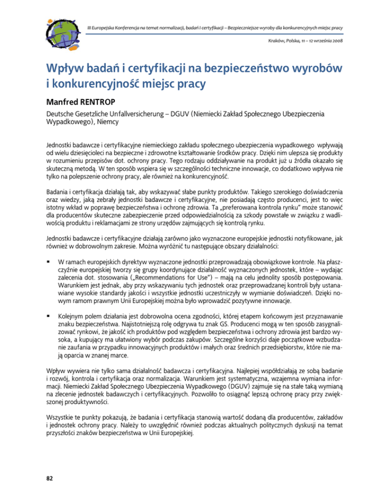 III Europejska Konferencja na temat normalizacji, badań I certyfikacji – Bezpieczniejsze wyroby dla konkurencyjnych miejsc pracy Kraków, Polska, 11 – 12 września 2008 Wpływ badań i certyfikacji na bezpieczeństwo wyrobów i konkurencyjność miejsc pracy Manfred RENTROP Deutsche Gesetzliche Unfallversicherung – DGUV (Niemiecki Zakład Społecznego Ubezpieczenia Wypadkowego), Niemcy Jednostki badawcze i certyfikacyjne niemieckiego zakładu społecznego ubezpieczenia wypadkowego wpływają od wielu dziesięcioleci na bezpieczne i zdrowotne kształtowanie środków pracy. Dzięki nim ulepsza się produkty w rozumieniu przepisów dot. ochrony pracy. Tego rodzaju oddziaływanie na produkt już u źródła okazało się skuteczną metodą. W ten sposób wspiera się w szczególności techniczne innowacje, co dodatkowo wpływa nie tylko na polepszenie ochrony pracy, ale również na konkurencyjność. Badania i certyfikacja działają tak, aby wskazywać słabe punkty produktów. Takiego szerokiego doświadczenia oraz wiedzy, jaką zebrały jednostki badawcze i certyfikacyjne, nie posiadają często producenci, jest to więc istotny wkład w poprawę bezpieczeństwa i ochronę zdrowia. Ta „preferowana kontrola rynku“ może stanowić dla producentów skuteczne zabezpieczenie przed odpowiedzialnością za szkody powstałe w związku z wadliwością produktu i reklamacjami ze strony urzędów zajmujących się kontrolą rynku. Jednostki badawcze i certyfikacyjne działają zarówno jako wyznaczone europejskie jednostki notyfikowane, jak również w dobrowolnym zakresie. Można wyróżnić tu następujące obszary działalności: W ramach europejskich dyrektyw wyznaczone jednostki przeprowadzają obowiązkowe kontrole. Na płaszczyźnie europejskiej tworzy się grupy koordynujące działalność wyznaczonych jednostek, które – wydając zalecenia dot. stosowania („Recommendations for Use“) – mają na celu jednolity sposób postępowania. Warunkiem jest jednak, aby przy wskazywaniu tych jednostek oraz przeprowadzanej kontroli były ustanawiane wysokie standardy jakości i wszystkie jednostki uczestniczyły w wymianie doświadczeń. Dzięki nowym ramom prawnym Unii Europejskiej można było wprowadzić pozytywne innowacje. Kolejnym polem działania jest dobrowolna ocena zgodności, której etapem końcowym jest przyznawanie znaku bezpieczeństwa. Najistotniejszą rolę odgrywa tu znak GS. Producenci mogą w ten sposób zasygnalizować rynkowi, że jakość ich produktów pod względem bezpieczeństwa i ochrony zdrowia jest bardzo wysoka, a kupujący ma ułatwiony wybór podczas zakupów. Szczególne korzyści daje początkowe wzbudzanie zaufania w przypadku innowacyjnych produktów i małych oraz średnich przedsiębiorstw, które nie mają oparcia w znanej marce. Wpływ wywiera nie tylko sama działalność badawcza i certyfikacyjna. Najlepiej współdziałają ze sobą badanie i rozwój, kontrola i certyfikacja oraz normalizacja. Warunkiem jest systematyczna, wzajemna wymiana informacji. Niemiecki Zakład Społecznego Ubezpieczenia Wypadkowego (DGUV) zajmuje się na stałe taką wymianą na zlecenie jednostek badawczych i certyfikacyjnych. Pozwoliło to osiągnąć lepszą ochronę pracy przy zwiększonej produktywności. Wszystkie te punkty pokazują, że badania i certyfikacja stanowią wartość dodaną dla producentów, zakładów i jednostek ochrony pracy. Należy to uwzględnić również podczas aktualnych politycznych dyskusji na temat przyszłości znaków bezpieczeństwa w Unii Europejskiej. 82