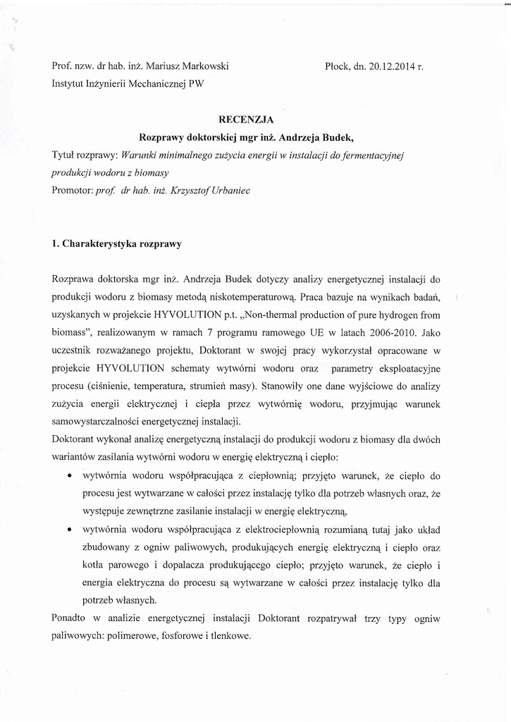 Prof. nzw. dr hab. inz. Mariusz Markowski Plock, dn. 20.12.2014 r. Instytut Inzynierii Mechanicznej PW RECENZJA Rozprawy doktorskiej mgr in2. Andrzeja Budek, Tytul rozprary: Warunki minimalnego zu|ycia energii w instalacji do fermentacyjnej produkcji wodoru z biomasy Promotor: prof, dr hab. inz. Krzysztof Urbaniec rozprawy 1. Charakterystyka Rozprawa doktorska mgr inz. Andrzeja Budek dotyczy analizy energetycznej instalacji do produkcji wodoru z biomasy metod4 niskotemperaturow4. Praca bazuje na wynikach badari, uzyskanych w projekcie HYVOLUTION p.t. ,,Non-thermal production of pure hydrogen from biomass", realizowanym w ramach 7 programu ramowego UE w latach 2006-2010. uczestnik rozwalanego projektu, Doktorant w Jako swojej pracy wykorzystal opracowane w oraz projekcie HYVOLUTION schematy wytw6mi wodoru parametry eksploatacyjne procesu (ciSnienie, temperatura, strumief masy). Stanowily one dane wyjSciowe do analizy zuLycia energii elektrycznej s amowystarczalno S ci i ciepla przez wytw6rniq wodoru, przyjmuj4c warunek ener gety cznej instal acj i. Doktorant wykonal analizg energetycznq instalacji do produkcji wodoru z biomasy dla dwoch wariant6w zasilania wytw6rni wodoru w energiE elektryczn4 i cieplo: o wytw6rnia wodoru wsp6lpracuiQca z cieplowni4 przyigto warunek, ze cieplo do procesu jestwTiwarzane w caloSciprzez instalacjg tylko dlapotrzeb wlasnych oraz,2e wystqpuje zewnEtrzne zasilanie instalacji w energig elektryczn4 o rr,..)4w6rnia wodotu wsp6lpracuiqca zbudowany z elektrocieplowniq rozumian4 tutaj jako z ogniw paliwowych, produkujqcych energiE elektryczn4 i uklad cieplo oraz kotla parowego i dopalacza produkujqcego cieplo; przyjqto warunek, ze cieplo i energia elektryczna do procesu sq wytwarzane w caloSci przez instalacjg tylko dla potrzeb wlasnych. Ponadto w anahzie energetycznej instalacji Doktorant rozpatrywal paliwowych: polimerowe, fosforowe i tlenkowe, trzy typy ogniw do analizy energetycznej Doktorant scharakteryzowal metody wodoru. NastEpnie om6wil budowE i zasadp dzialania trzech typ6w ogniw Przed przystqpieniem otrzymywania paliwowych: z elektrolitem polimerowym, z elektrolitem z kwasu fosforowego oraz ogniwa tlenkowe, a nastppnie ocenil przydatnoSd omawianych ogniw do zasilania wytw6mi wodoru w cieplo i energiq elektrycznq. W dalszej czgSci rozprawy Doktorant przedstawil zarys metody Pinch Technology, kt6r4 wykorzystal do minimalizacji zuZycia ciepla w wytw6rni wodoru. Przed przyst4pieniem do obliczefr energetycznych instalacji Doktorant om6wil szczeg6lowo proces produkcji wodoru z biomasy metodq niskotemperaturow4 opracowany w ramach projektu HYVOLUTION: przedstawil schematy procesu oraz podal wartoSci wazniejszych parametr6w procesu. Podane informacje stanowily dane wyjSciowe do symulacji numerycznych wytw6rni wodoru, podl4czonej do roznych ukladow vrrytwarzajqcych cieplo i energiq elektryczn4: cieplownia zloAona z kotla parowego zasilanego pofermentacyjnym lub elektrocieplownia zbudowana z gazem wodorowym kotNa parowego zasilanego gazem wodorowym pofermentacyjnym, ogniwa paliwowego zasilanego wodorem oraz dopalacza zasilanego gazem wodorowym opuszczaj qcym o gniwo paliwowe. Prued przystqpieniem do obliczeri numerycznych Doktorant zaproponowal strukturq instalacji dla dw6ch przypadk6w: o o w).tw6rnia wodoru sprzgiona z kotlem parowym, wytw6rnia wodoru sprzp?ona z ogniwem paliwowym, kotlem parowym oraz dopalaczem, a opisy powyzszych uklad6w oraz dla cel6w optymahzacyjnych sformulowal funkcjE celu, wyralajqcq calkowite zuLycie energii nastEpnie stworzyl matematyczne pierwotnej zawafiej w wodorze przez instalacjq dla potrzeb wlasnych. Autor przedstawil algorytm obliczeniowy wedlug, kt6rego rozwiqzywal uklad r6wnari opisuj4cych przeplywy energii pomipdzy poszczeg6lnymi podukladami instalacji oraz opisal spos6b optymalizacji energetycznej instalacji dla przyjqtej funkcji celu. W obliczaniu parametr6w procesowych instalacji (temperatura, strumienie masy, sklad chemiczny) Doktorant wykorzystal program komercyjny HYSYS. Natomiast w optymalizacji funkcji celu wykorzystal opro gramowanie wlasne. Dla przyjEtej struktury ukladu, na podstawie symulacji numerycznych, Doktorant wyznaczyl iloSciowe zapotrzebowanie przez instalacjg na energiq elektrycznq i cieplo dla zadanych wartoSci wybranych parametr6w ukladu. Dla wyselekcjonowanych zmiennych decyzyjnych Doktorant zminimalizowal zaproponowane funkcjq celu wyznaczajqc optymalne parametry ukladu. Na w zakonczenie pracy wykonano anahzg wra2liwoSci, zwiqzanq z niepewnoSci4 uzyskiwanych wynik6w obliczen, dlaprzyjgtychprzez Autora parametr6w ukladu. Zaproponowana przez Doktoranta metoda modelowania matematycznego ukladu do produkcji wodoru z biomasy, z wykorzystaniem element6w metody Pinch Technology, stanowi oryginalne osi4gniEcie Autora. Uzyskane wyniki obliczeri pozwolily Doktorantowi dokonai oceny zapoftzebowania wodoru dla potrzeb wtrasnych instalacji, dla wariantu pracy wytw6rni wodoru z cieplowniq i elektrocieplowniq. Okazalo siQ, 2e w przypadku elektrocieplowni, niezalelnie od typu zastosowanego ogniwa paliwowego, zutycie wodoru dla cel6w wlasnych jest praktycznie takie samo. JeSli chodzi o sprawnoSi produkcji wodoru, rozumian4 tutaj jako stosunek iloSci wodoru opuszczajqcego instalacjp do calkowitej ilosci wyprodukowanego wodoru przez instalacjq, jest stosunkowo niska (0,28+0,4). Dlatego Autor slusznie uznal, 2e przedstawiona w pracy technologia produkcji wodoru wymaga dalszych badah, co zostalo zasygnalizowane w prawidlowo sformulowanych wnioskach kofrcowych. Sformutrowana przez Autora hipoteza, stwierdzaj4ca mozliwoSd stworzenia matematycznego opisu instalacji wodorowej oraz mozliwoSi wyznaczenia struktury i parametr6w ukladu w ten spos6b, aby instalacja zuZywala minimum energii zawaftej w wodorze zewngtrznych 2rSdeL energii elektrycznej i i byla mezaleana od ciepla, zostala pozytywnie zweryfikowana w pracy. 2. Uwagi i pytania do pracy W pracy Doktorant sformutrowal funkcjE celu zaleln4 od takich zmiennych decyzyjnych, jak: 