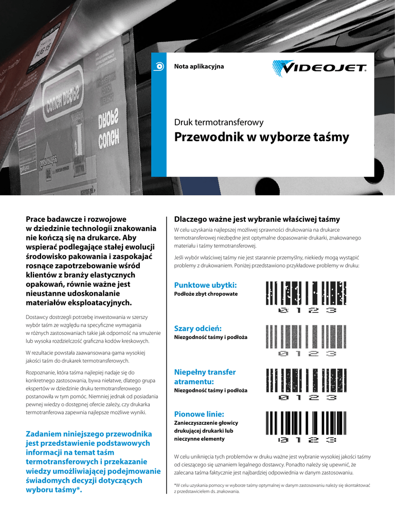 Nota aplikacyjna Druk termotransferowy Przewodnik w wyborze taśmy Prace badawcze i rozwojowe w dziedzinie technologii znakowania nie kończą się na drukarce. Aby wspierać podlegające stałej ewolucji środowisko pakowania i zaspokajać rosnące zapotrzebowanie wśród klientów z branży elastycznych opakowań, równie ważne jest nieustanne udoskonalanie materiałów eksploatacyjnych. Dostawcy dostrzegli potrzebę inwestowania w szerszy wybór taśm ze względu na specyficzne wymagania w różnych zastosowaniach takie jak odporność na smużenie lub wysoka rozdzielczość graficzna kodów kreskowych. Dlaczego ważne jest wybranie właściwej taśmy W celu uzyskania najlepszej możliwej sprawności drukowania na drukarce termotransferowej niezbędne jest optymalne dopasowanie drukarki, znakowanego materiału i taśmy termotransferowej. Jeśli wybór właściwej taśmy nie jest starannie przemyślny, niekiedy mogą wystąpić problemy z drukowaniem. Poniżej przedstawiono przykładowe problemy w druku: Punktowe ubytki: Podłoże zbyt chropowate Szary odcień: Niezgodność taśmy i podłoża W rezultacie powstała zaawansowana gama wysokiej jakości taśm do drukarek termotransferowych. Rozpoznanie, która taśma najlepiej nadaje się do konkretnego zastosowania, bywa niełatwe, dlatego grupa ekspertów w dziedzinie druku termotransferowego postanowiła w tym pomóc. Niemniej jednak od posiadania pewnej wiedzy o dostępnej ofercie zależy, czy drukarka termotranferowa zapewnia najlepsze możliwe wyniki. Zadaniem niniejszego przewodnika jest przedstawienie podstawowych informacji na temat taśm termotransferowych i przekazanie wiedzy umożliwiającej podejmowanie świadomych decyzji dotyczących wyboru taśmy*. Niepełny transfer atramentu: Niezgodność taśmy i podłoża Pionowe linie: Zanieczyszczenie głowicy drukującej drukarki lub nieczynne elementy W celu uniknięcia tych problemów w druku ważne jest wybranie wysokiej jakości taśmy od cieszącego się uznaniem legalnego dostawcy. Ponadto należy się upewnić, że zalecana taśma faktycznie jest najbardziej odpowiednia w danym zastosowaniu. *W celu uzyskania pomocy w wyborze taśmy optymalnej w danym zastosowaniu należy się skontaktować z przedstawicielem ds. znakowania. Jak rozpoznać właściwą taśmę Zwykle na taśmy TTO są nanoszone dwojakie warstwy atramentu: mieszana woskowo-żywiczna lub tylko żywiczna. Wybór zależy od zastosowania. Powlekanie woskowo-żywiczne • Taśma ogólnego przeznaczenia do wszystkich zakresów prędkości. • Dobra odporność na smużenie i zarysowania. • Dobra wytrzymałość cieplna sięgająca 100°C. • Dobry zakres dostępnych kolorów. • Dobra jakość druku w całym zakresie prędkości. Powlekanie żywiczne • Znakomita odporność na smużenie i zarysowania. • Znakomita wytrzymałość cieplna sięgająca 250°C. • Mniejszy zakres dostępnych kolorów w porównaniu z powlekaniem woskowo-żywicznym. • Tylko zastosowania z niską prędkością. • Lepsza jakość druku w stosunku do taśmy woskowo-żywicznej. Uwaga: taśmy zawierające tylko woskową warstwę atramentu nie nadają się do stosowania z TTO. Zalety technologii powlekania na odwrotnej stronie Użytkownicy urządzeń TTO często napotykają problemy w przypadku niekorzystania z dobrej taśmy termotransferowej. Taśmy o taniej konstrukcji mogą się przyczyniać do szybkiego zużywania się głowic drukujących z powodu braku smarowania, folia może ulec zapłonowi, gdy materiał ma niską wytrzymałość cieplną, mogą się gromadzić ładunki elektrostatyczne, a transfer atramentu może być niedostateczny na skutek słabej przewodności cieplnej. Cechą wszystkich taśm firmy Videojet jest zaawansowana technologia powlekania na odwrotnej stronie mająca na celu przeciwdziałanie tym problemom. Do ochrony głowicy drukującej i wydłużenia jej żywotności nanoszona jest powłoka oparta na silikonie bez właściwości ściernych. Ta technologia pomaga także w rozpraszaniu ładunków elektrostatycznych (które mogą prowadzić do uszkodzenia głowic drukujących i obniżenia jakości znakowania), a jednocześnie zapewnia znakomity przewodnik cieplny do transferu atramentu. Powłoka na odwrotnej stronie Nośnik Warstwy atramentu Ultra Bardzo wydajna taśma do zastosowań ogólnych Zastosowania: Słone/aromatyzowane przekąski w torebkach, mięso i drób, zawijane wyroby cukiernicze, batoniki i orzechy. Taśmy na wszystkie potrzeby Standard (standardowa) Taśmy termotransferowe firmy Videojet oferują wysoką efektywność, znakomitą jakość druku i nadzwyczajną trwałość. Super Standard (superstandardowa) Rozwiązanie ogólnego przeznaczenia do średnich prędkości Zastosowania: solone/aromatyzowane zakąski w torebkach, świeże i mrożone artykuły spożywcze takie jak warzywa, mięso i drób, owoce suszone i słodycze. Zapewnia lepsze przywieranie i nadzwyczajną trwałość, zalecana w przypadku częstych zmian typu folii i prędkości. Zastosowania: etykiety błyszczące, etykiety farmaceutyków i odżywek, kosmetyki, listy składników i wartości odżywczych. Nasz bogaty asortyment obejmuje taśmy opracowane specjalnie pod kątem wymagań druku na elastycznych opakowaniach. Premium Najwyższy stopień przywierania, dobrze nadaje się do zastosowań wymagających wytrzymałości na temperaturę i substancje chemiczne. Zastosowania: opakowania błyszczące, urządzenia medyczne, etykiety farmaceutyków, artykułów motoryzacyjnych i ekskluzywnych kosmetyków. Extreme Temperature (do skrajnych temperatur) Optymalny wybór w przypadku zastosowań z napełnianiem na gorąco w temperaturze 82–90°C. Zastosowania: świeżo gotowane zupy i opakowania napełniane gorącymi produktami. Taśma idealna w danym zastosowaniu Videojet oferuje szeroki asortyment taśm i dlatego warto porównać nasze taśmy termotransferowe, aby przekonać się, która z nich ściśle spełnia określone wymagan