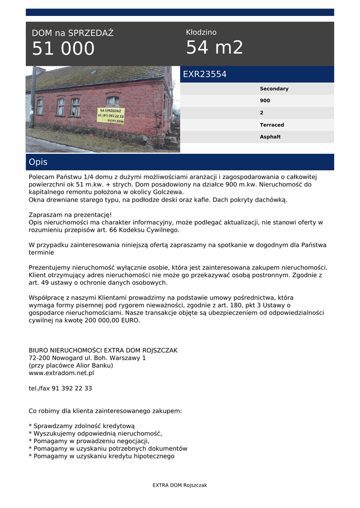 Kłodzino DOM na SPRZEDAŻ 54 m2 51 000 EXR23554 Secondary 900 2 Terraced Asphalt Opis Polecam Państwu 1/4 domu z dużymi możliwościami aranżacji i zagospodarowania o całkowitej powierzchni ok 51 m.kw. + strych. Dom posadowiony na działce 900 m.kw. Nieruchomość do kapitalnego remontu położona w okolicy Golczewa. Okna drewniane starego typu, na podłodze deski oraz kafle. Dach pokryty dachówką. Zapraszam na prezentację! Opis nieruchomości ma charakter informacyjny, może podlegać aktualizacji, nie stanowi oferty w rozumieniu przepisów art. 66 Kodeksu Cywilnego. W przypadku zainteresowania niniejszą ofertą zapraszamy na spotkanie w dogodnym dla Państwa terminie Prezentujemy nieruchomość wyłącznie osobie, która jest zainteresowana zakupem nieruchomości. Klient otrzymujący adres nieruchomości nie może go przekazywać osobą postronnym. Zgodnie z art. 49 ustawy o ochronie danych osobowych. Współpracę z naszymi Klientami prowadzimy na podstawie umowy pośrednictwa, która wymaga formy pisemnej pod rygorem nieważności, zgodnie z art. 180, pkt 3 Ustawy o gospodarce nieruchomościami. Nasze transakcje objęte są ubezpieczeniem od odpowiedzialności cywilnej na kwotę 200 000,00 EURO. BIURO NIERUCHOMOŚCI EXTRA DOM ROJSZCZAK 72-200 Nowogard ul. Boh. Warszawy 1 (przy placówce Alior Banku) www.extradom.net.pl tel./fax 91 392 22 33 Co robimy dla klienta zainteresowanego zakupem: * * * * * Sprawdzamy zdolność kredytową Wyszukujemy odpowiednią nieruchomość, Pomagamy w prowadzeniu negocjacji, Pomagamy w uzyskaniu potrzebnych dokumentów Pomagamy w uzyskaniu kredytu hipotecznego EXTRA DOM Rojszczak * Współpracujemy z kancelariami notarialnymi, geodetami Korzystając z naszych usług oszczędzasz swój czas, a także zyskujesz pewność, że Twoja transakcja zostanie przeprowadzona z należytą starannością, w sposób profesjonalny i co najważniejsze - BEZPIECZNY. Nr licencji pośredników: 21317, 21318 Marcin Rojszczak tel. 508 312 261 tel. (91) 392 22 33 email: [email protected] EXTRA DOM Rojszczak Powered by TCPDF (www.tcpdf.org)