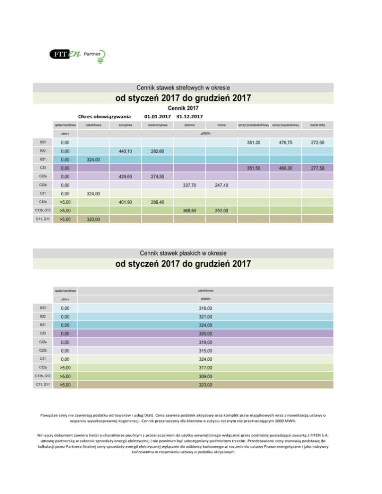 Cennik stawek strefowych w okresie od styczeń 2017 do grudzień 2017 Cennik 2017 Okres obowiązywania opłata handlowa całodobowa szczytowa 01.01.2017 31.12.2017 pozaszczytowa dzienna 0,00 B22 0,00 B21 0,00 C23 0,00 C22a 0,00 C22b 0,00 C21 0,00 C12a >5,00 C12b, G12 >5,00 C11, G11 >5,00 szczyt przedpołudniowy szczyt popołudniowy reszta doby zł/MWh zł/m-c B23 nocna 440,10 351,20 476,70 272,60 351,50 466,30 277,50 282,60 324,00 429,60 274,50 337,70 247,40 368,50 252,00 324,00 401,90 286,40 323,00 Cennik stawek płaskich w okresie od styczeń 2017 do grudzień 2017 opłata handlowa całodobowa zł/m-c zł/MWh B23 0,00 316,00 B22 0,00 321,00 B21 0,00 324,00 C23 0,00 320,00 C22a 0,00 319,00 C22b 0,00 315,00 C21 0,00 324,00 C12a >5,00 317,00 C12b, G12 >5,00 309,00 C11, G11 >5,00 323,00 Powyższe ceny nie zawierają podatku od towarów i usług (Vat). Cena zawiera podatek akcyzowy oraz komplet praw majątkowych wraz z nowelizacją ustawy o wsparciu wysokosprawnej kogeneracji. Cennik przeznaczony dla klientów o zużyciu rocznym nie przekraczającym 1000 MWh. Niniejszy dokument zawiera treści o charakterze poufnym z przeznaczeniem do użytku wewnętrznego wyłącznie przez podmioty posiadające zawartą z FITEN S.A. umowę partnerską w zakresie sprzedaży energii elektrycznej i nie powinien być udostępniany podmiotom trzecim. Przedstawione ceny stanowią podstawę do kalkulacji przez Partnera finalnej ceny sprzedaży energii elektrycznej wyłącznie do odbiorcy końcowego w rozumieniu ustawy Prawo energetyczne i jako nabywcy końcowemu w rozumieniu ustawy o podatku akcyzowym