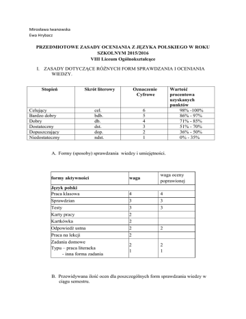 Mirosława Iwanowska Ewa Hrybacz PRZEDMIOTOWE ZASADY OCENIANIA Z JĘZYKA POLSKIEGO W ROKU SZKOLNYM 2015/2016 VIII Liceum Ogólnokształcące I. ZASADY DOTYCZĄCE RÓŻNYCH FORM SPRAWDZANIA I OCENIANIA WIEDZY. Stopień Skrót literowy Oznaczenie Cyfrowe cel. bdb. db. dst. dop. ndst. 6 5 4 3 2 1 Celujący Bardzo dobry Dobry Dostateczny Dopuszczający Niedostateczny Wartość procentowa uzyskanych punktów 98% -100% 86% - 97% 71% - 85% 51% - 70% 36% - 50% 0% - 35% A. Formy (sposoby) sprawdzania wiedzy i umiejętności. formy aktywności waga waga oceny poprawionej Język polski Praca klasowa 4 4 Sprawdzian 3 3 Testy 3 3 Karty pracy 2 Kartkówka 2 Odpowiedź ustna 2 Praca na lekcji 2 Zadania domowe Typu – praca literacka - inna forma zadania 2 1 2 2 1 B. Przewidywana ilość ocen dla poszczególnych form sprawdzania wiedzy w ciągu semestru. formy aktywności ilość ocen Język polski Praca klasowa 3 Sprawdzian 3 Testy 3 Karty pracy 2 Kartkówka 2 Odpowiedź ustna 2 Praca na lekcji 2 Zadania domowe 3 Zadania typu maturalnego 2 II. WYMAGANIA NA OCENY Na ocenę dopuszczającą uczeń potrafi: Odbiór wypowiedzi i wykorzystanie zawartych w nich informacji Czytanie i słuchanie: – Odtworzyć informacje sformułowane wprost – Odczytać sens fragmentów (zdań, grupy zdań, akapitów) – Wyodrębnić główną myśl całego tekstu – Wskazać w tekście retorycznym najważniejsze środki językowe służące przekonywaniu Samokształcenie i docieranie do informacji: – Wybrać podstawowe teksty literackie służące realizacji zadanego tematu, posługując się wybranym źródłem informacji – Podjąć próbę znalezienia literatury przedmiotu służącej realizacji zadanego tematu Świadomość językowa: – Wymienić nadawcę, odbiorcę i komunikat jako trzy najważniejsze elementy aktu komunikacji językowej – Odróżnić od siebie teksty pełniące funkcję informatywną, impresywną i ekspresywną – Objaśnić istotę znaku – Posługiwać się pojęciem archaizm – Objaśnić istotę związku frazeologicznego – Odróżnić od siebie synonimy, homonimy i antonimy – Posługiwać się pojęciem styl Analiza i interpretacja tekstów kultury Wstępne rozpoznanie i analiza: – Przyporządkować epoce nazwiska pisarzy wskazanych w Podstawie programowej oraz wymienić ich dzieła – Przyporządkować autorowi tytuły i głównych bohaterów utworów literackich wskazanych w Podstawie programowej – Określić tematykę utworów literackich wskazanych w Podstawie programowej – Odróżnić od siebie tekst liryczny, epicki, dramatyczny – Posługiwać się pojęciami: podmiot liryczny, adresat liryczny, narrator, dialog, monolog – Wskazać podstawowe cechy najważniejszych dla omawianych epok gatunków literackich: tragedia, hymn, pieśń, tren, komedia, sonet, satyra, powieść epistolarna – Nazwać najważniejsze prądy umysłowe, filozoficzne i artystyczne omawianych epok (teocentryzm, humanizm, sarmatyzm, poezja metafizyczna, klasycyzm, racjonalizm, sentymentalizm) oraz wskazać ich cechy – Wskazać w dziełach literackich zalecanych przez Podstawę programową realizację wymienionych wyżej prądów – Streścić główne wątki utworów epickich i dramatycznych wskazanych w Podstawie programowej – Scharakteryzować głównych bohaterów literackich utworów epickich i dramatycznych wskazanych w Podstawie programowej – Rozpoznać najważniejsze środki i zabiegi stylistyczne w utworach literackich omawianych epok (epitet, metafora, porównanie, apostrofa, pytanie retoryczne) – Zanalizować utwory wskazane w Podstawie programowej, uwzględniając najważniejsze kategorie opisu (podmiot / adresat liryczny, narrator, świat przedstawiony) Interpretacja i wartościowanie: – Określić przybliżone ramy chronologiczne antyku, średniowiecza, renesansu, baroku, oświecenia i preromantyzmu – Objaśnić znaczenie nazw epok literackich: antyk, średniowiecze, renesans, barok, oświecenie, preromantyzm – Odczytać znaczenie podstawowych symboli w dziełach literackich wskazanych w Podstawie programowej Tworzenie własnych wypowiedzi ustnych i pisemnych – Posługiwać się komunikatywnym językiem w mowie i w piśmie – Wypowiadać się w mowie i w piśmie na zadany temat, w sposób świadczący o co najmniej częściowym zrozumieniu tematu – Odnieść się w wypowiedzi do tekstów literackich – Podjąć próbę skomponowania wypowiedzi składającej się ze wstępu, rozwinięcia i zakończenia – Samodzielnie prowadzić zeszyt przedmiotowy – Zrealizować przynajmniej połowę obowiązkowych zadań przewidzianych przez nauczyciela Dopuszczalne: konieczność pomocy ze strony nauczyciela podczas realizacji zadań, ubogi komentarz, stereotypowość sądów, streszczanie utworu zamiast analizy i interpretacji, drobne błędy rzeczowe, błędy kompozycyjne (np. brak proporcji między poszczególnymi elementami pracy, brak logicznej spójności tekstu, brak wstępu lub zakończenia), błędy stylistyczne, składniowe, frazeologiczne, fleksyjne, interpunkcyjne i ortograficzne. Na ocenę dostateczną uczeń potrafi to, co na ocenę dopuszczającą, a ponadto: Odbiór wypowiedzi i wykorzystanie zawartych w nich informacji Czytanie i słuchanie: – Określić funkcję środków językowych w tekście retorycznym – Rozpoznać ironię w tekście – Sformułować tezę tekstu bądź fragmentu tekstu – Podać argumenty na rzecz tezy – Odróżnić argumenty od przykładów oraz tezę od hipotezy – Rozpoznać relacje kompozycyjne między poszczególnymi fragmentami (akapitami) tekstu – Oddzielić informacje od opinii – Wskazać przyczyny i skutki Samokształcenie i docieranie do informacji: – Wyszukać podstawowe pozycje z literatury przedmiotu służącej realizacji zadanego tematu – Samodzielnie korzystać ze słowników i leksykonów Świadomość językowa: – Rozpoznać w tekście sześć elementów aktu komunikacji językowej – Określić