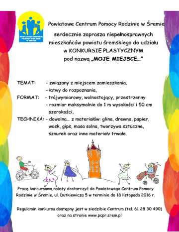 Powiatowe Centrum Pomocy Rodzinie w Śremie serdecznie zaprasza niepełnosprawnych mieszkańców powiatu śremskiego do udziału w KONKURSIE PLASTYCZNYM pod nazwą „MOJE MIEJSCE…” TEMAT: - związany z miejscem zamieszkania, - łatwy do rozpoznania, FORMAT: - trójwymiarowy, wolnostojący, przestrzenny - rozmiar maksymalnie do 1 m wysokości i 50 cm szerokości, TECHNIKA: - dowolna… z materiałów: glina, drewno, papier, wosk, gips, masa solna, tworzywa sztuczne, sznurek oraz inne materiały trwałe. Pracę konkursową należy dostarczyć do Powiatowego Centrum Pomocy Rodzinie w Śremie, ul. Dutkiewicza 5 w terminie do 18 listopada 2016 r. Regulamin konkursu dostępny jest w siedzibie Centrum (tel. 61 28 30 490) oraz na stronie www.pcpr.srem.pl