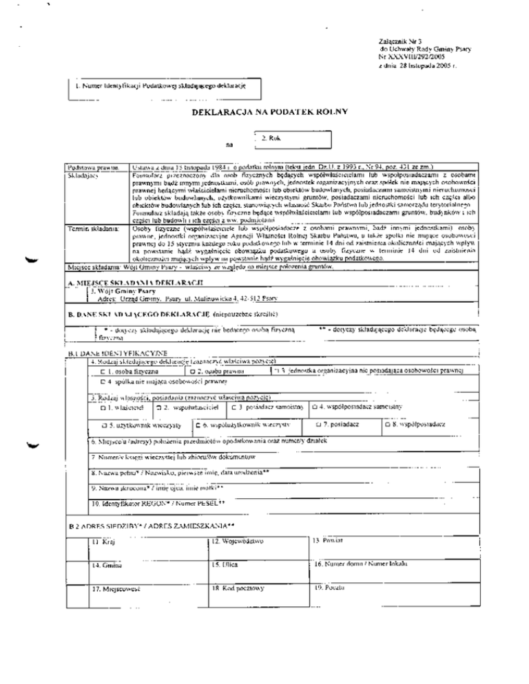 Zalgcznik Nr 3 ■In Mchn^v Radv GmirtV F"i*r> Jriiii L Numer LiknLjlik.i4.ji <krkl.ii Kj^ DEKLARACJA iNA PUDAI EK ROLIMY 2 F!uk E. D^^T"Sk^ inu^ VC.O t>h.KI.AR\r.ir^ (mtptiuzcbr.c ikrcjhv f;7' l 'n,i 1 H.L |3ANt "L1ENJ YFJkACYJXE Ij^ma pi)^C. C I n^oba □ 2. firk me C 4 ipulLim? ,Uh;kh;3 \Tf2 G4 •-.jpuJw posiadacz n'imcr/j poli\rfrii 7 N'niTifr,.1 k'KT wieC7\^!e| lub /hi,i[U/^rt dtfl Na/.u jkrm.oiid" /111111: uji-lI nine 10 E? 12 ^V 14 Gniriui 37. [ilica lfi Kh-i Pn"i.n 'linif^ dfimii' D & C. 1 koestTa dcklaracii rocznej t>. DANEmVnfZ^CF PRZEnMlOTOW OPODA1 KQW \N1 V Mas. ^C7n«*7W0|BIO Siawlra 7 1 ^i^i'i^Ezt]]]]]^ yjuiULl Vr htklarach 1 ?yczn\ch ^Dd-IC^JJ HU1^ )rzflk?enii' na me |.*od[e£ajave ■vymkajgcc z iivcliczcnLU nahu Pud dzi.il.iiii i 3 if"' mo^cjjy lub Inne jrjcl i cm i1» t ^ il.gr s pccia][ivni! 2 1 ^jcljlku rnlnc^n iv jutehczc- pricliLien Km f bLdjT.kO" Wymilr hckuua i a 6 r.runn1 nrnC J Tl Ilia Illb Iva l*b \ \l \lt SulIi, 1 II II In Illb HlL I v 1j \ \[ \l£ LzjLkiiKtanr 1 11 Til IV V VI vr* ^II1Tw™* L ■i uih in 1 nib Its IV Kb y \1 Viz firunty1 pod u] ^jijljiOEir r\b ml iv pji. j> c) enniEv pod nic^arvbLnn^ini Boivj i l^runly zmJrzcwionc polrfonc na IK 11 Ills III IV VI Vi! z^ofnicri) t ACHGWOLMW [pud at. njiJii]|. kldi^ i 3LHLi4rriLl[r[[ ];runLijiv i^uljiionv lIi u-j.u pizepispr^wji - r |.itifp,o rvinln a 'Ifpijif "\olnifinn F VLCIW PODATKl ROLNVM 1 j. I'lulu nab^cia IjIj pi 2 ".jet n w odgrunt6w iagujpodaiowanif o ninViu i 2 ni..i:;UL>|rn: i Lnnc ----- Kj/j:eii t, i vrj'N^ k\iot\ pr>i>Aikl Fu Vr nla pndatki] K"^n li.^ k.-ot i D - b1 ,, OSOD^ RtPREZLMLJACLJ SKLAL H 2L :™ii mi«iar- -1 Podpis (picczftj ;kladaji:cso ■' rokj : L^agi wrji 11 2b Idcntytlkacoi 1 usttnvi i Unit' 29 yierpma i9t? t. - Orffynnqa padatkon-a (letaijtttnolliy: D^U. Z 2Q05 T. i"->5, pCL 6» ie lit-'). pttdltaWl crrtHfathOtoairia, ftH'iVl podati^. Dltierkl in zwla^. opl/tly prvftr/rstt'.yjni1, oprocptrfawfitm' nattpfat nta lt/gaftfi-i* iifatMkttrtt zaitk^fgfa i'\- dn fnAayr-h ztotyrlt. w ten ipotfb, t2 koftanvki kwvl wyitotzmx mnug nit 5U kv/otwyrtoszqce *W J vi^cej grarzypwtw}in" ir^1 ifaj"'!"vfh ililyiU cjjiekuc>jn>rrL ■■ jJiumiL.lr.iL.ji (D^ U l Wl i N"^ pnd'U'iic an la u-;ia^-y t. dnia [7 c?Hr*ca 1996 C 0 j. poin trn 1 r tj;^.i dekkiiiicjj jl.inun1] fjodsW^f ill' lifilu Ni 16 yOi I'll