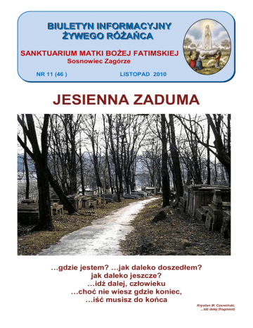 BIULETYN INFORMACYJNY ŻYWEGO RÓŻAŃCA SANKTUARIUM MATKI BOŻEJ FATIMSKIEJ Sosnowiec Zagórze NR 11 (46 ) LISTOPAD 2010 JESIENNA ZADUMA …gdzie jestem? …jak daleko doszedłem? jak daleko jeszcze? …idź dalej, człowieku …choć nie wiesz gdzie koniec, …iść musisz do końca Krystian M. Czerwiński, …Idź dalej (fragment) Droga Wspólnoto Żywego Różańca Spadające z drzew i wirujące na wietrze liście, mgliste poranki i wczesne wieczory bardzo szybko uświadomiły nam, że jesień jest już w pełni. Przyroda szykująca się do zimowego snu bardzo czytelnie przekazuje nam prawdę o przemijaniu. „Popatrz jak szybko mija czas” to słowa pięknej piosenki o ludzkim przemijaniu, które zmuszają do głębokiej refleksji i nad którymi warto się chwilę zamyślić. W listopadowe dni nasze myśli biegną przede wszystkim na cmentarne dróżki do naszych bliskich, którzy już zakończyli swoją ziemską wędrówkę wśród nas i udali się na spotkanie z Bogiem w Jego Królestwie. Uroczystość Wszystkich Świętych, która otwiera ten miesiąc, z wielką mocą przypomina nam cel naszego życia – osiągnięcie świętości, która jest nam zadana przez samego Boga: „Świętymi bądźcie, bo Ja jestem Święty”. Aby być świętym nie potrzeba spektakularnych czynów, a świętość to nie luksus dla wybranych, ale zadanie dla każdego z nas. Sługa Boży Jan Paweł II stale zachęcał do świętości. Poprzez liczne beatyfikacje i kanonizacje, na przykładach konkretnych osób, Ojciec Święty ukazywał, że osiągnięcie świętości jest realne dla zwykłego śmiertelnika. Przekonywał jednak głównie własnym życiem, zachęcał przykładem osobistym. Promieniowanie świętości cechowało cały Jego Pontyfikat, odczuwalne było w kontaktach z bliźnimi, w modlitwie, w pracy, w cierpieniu i w radości. Dlatego polecam lekturę opracowania opartego na nauczaniu Ojca Świętego Jana Pawła II – „Nie bójcie się iść drogą świętości” na str. 9 W drugim dniu listopada wspominamy Wszystkich Wiernych Zmarłych. W tym dniu poprzez naszą modlitwę pomagamy zwłaszcza tym, którzy potrzebują naszego wsparcia, przechodząc oczyszczenie z grzechów, aby mogli godnie stanąć przed Bogiem. Kościół nieustannie uczy nas troski o naszych bliskich po ich śmierci. Listopadowe wypominki czytane podczas nabożeństw różańcowych i ofiarowane owoce Mszy św. są nie tylko wspomnieniem zmarłych, ale gorącą modlitwą o dar zbawienia dla nich. Wspomnienie Wszystkich Wiernych Zmarłych jest również okazją aby przypomnieć sobie naukę o Czyśćcu, który jest wielkim darem i dobrodziejstwem ze strony Boga, ale który nam kojarzy się z męką i cierpieniem. Może zatem interesujące będą rady jak uniknąć czyśćca? – również na str. 9. 11 dzień listopada z kolei przypomina nam historię naszej Ojczyzny. Po raz 92. będziemy obchodzić rocznicę odzyskania niepodległości. Odzyskanie niepodległości przez Polskę po 123 latach zaborów stanowi jedno z najważniejszych wydarzeń w dziejach państwa polskiego. Był to akt historyczny wprowadzający Polskę po długim okresie nieobecności do grona suwerennych państw. Niech ta kolejna rocznica będzie dla nas okazją do szczególnej wdzięczności Bogu za dar wolności, a także za tych, którzy poświęcili swoją krew i życie za Najjaśniejszą Rzeczypospolitą. Dzisiaj, gdy cieszymy się wolnością wywalczoną przez naszych przodków, nasz patriotyzm i odpowiedzialność za dzień powszedni Polski bywają uśpione. Często narzekamy na to, co dzieje się wokół nas, na tych, którzy nami rządzą, ale kiedy przychodzi zdać egzamin z dojrzałości obywatelskiej, wówczas brakuje nas, naszego głosu czy też naszego sprzeciwu. Uczestnicząc w tym dniu we Mszy św. w intencji Ojczyzny módlmy się zwłaszcza o pomyślność i zgodę wśród Polaków. Kolejne dni listopada przybliżają nas nieuchronnie do zakończenia roku liturgicznego 2009/2010, który upływał pod hasłem „Bądźmy świadkami miłości”. 21 listopada jest ostatnią niedzielą roku liturgicznego i w Kościele obchodzona jest uroczystość Chrystusa Króla Wszechświata. Uroczystość ta jest ukoronowaniem przeżywanych w ciągu roku liturgicznego wydarzeń zbawczych. Wszystko bowiem ma swe dopełnienie w spotkaniu z Chrystusem, naszym Panem i Królem. Kolejna niedziela w dniu 28 listopada to I Niedziela Adwentu. Początek nowego roku liturgicznego który koncentrować się będzie wokół tematu: „W komunii z Bogiem”. Po okresie zwykłym przychodzi czas Adwentu, czas radosnego oczekiwania na przyjście Pana. Wsłuchując się w czytania adwentowe uświadamiać sobie będziemy sens nawoływań proroka Izajasza. Za słowami Jana Chrzciciela po raz kolejny spróbujemy prostować ścieżki w naszych sercach by były gotowe na spotkanie nadchodzącego Pana. W listopadzie polecając się opiece i wstawiennictwu Matki Bożej Miłosierdzia wspierajmy się darem modlitwy różańcowej i módlmy się w następujących intencjach: INTENCJE MODLITEWNE Papieskie Intencje Apostolstwa Modlitwy Ogólna: Aby ofiary narkomanii i wszystkich innych form uzależnienia, przy wsparciu wspólnoty chrześcijańskiej, znalazły w mocy Boga Zbawiciela siłę potrzebną do radykalnej odmiany życia. Misyjna: Aby Kościoły Ameryki Łacińskiej dalej prowadziły misję kontynentalną, której inicjatorami są tamtejsi biskupi, wiążąc ją z powszechnym zadaniem misyjnym ludu Bożego. Intencje Parafialne Módlmy się: o dar nieba dla zmarłych kapłanów z naszej diecezji - w sposób szczególny dla śp. księdza Biskupa Adama Śmigielskiego, naszego pierwszego Ordynariusza oraz dla śp. ks. kan. Stanisława Wyganowskiego, który posługiwał w naszym Sanktuarium; o łaskę wiecznej szczęśliwości dla zmarłych członków z naszej wspólnoty Żywego Różańca – Zofii Wiśniewskiej, Anieli Pacek, Władysławy Musialik, Otylii Woźniczko, Heleny