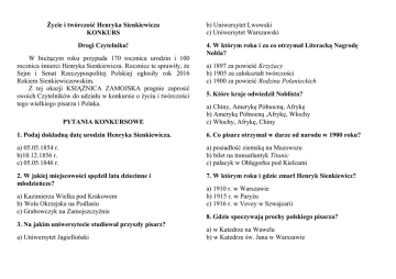 Życie i twórczość Henryka Sienkiewicza KONKURS Drogi Czytelniku! W bieżącym roku przypada 170 rocznica urodzin i 100 rocznica śmierci Henryka Sienkiewicza. Rocznice te sprawiły, że Sejm i Senat Rzeczypospolitej Polskiej ogłosiły rok 2016 Rokiem Sienkiewiczowskim. Z tej okazji KSIĄŻNICA ZAMOJSKA pragnie zaprosić swoich Czytelników do udziału w konkursie o życiu i twórczości tego wielkiego pisarza i Polaka. PYTANIA KONKURSOWE b) Uniwersytet Lwowski c) Uniwersytet Warszawski 4. W którym roku i za co otrzymał Literacką Nagrodę Nobla? a) 1897 za powieść Krzyżacy b) 1905 za całokształt twórczości c) 1900 za powieść Rodzina Połanieckich 5. Które kraje odwiedził Noblista? a) Chiny, Amerykę Północną, Afrykę b) Amerykę Północną ,Afrykę, Włochy c) Włochy, Afrykę, Chiny 1. Podaj dokładną datę urodzin Henryka Sienkiewicza. 6. Co pisarz otrzymał w darze od narodu w 1900 roku? a) 05.05.1854 r. b)10.12.1856 r. c) 05.05.1846 r. a) posiadłość ziemską na Mazowszu b) bilet na transatlantyk Titanic c) pałacyk w Oblęgorku pod Kielcami 2. W jakiej miejscowości spędził lata dziecinne i młodzieńcze? 7. W którym roku i gdzie zmarł Henryk Sienkiewicz? a) Kazimierza Wielka pod Krakowem b) Wola Okrzejska na Podlasiu c) Grabowczyk na Zamojszczyźnie 3. Na jakim uniwersytecie studiował przyszły pisarz? a) Uniwersytet Jagielloński a) 1910 r. w Warszawie b) 1915 r. w Paryżu c) 1916 r. w Vevey w Szwajcarii 8. Gdzie spoczywają prochy polskiego pisarza? a) w Katedrze na Wawelu b) w Katedrze św. Jana w Warszawie c) w Kościele św. Anny w Krakowie 9. Jakie powieści wchodzą w skład trylogii? a) Ogniem i mieczem, Potop, Pan Wołodyjowski b) Ogniem i mieczem, Krzyżacy, Potop c) Ogniem i mieczem, Sachem, Rodzina Połanieckich a) Litwos b) Wilnos c) Sienkos Imię i nazwisko 10. Wskaż nieprawidłową parę bohaterów sienkiewiczowskich? a) Baśka i Michał b) Helena i Bohun c) Selim i Hania 11. Wstaw słowa w znane cytaty... a) „Tak waćpannę miłuję, że .................... nie mogę.” b) „Mistrz Ulryk – rzekł pierwszy herold – wzywa twój majestat, panie, i księcia Witolda na bitwę śmiertelną i aby męstwo wasze, którego wam widać brakuje, podniecić, śle wam .................... miecze.” c) „Kończ waść! .................... oszczędź!” 12. Tytułowy Sachem jest synem ostatniego wodza plemienia? a) Szybkich Gepardów b) Zaklinaczy Deszczu c) Czarnych Wężów 13. Pod jakim pseudonimem tworzył Henryk Sienkiewicz? Adres do korespondencji Telefon do kontaktu Termin składania kuponów konkursowych upływa 30 września 2016 r. Kupony konkursowe można składać: • Książnica Zamojska – Wypożyczalnia Główna, 22-400 Zamość, ul. Kamienna 20 (tel. 84 627 11 54 wew. 24) • Filia Biblioteczna nr 1, 22-400 Zamość, ul. Wyszyńskiego 51A (tel. 84 639 87 19) • Filia Biblioteczna nr 2, 22-400 Zamość, ul. Wiejska 17 (tel. 84 627 28 56) • Filia Biblioteczna nr 3, 22-400 Zamość, ul. Brzozowa 26A (tel. 84 639 42 94) • Filia Biblioteczna nr 4, 22-400 Zamość, ul. Peowiaków 68A (tel. 84 639 36 17) • Filia Biblioteczna nr 5, 22-400 Zamość, ul. Jana Pawła II 10 (tel. 84 677 31 69) • Filia Biblioteczna nr 6, 22-400 Zamość, ul. B. Prusa 2 (tel. 84 639 67 99)